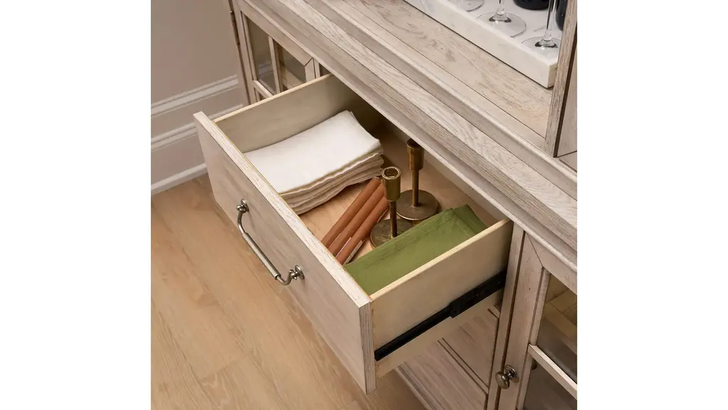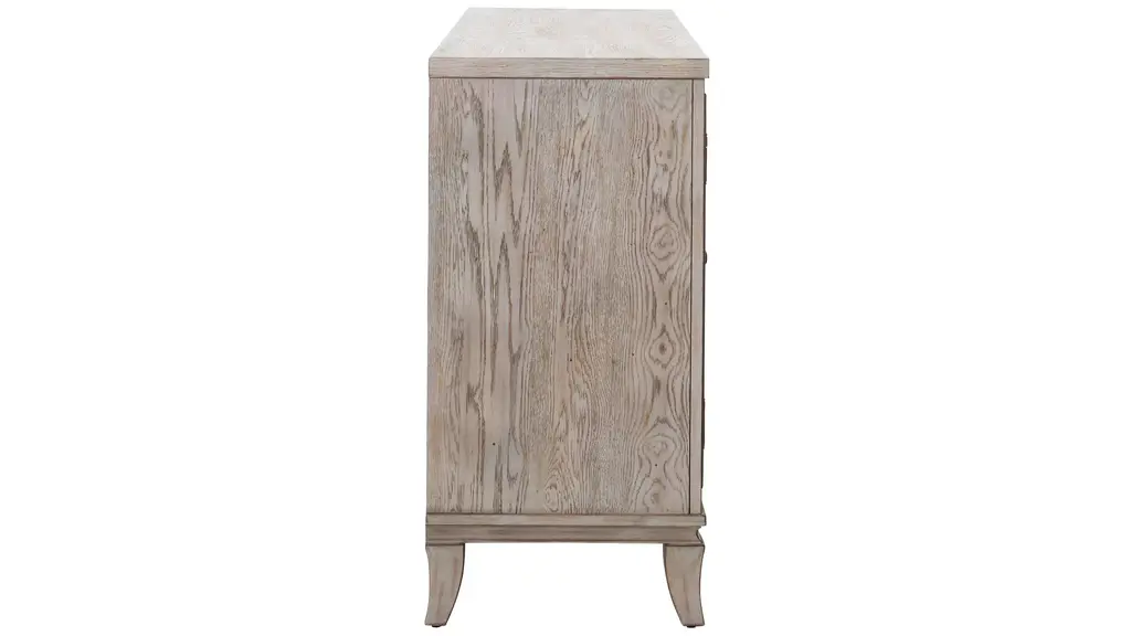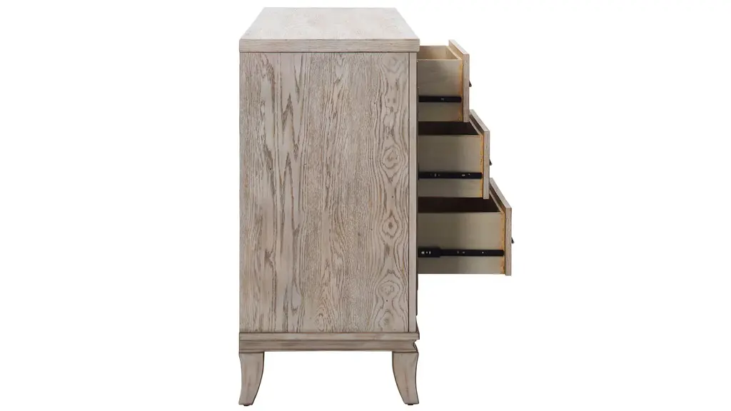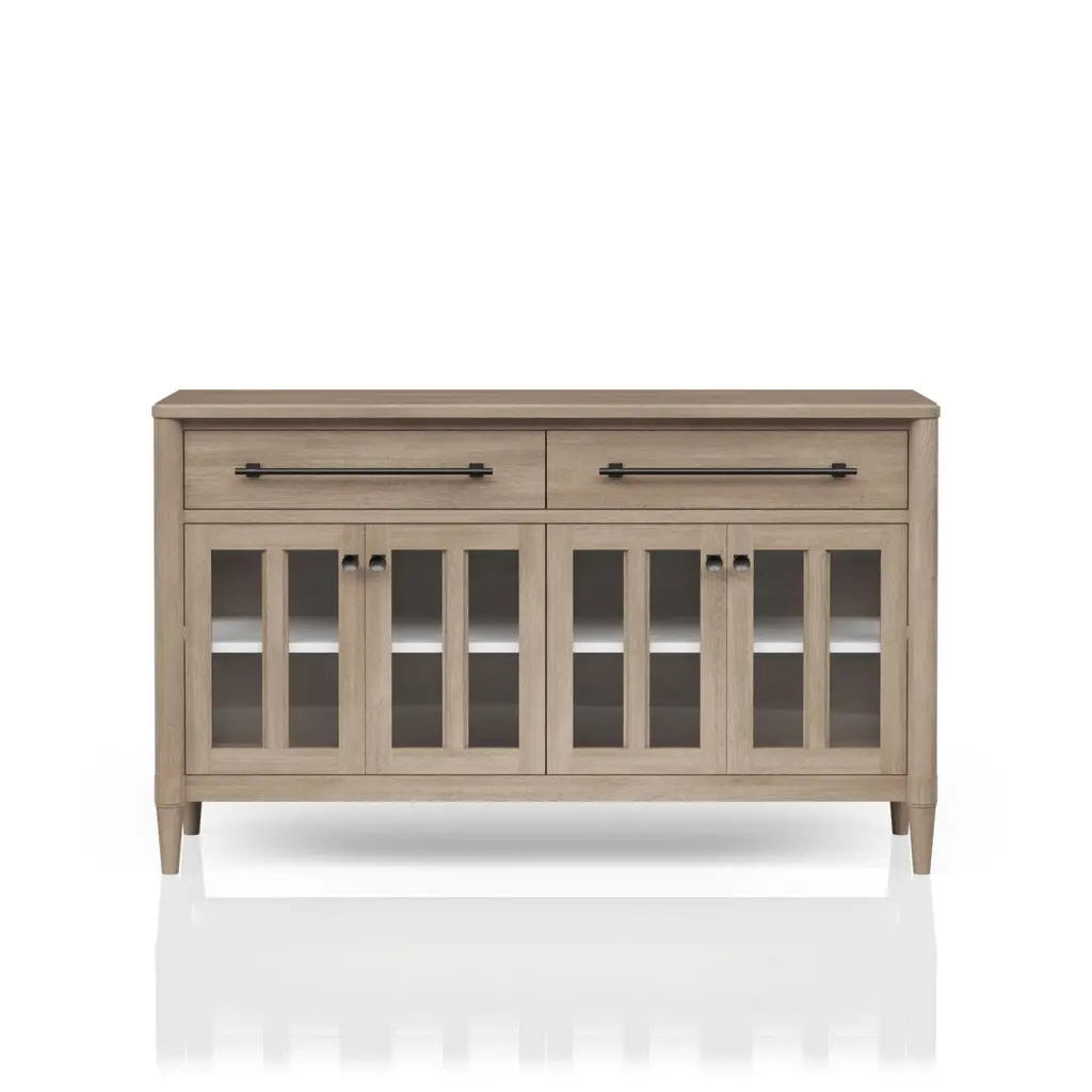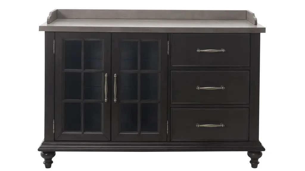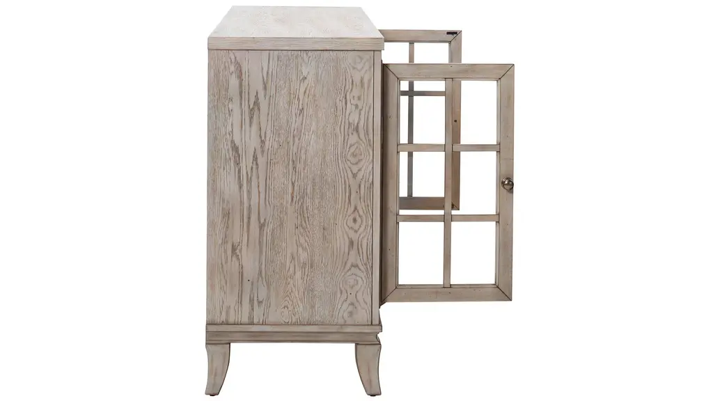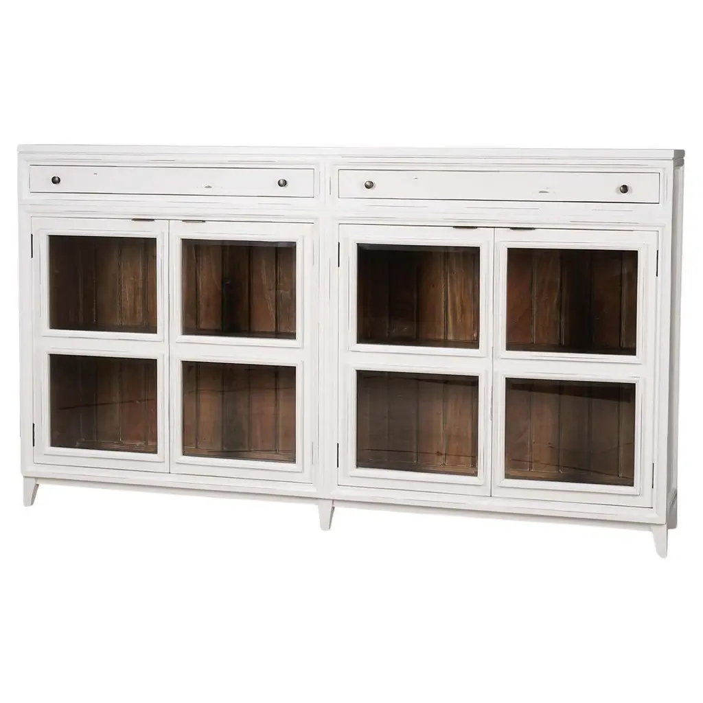 If you are seeking a beautiful and versatile dining room essential with the simplicity and warmth of the farmhouse style along with a sleek and modern sensibility, look no further than the Gabrielle buffet. With impeccable craftsmanship and an antiqued white finish, the spacious buffet features three drawers and two glass fronted storage cabinets with plenty of space for entertaining essentials.