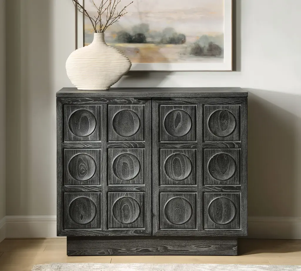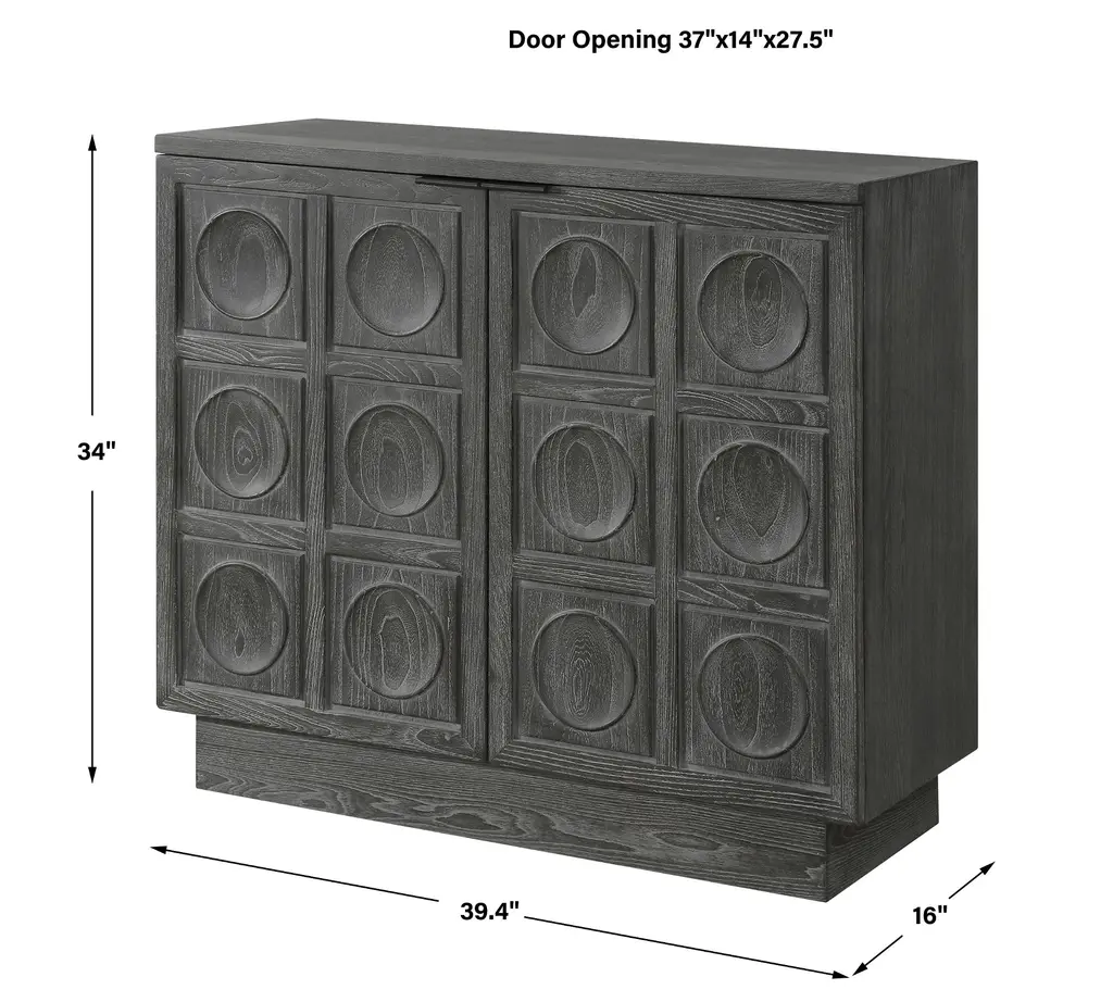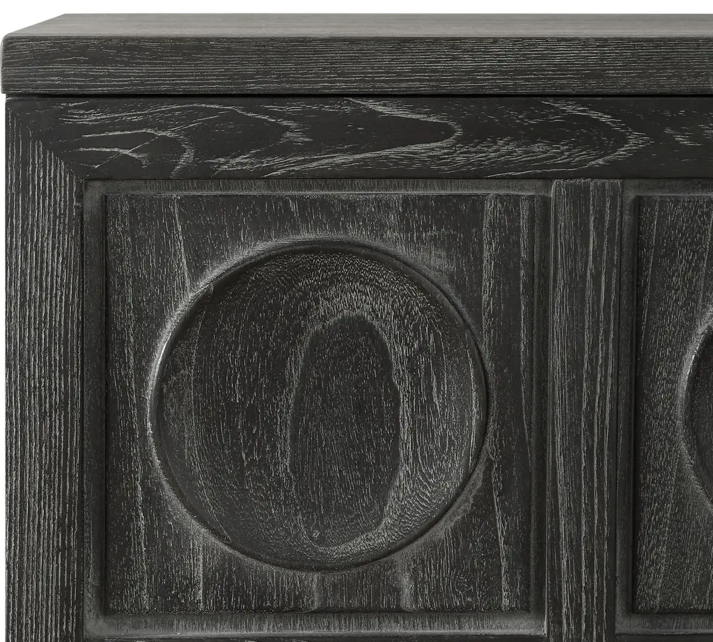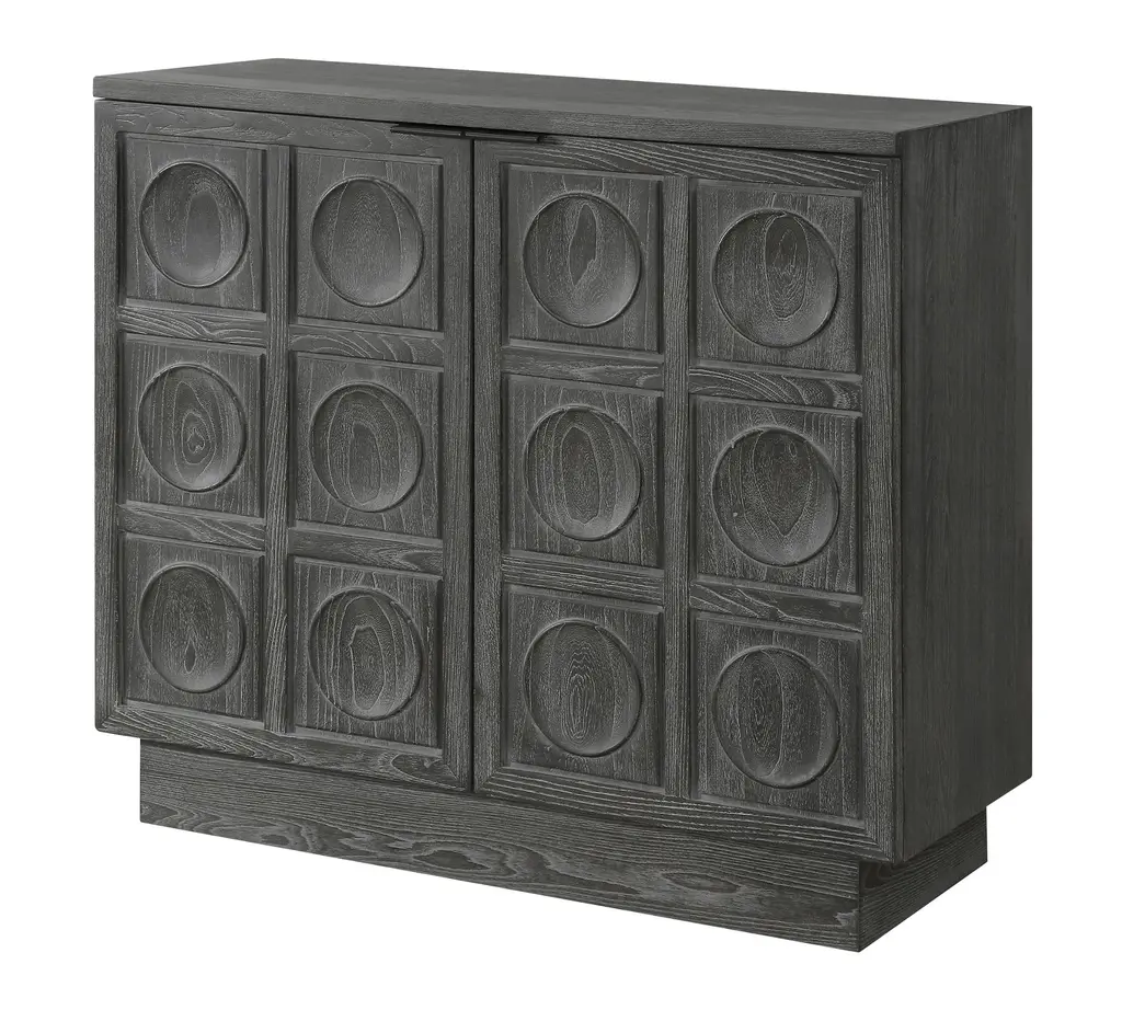 Crafted from solid elm and elm veneer, this elegant two-door cabinet showcases a carved circular design, The stain accentuates the natural beauty of the wood grain, adding depth and sophistication. Combining style with functionality, it's fitted with sleek, solid iron door pulls for a refined touch.