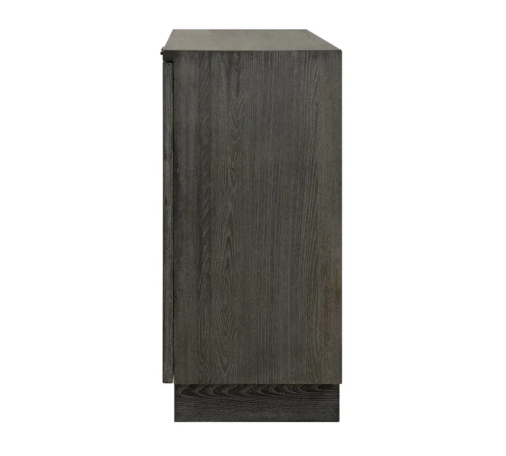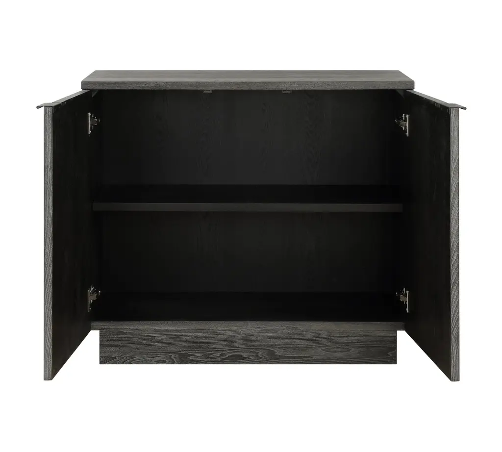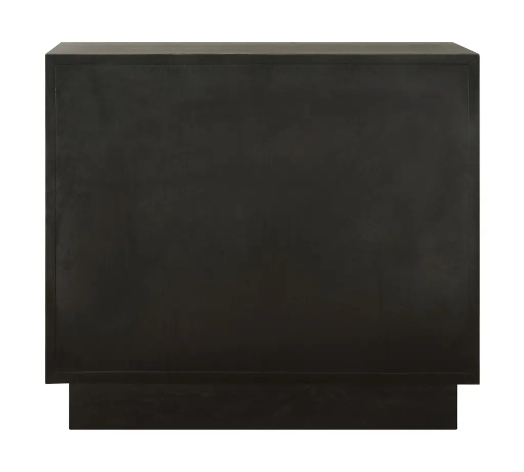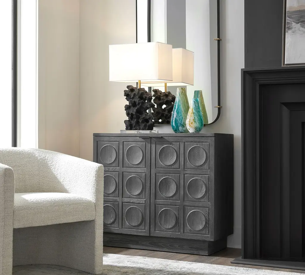 Crafted from solid elm and elm veneer, this elegant two-door cabinet showcases a carved circular design, The stain accentuates the natural beauty of the wood grain, adding depth and sophistication. Combining style with functionality, it's fitted with sleek, solid iron door pulls for a refined touch.