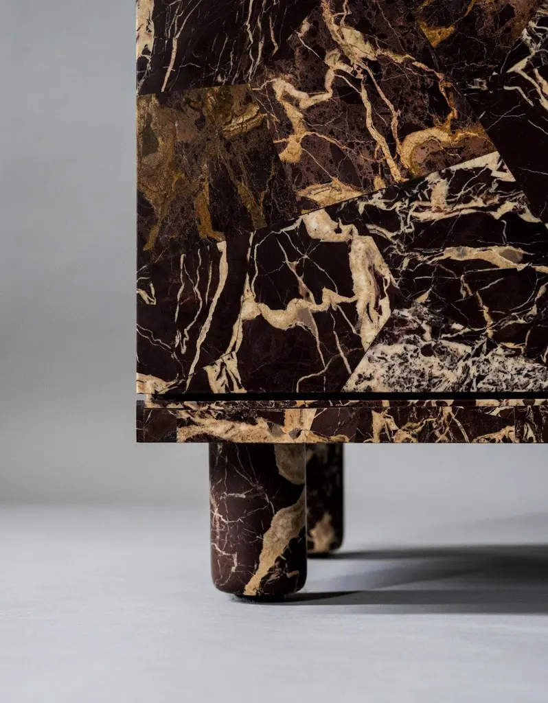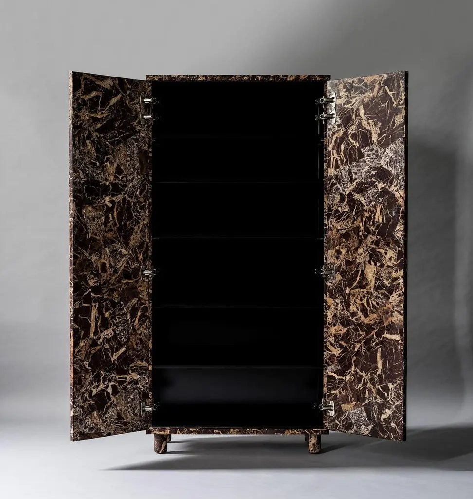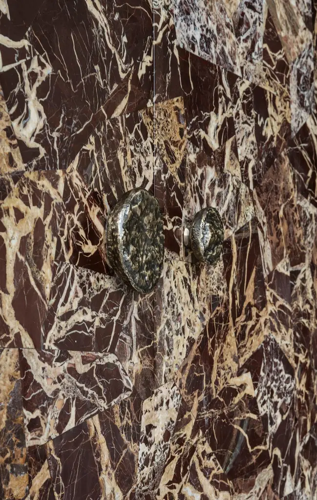 Part of our Gem Collection, the Gem Cabinet celebrates the beauty and variety of natural stone. The cabinet is fully encased in claret dolomite, its linearity of form contrasted with irregularly shaped hand-cast solid antique bronze handles. A sleek interior finished in black lacquer with adjustable shelving completes the piece.