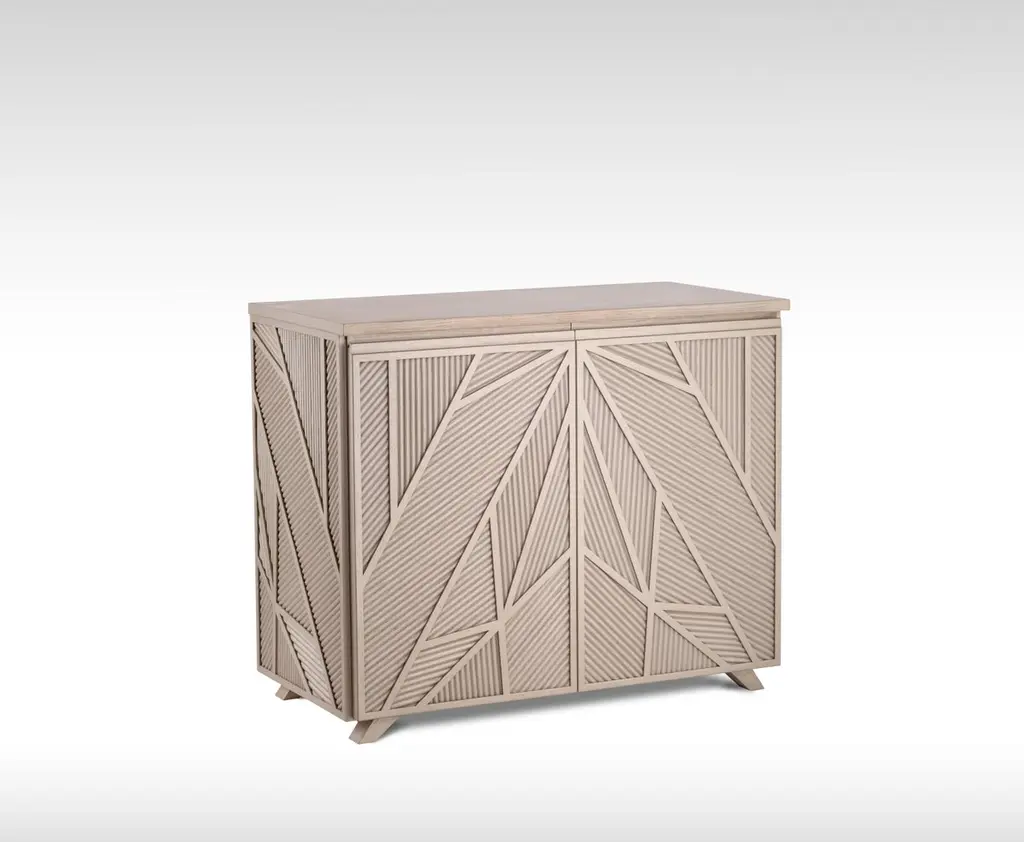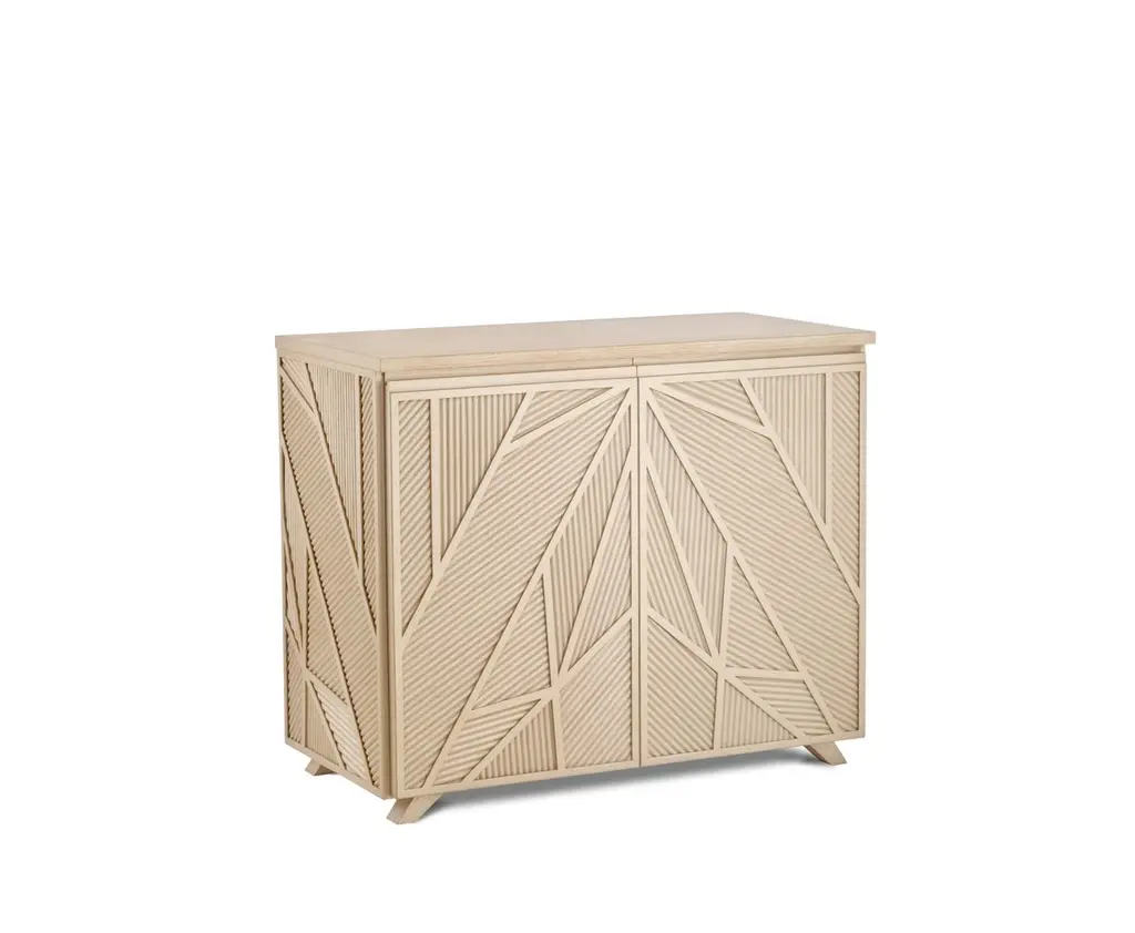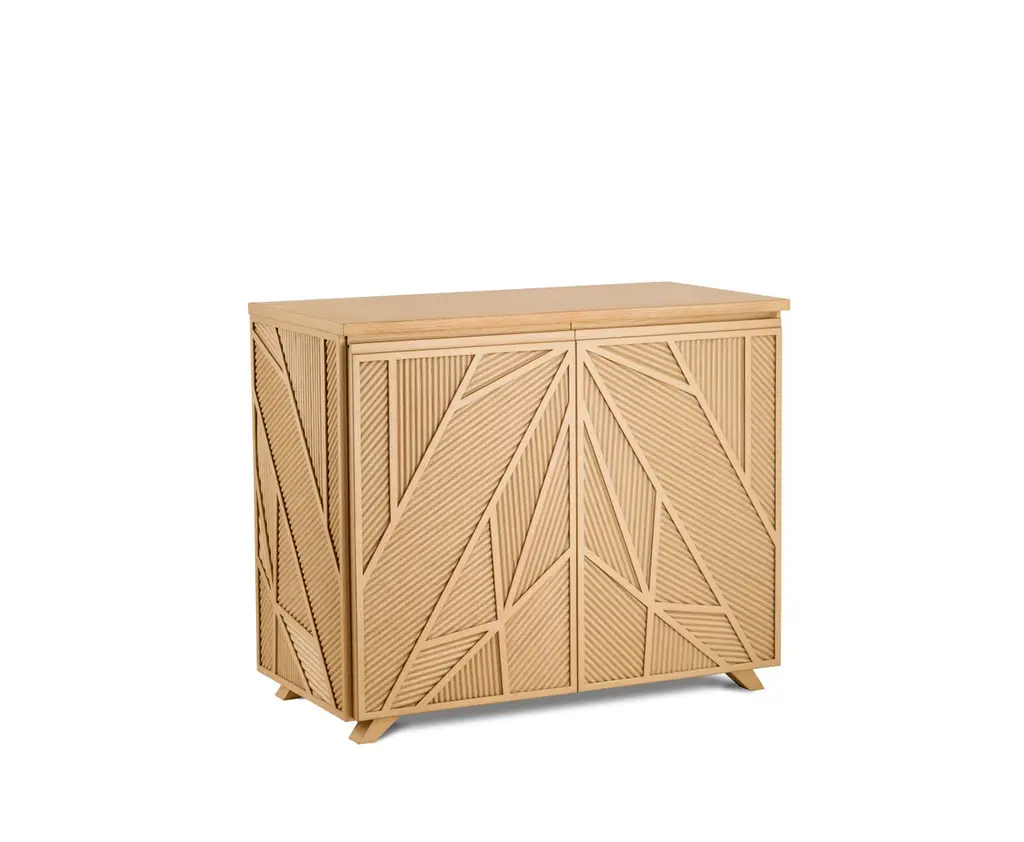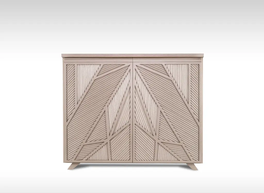 Geometric Oak Sticks Cabinet Inspired from Ancient Egypt Use of Palm Branches. Our unique Cool Palm cabinet is made of stained oak wood sticks manifesting the use of woven palms in the Egyptian heritage. The dynamic pattern of the cabinet will surely give life to your room with its organic geometric pattern. Feeling the cabinet’s intertwined texture is highly irresistible as the eye-catching pattern will marvel your senses because it looks as good as it feels! Comes in three colors; stained gold, stained silver and a natural oak finish.