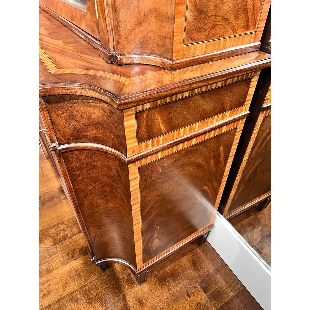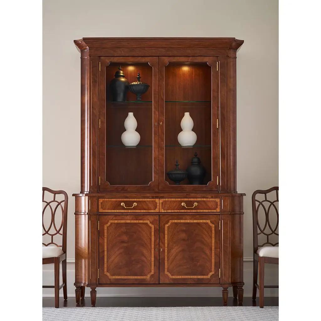 Crafted from premium figured wood, this cabinet showcases rich, warm tones and intricate grain patterns that exude luxury. The upper section features two spacious glass shelves, perfect for displaying your finest china, collectibles, or treasured decor items. The glass doors not only protect your valuables but also add a sophisticated touch to the overall design.The lower section of the cabinet offers ample storage with two drawers and two cabinets, making it ideal for storing dining essentials or other household items. The classic Georgian design is complemented by brass handles and subtle detailing, ensuring this piece stands out in any room. Whether placed in your dining room, living room, or hallway, the cabinet combines beauty and functionality, transforming your space into a refined and stylish haven.Dimensions: 58.5" W x 22" D x 90" H