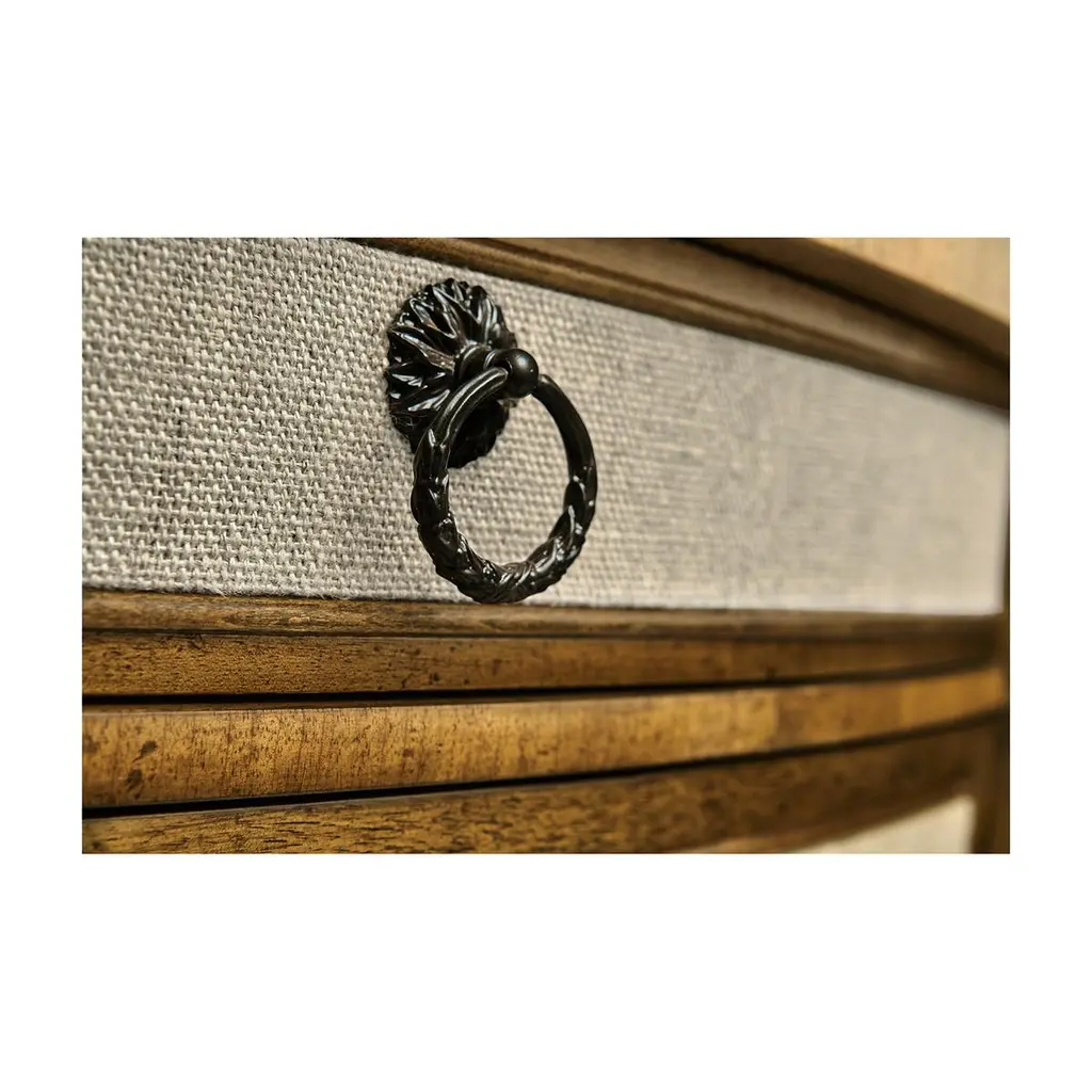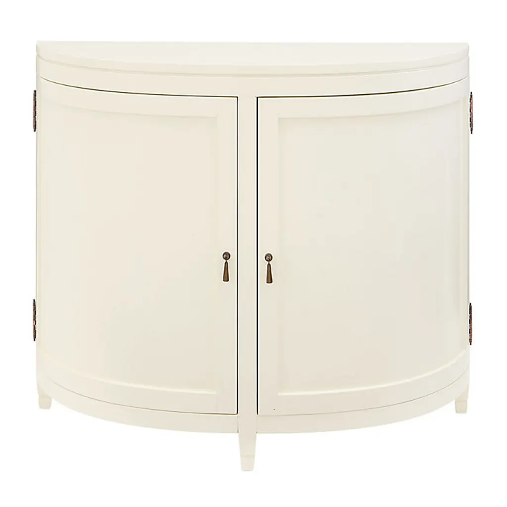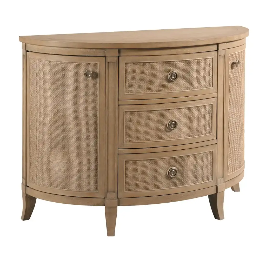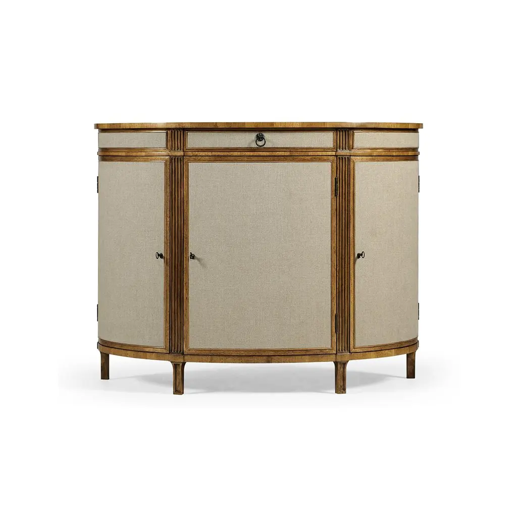 Georgian Modern Demi Lune Cabinet – a sophisticated fusion of classic and contemporary design. Expertly crafted, this cabinet boasts a solid case with Kravet linen fabric cabinet doors and understated hardware. The grey fruitwood top, which sits atop the cabinet, is an elegant touch. The cabinet also features raised tapered feet with traditional accents for a timeless touch.Dimensions: 48" W x 20 1/8" D x 37.75" H.