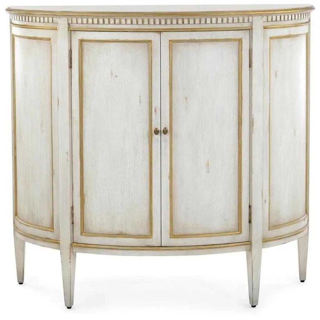 Georgian Modern Demi Lune Cabinet – a sophisticated fusion of classic and contemporary design. Expertly crafted, this cabinet boasts a solid case with Kravet linen fabric cabinet doors and understated hardware. The grey fruitwood top, which sits atop the cabinet, is an elegant touch. The cabinet also features raised tapered feet with traditional accents for a timeless touch. Dimensions: 48" W x 20 1/8" D x 37.75" H