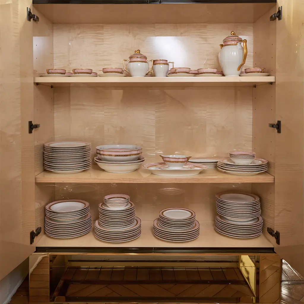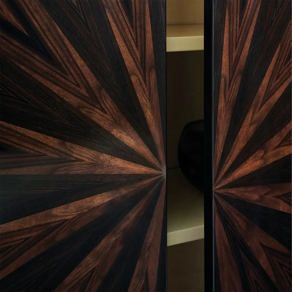 Brimming with lavishness and Art Deco-inspired style, this cabinet is a magnificent piece crafted in wood with a splendid Macassar ebony veneer with a matte finish on the two front doors. The front is worked by hand in a superb radial pattern that creates a vibrant accent, matching the elegance of the brass-plated metal base with a glossy finish worked using the galvanic technique. This sophisticated piece can be used to store a variety of objects, depending on its usage. Inside, it is equipped with two internal shelves.