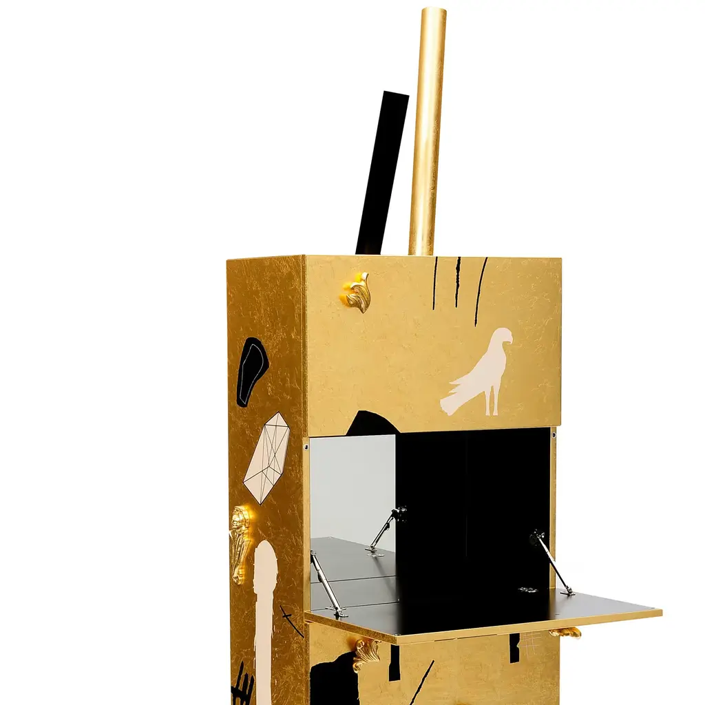 This cabinet bar was crafted entirely in MDF wood and Its surface was covered in a layer of gold leaf and then decorated by hand with various designs in black and white by Mimmo Paladino. The piece features three openings, which can be accessed by three doors and offer ample stage space. A mirrored surface internally adorns the bottom opening. The four legs on which it rests are slightly angled and two of them continue upwards on the top of the piece adding a unique element to the shape.