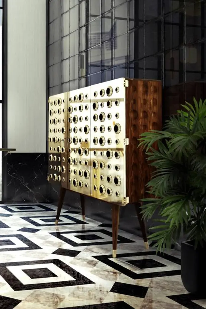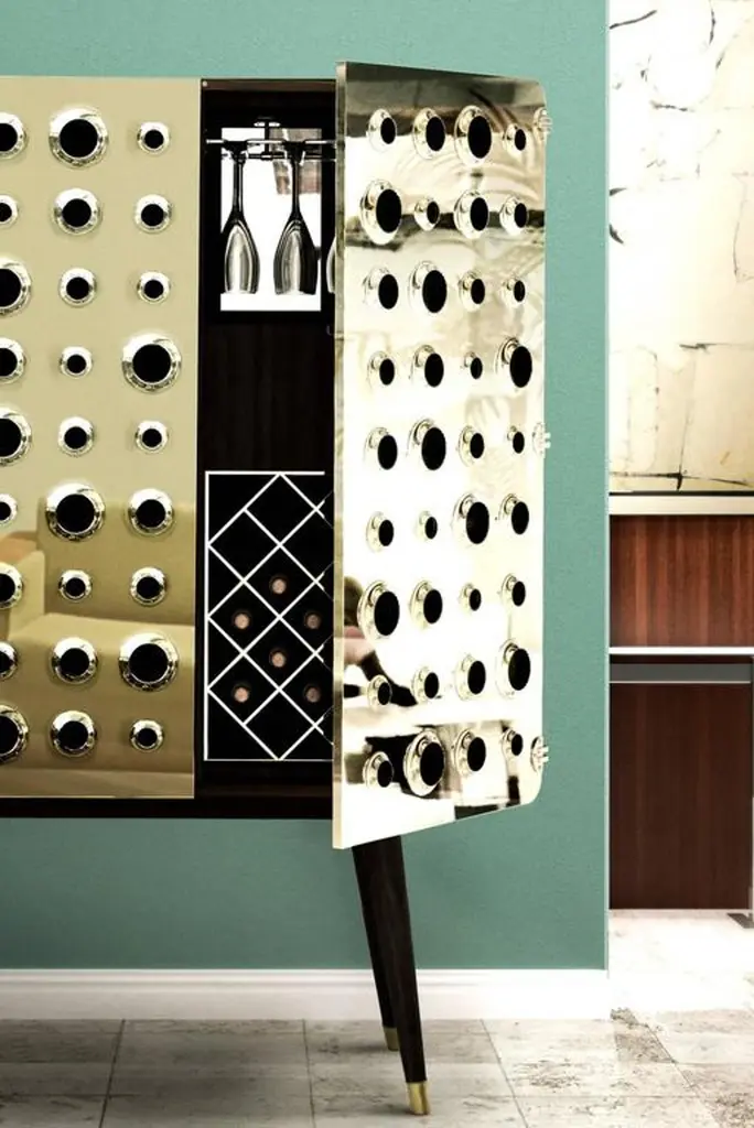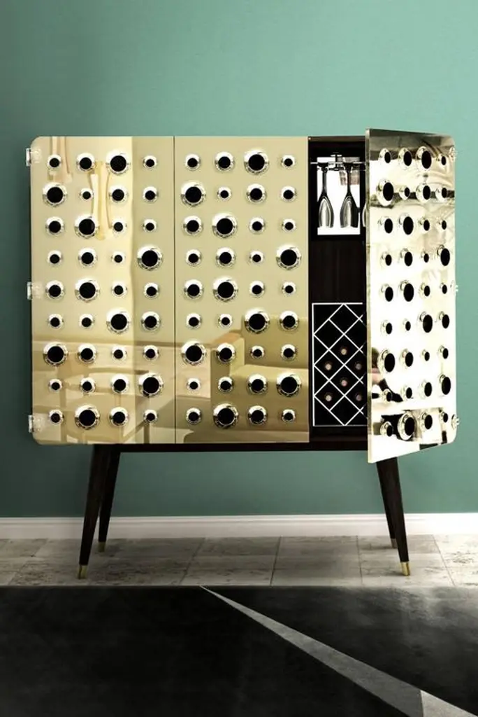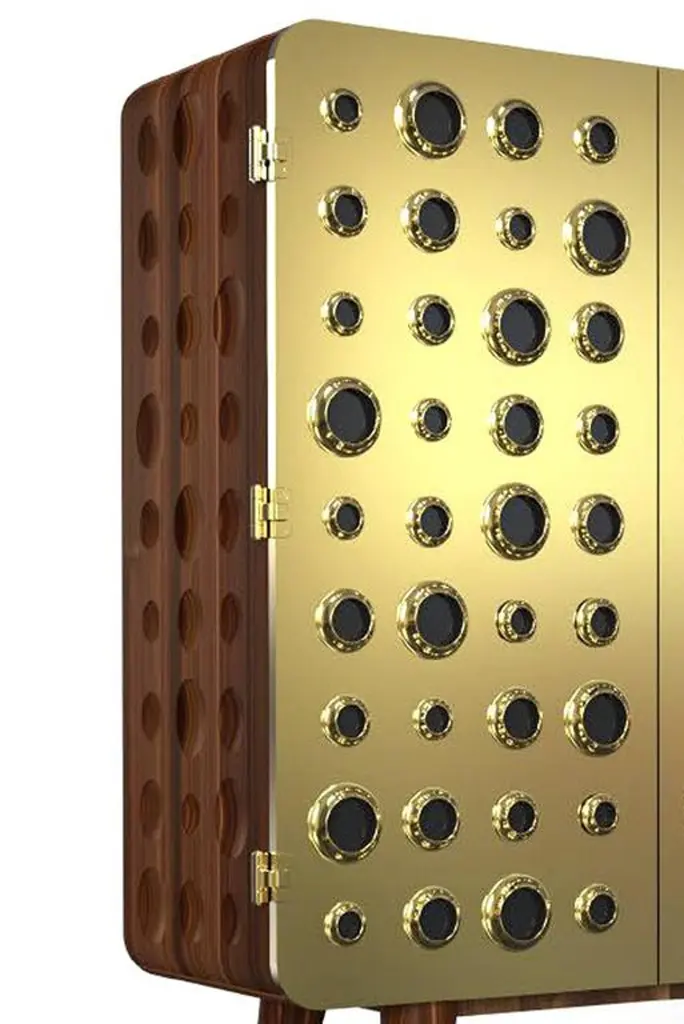 Cabinet golden doors in solid walnut woodand polished brass and UV-resistant clear.Acrylic coating. Ideal for Martini and Gin Bottles.