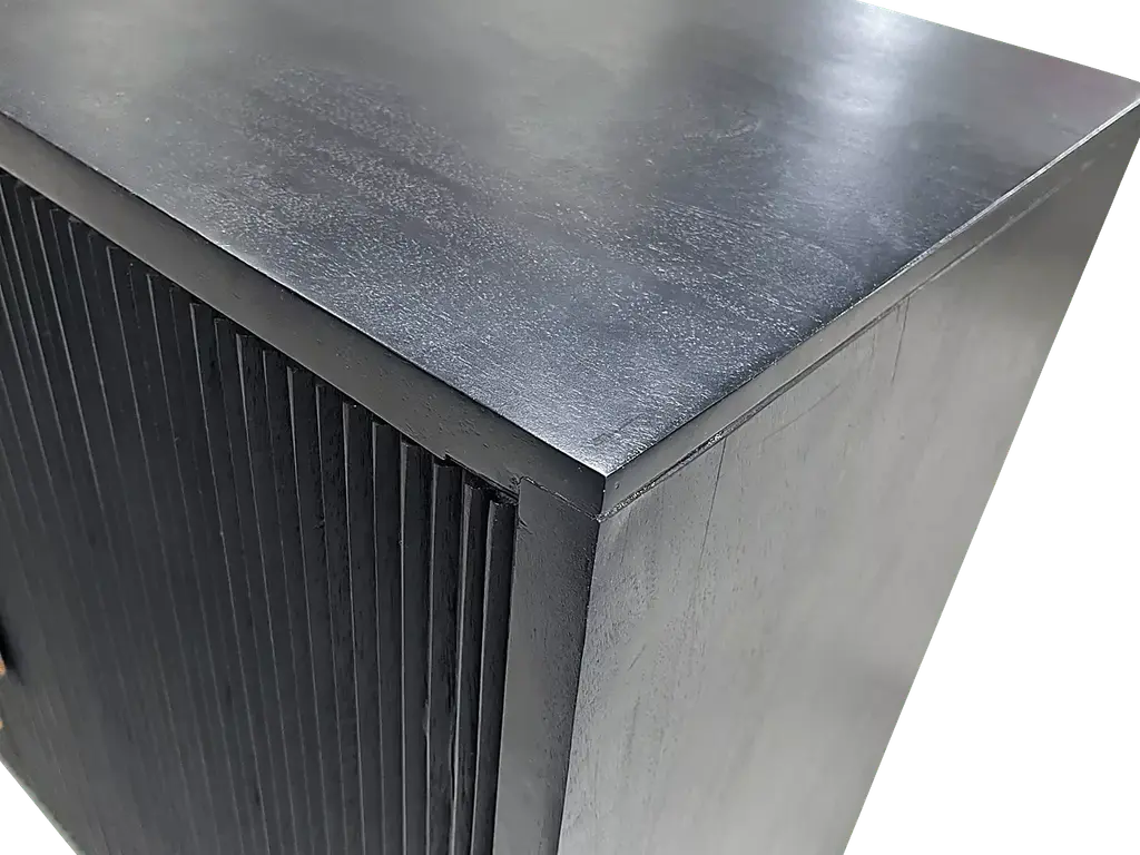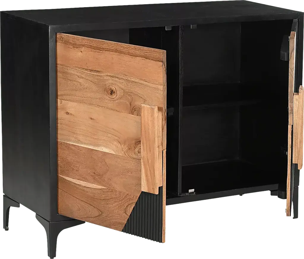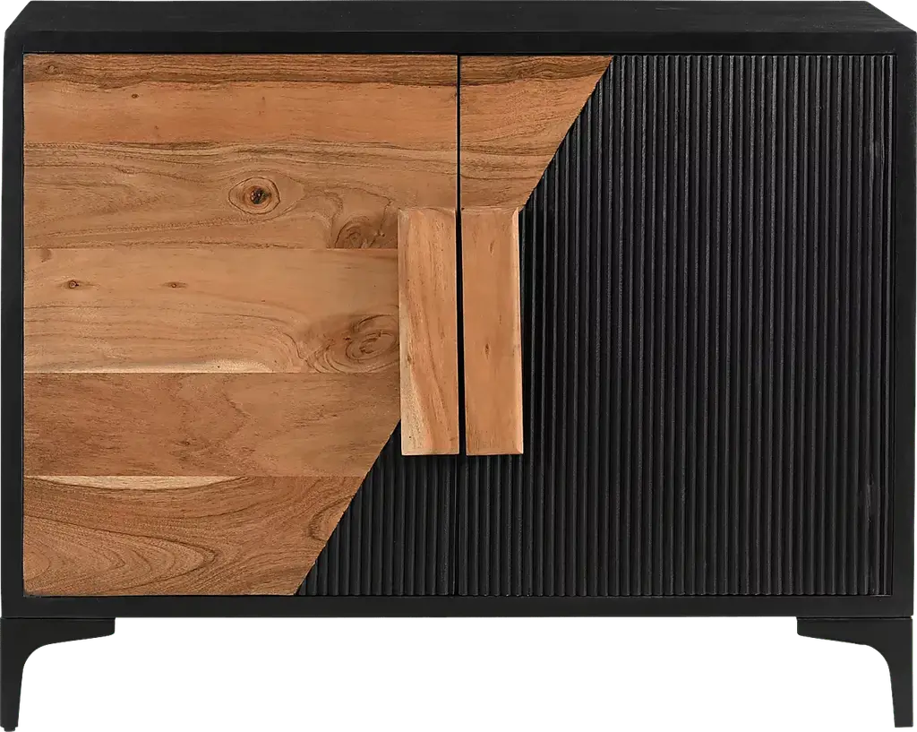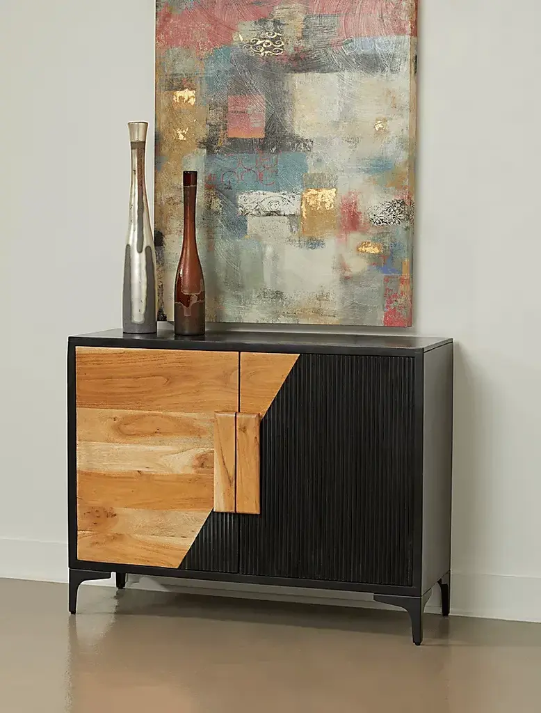 This Gossamer accent cabinet's stunning two-toned finish is the perfect balance of light and dark elements. Crafted from solid Acacia wood, the frame features a slightly distressed black painted finish that perfect complements the natural wood tones of the two-tone door fronts. The black iron base complements the color scheme perfectly and provides stability. Upgraded European hinges and bold wood hardware come together to create a cohesive look, while the spacious shelved interior provides ample storage space. Customer assembly is required.