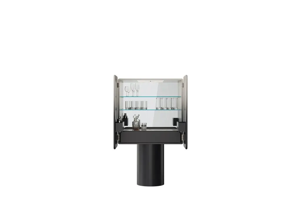 Black Blue and Greige Regis Gradient Bar Cabinet with Two Rounded Door on Cylinder Base by UltramobiliDimensions: W 100 x D 54.7 x H 168.3 cmMaterials: Lacquer, Marble, Ceramic. Bar Cabinet with two rounded doors on cylinder base. Blue mirror insert (or marble effect ceramic) on the doors. Lacquered structure with Gradient hand-shaded matte finish. Internal drawer, mirror, glass shelves, side pockets. LED lighting with sensor, other accessories optionally.Ultramobili:Tactile materials and exclusive finishes, advanced functionality and uncompromising quality define the character and soul of each creation, the best business card with which ULTRAMOBILI furnishings present themselves to the world. ULTRAMOBILI collaborates with a group of highly selected craftsmen, closely connected to their home territory, Pesaro. It is from their manufacturing skills that all the brand's furnishings take shape, in a continuous exchange of skills that focuses on design ability and the intelligence of the hands. ULTRAMOBILI employs an international team of designers who every day imagine, design and create - with talent and passion, dedication and visionary spirit - all the brand's furniture: architectural sculptures that become iconic objects and furnishings for living. ULTRAMOBILI's credo is quality without compromise. An uncompromising vision that expresses itself every day in the choice of excellent materials and finishes, in the obsessive care for every single detail, in the constant search for advanced functionality and in the incessant striving for cutting-edge, unique and unmistakable design. ULTRAMOBILI also produces tailor-made projects, ad hoc creations capable of meeting the most intimate and profound needs of those who enter the brand's universe. Bespoke furnishings that are born in close connection with the architectural envelope that houses them, and that dialogue with the surrounding environment in the volumetric relationships of their components, in the materiality and colour nuances of the materials, in the chiaroscuro effects of the volumes and in the visual communicativeness that distinguishes them.