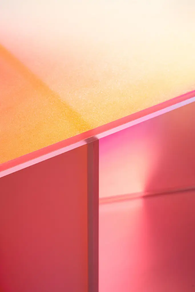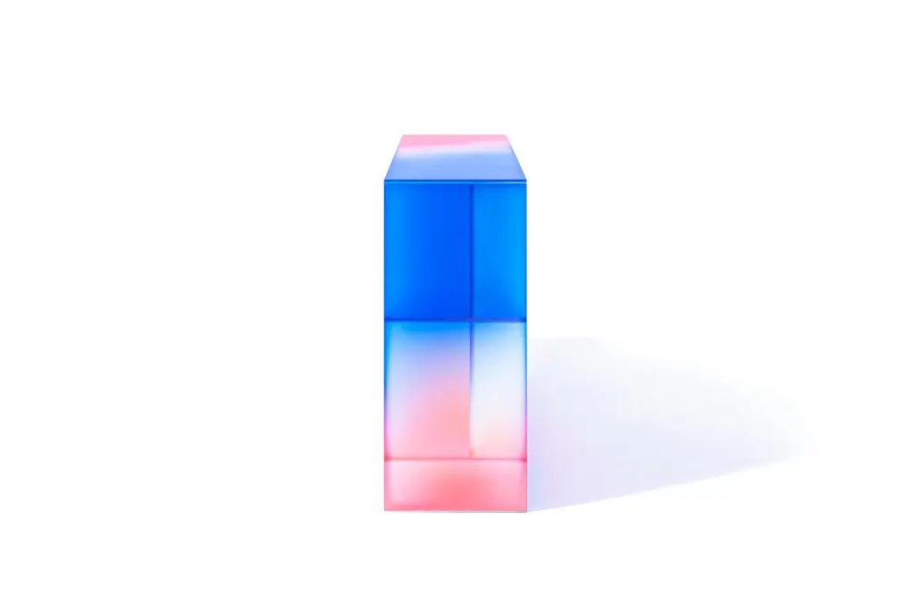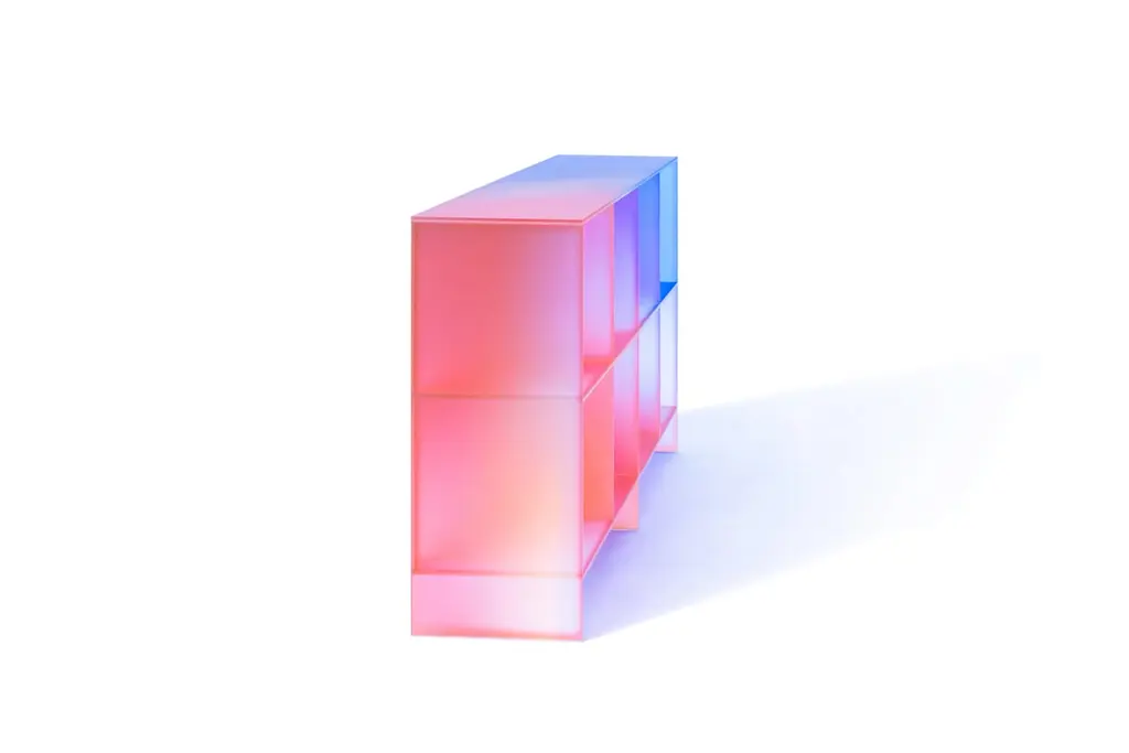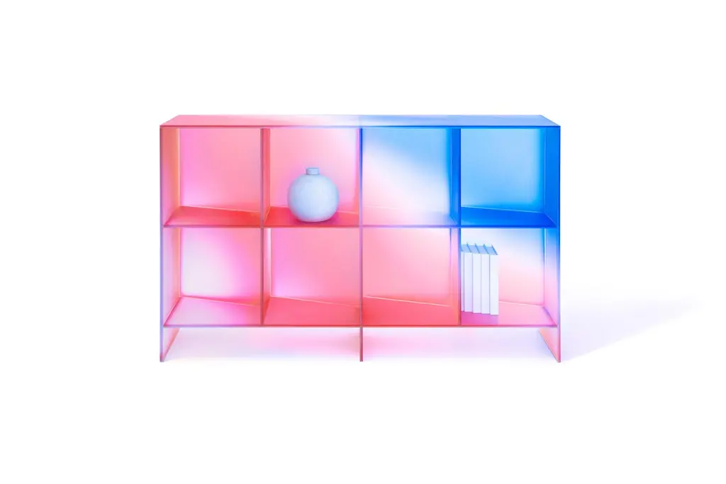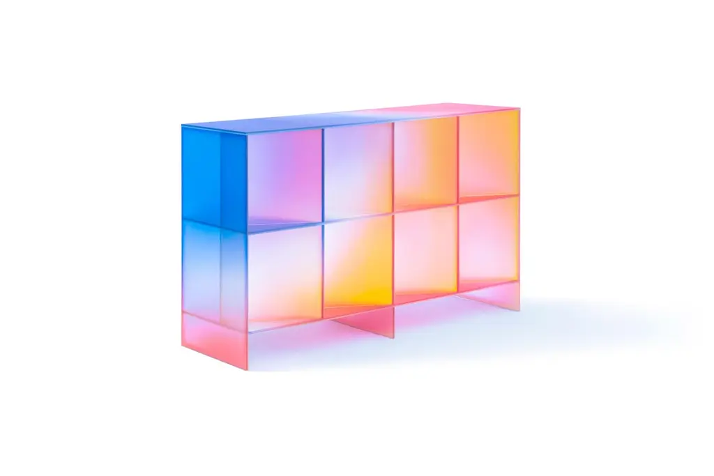 'HALO' collection by Buzao - CabinetLaminated dichroic glass, gradient colorsMeasures: 166 x 40 x H 98 cmStudio Buzao from Guangzhou (China) is exploring innovation with furniture and lighting design. From marble to lava stone, from electroplated stainless steel to laminated glass: Buzao always works with exclusive materials in a very contemporary style. With this new collection 'HALO', Buzao created a set of furnitures and lightings made of dichroic glass which gives unique gradient colors from pink to blue. We enjoy every minute looking at this piece like a sunset or a rainbow.