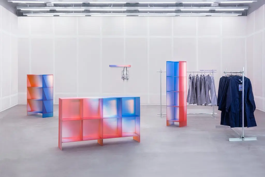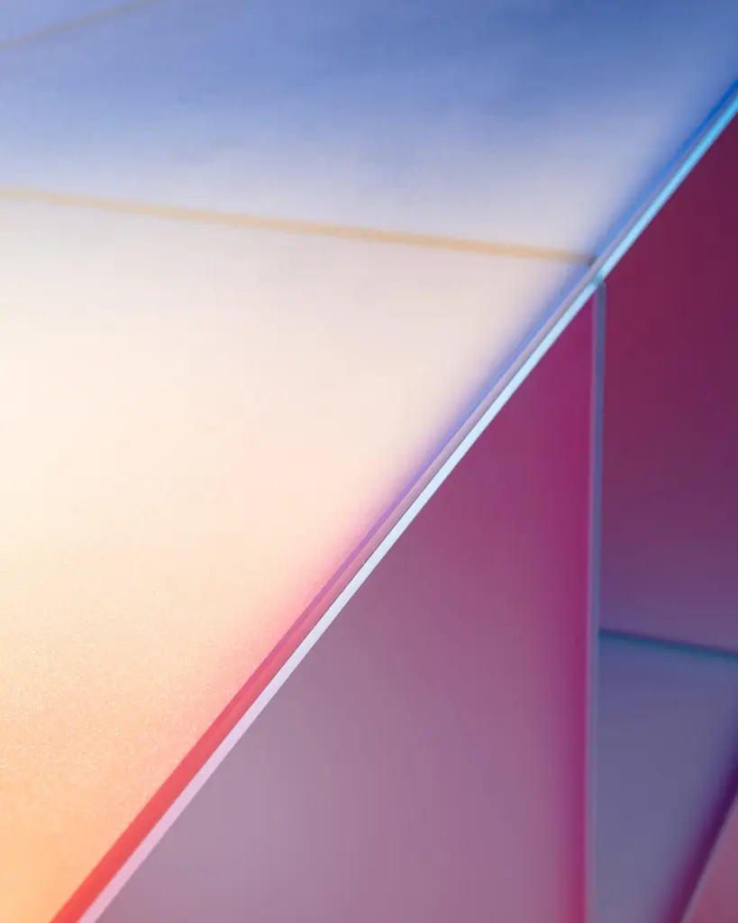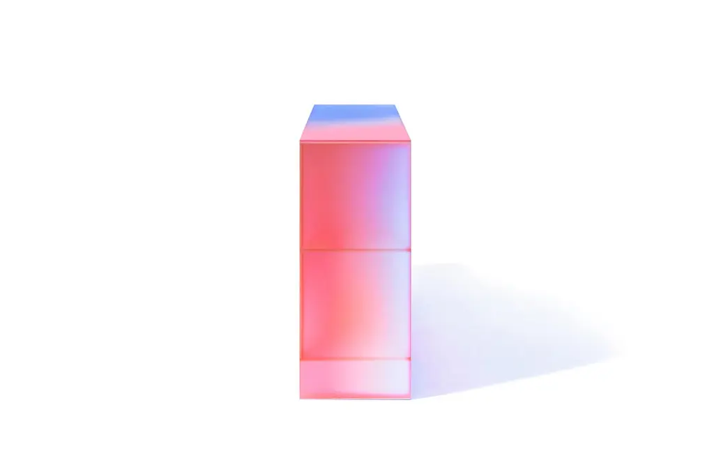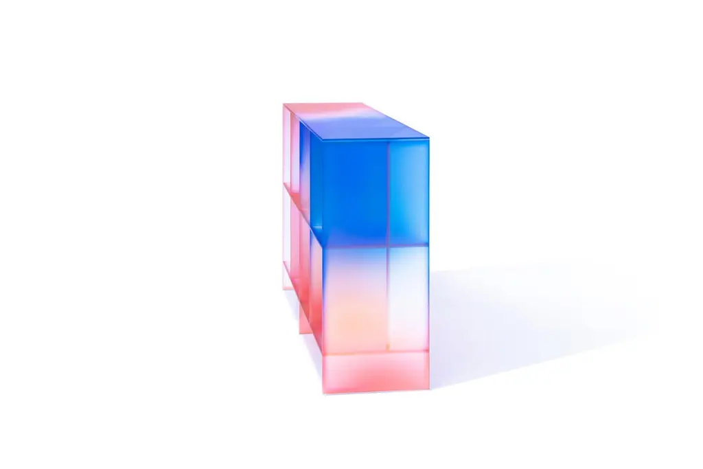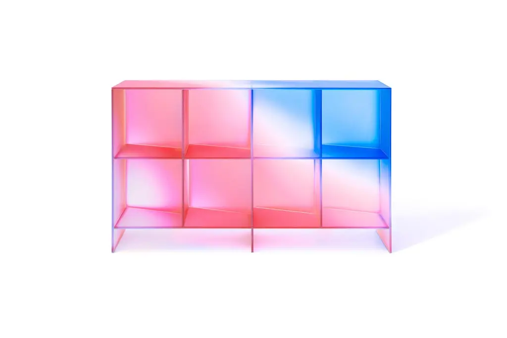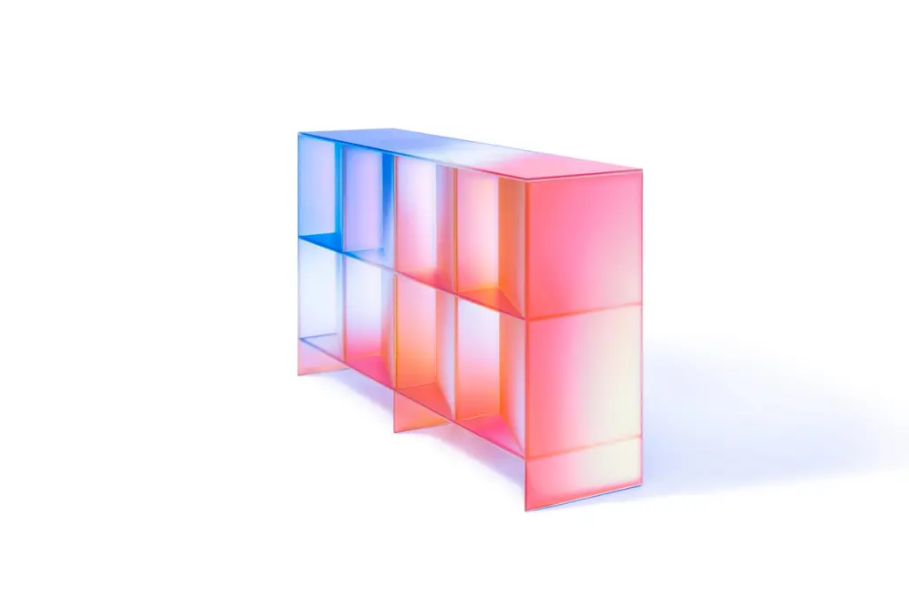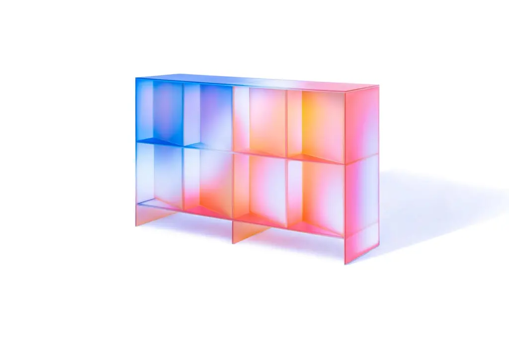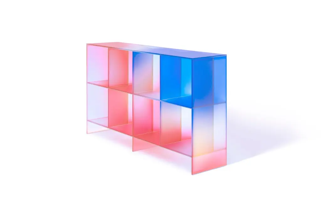'HALO' collection by Buzao - CabinetLaminated dichroic glass, gradient colors Measures: 166 x 40 x H 98 cmStudio Buzao from Guangzhou (China) is exploring innovation with furniture and lighting design. From marble to lava stone, from electroplated stainless steel to laminated glass: Buzao always works with exclusive materials in a very contemporary style. With this new collection 'HALO', Buzao created a set of furnitures and lightings made of dichroic glass which gives unique gradient colors from pink to blue. We enjoy every minute looking at this piece like a sunset or a rainbow.