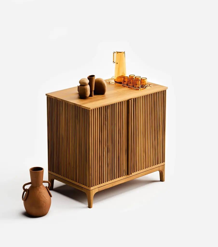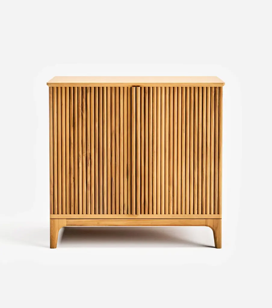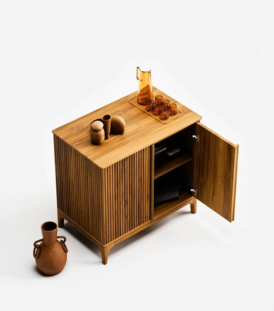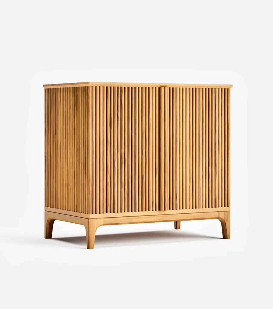 A staple in our storage collection. Crisp lines and unassuming rounded textures come together to keep all the action behind closed doors. A solid teak cabinet that brings a timelessness to a staple of storage in any living room, bedroom and office.