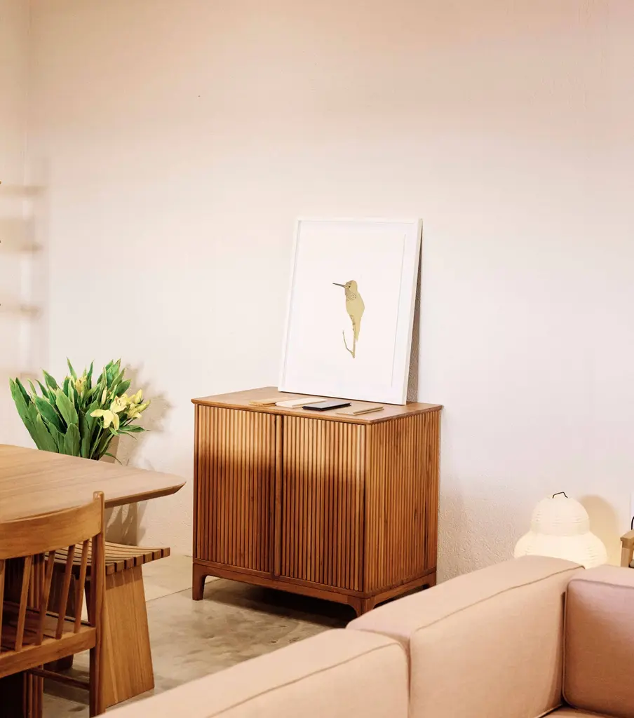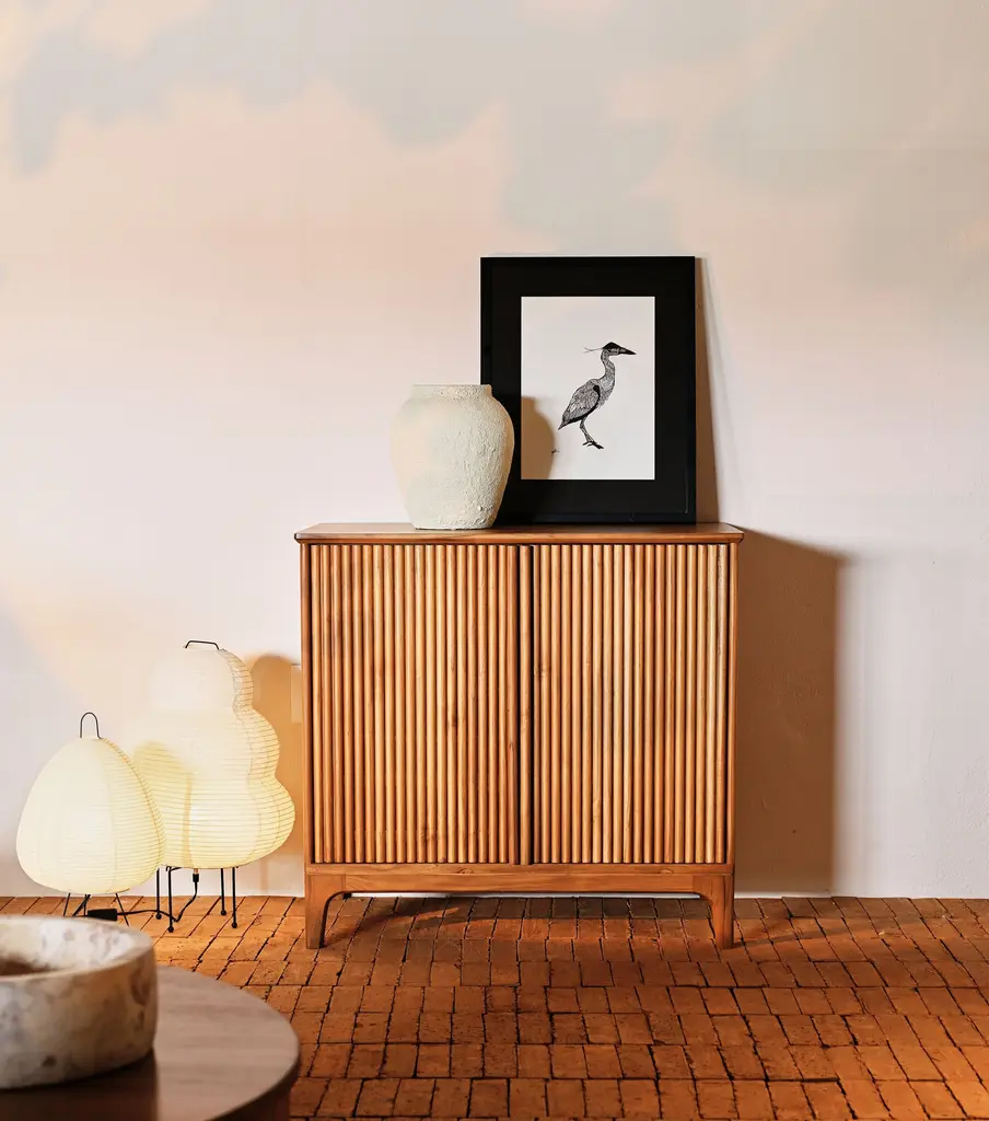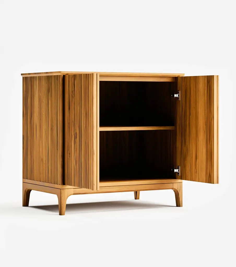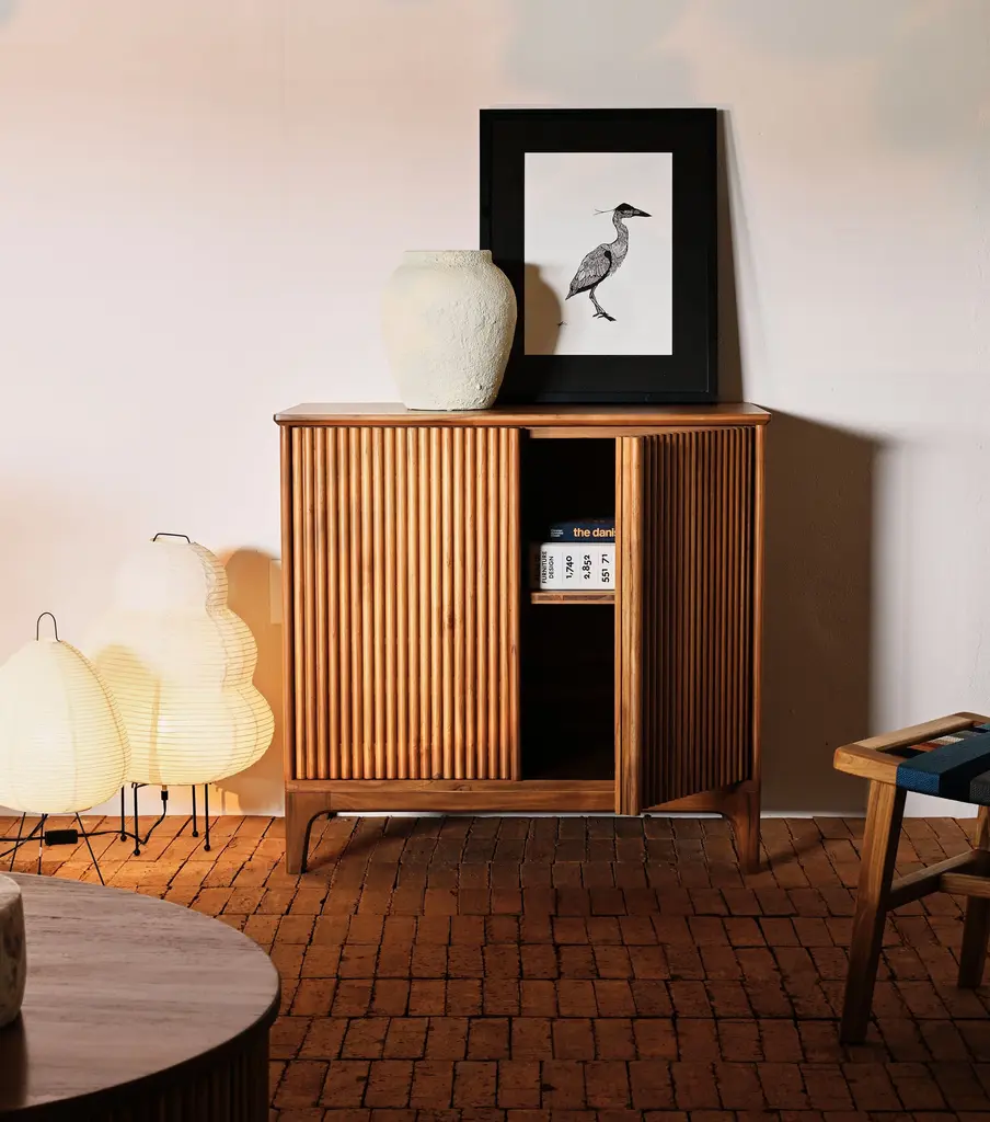 A staple in our storage collection. Crisp lines and unassuming rounded textures come together to keep all the action behind closed doors. A solid teak cabinet that brings a timelessness to a staple of storage in any living room, bedroom and office.