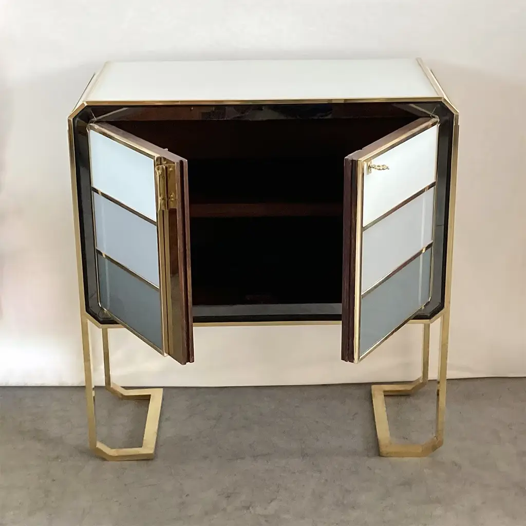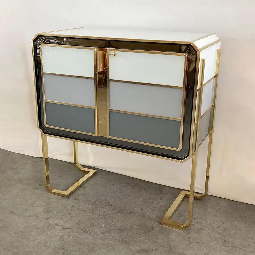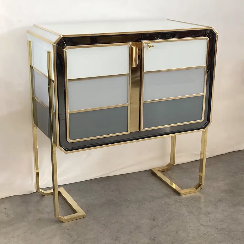 Defined by a versatile palette of grays and white, this cabinet exudes a refined, vintage-inspired charm. Ideal for contemporary or mid-century modern interiors, its solid two-door structure is handcrafted of wood covered with colored glass. The profile, handles, and unconventional legs are in gold-finished brass.