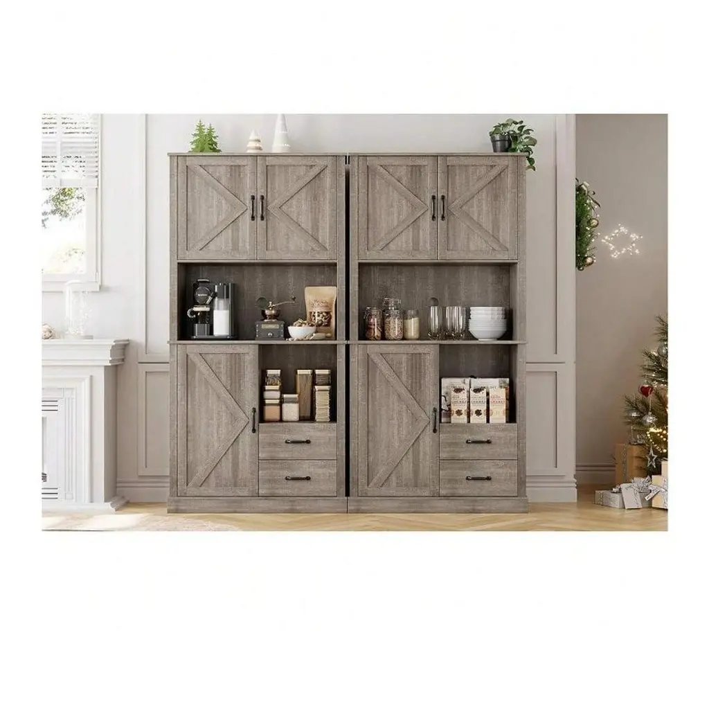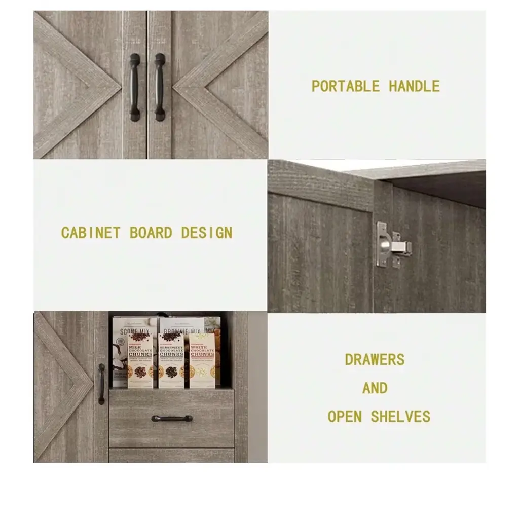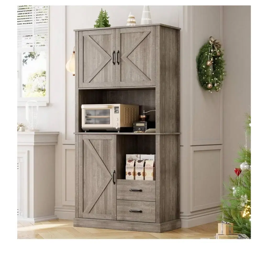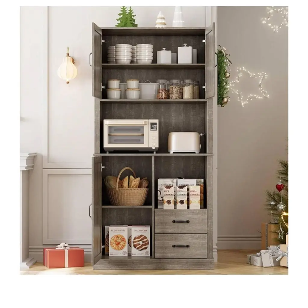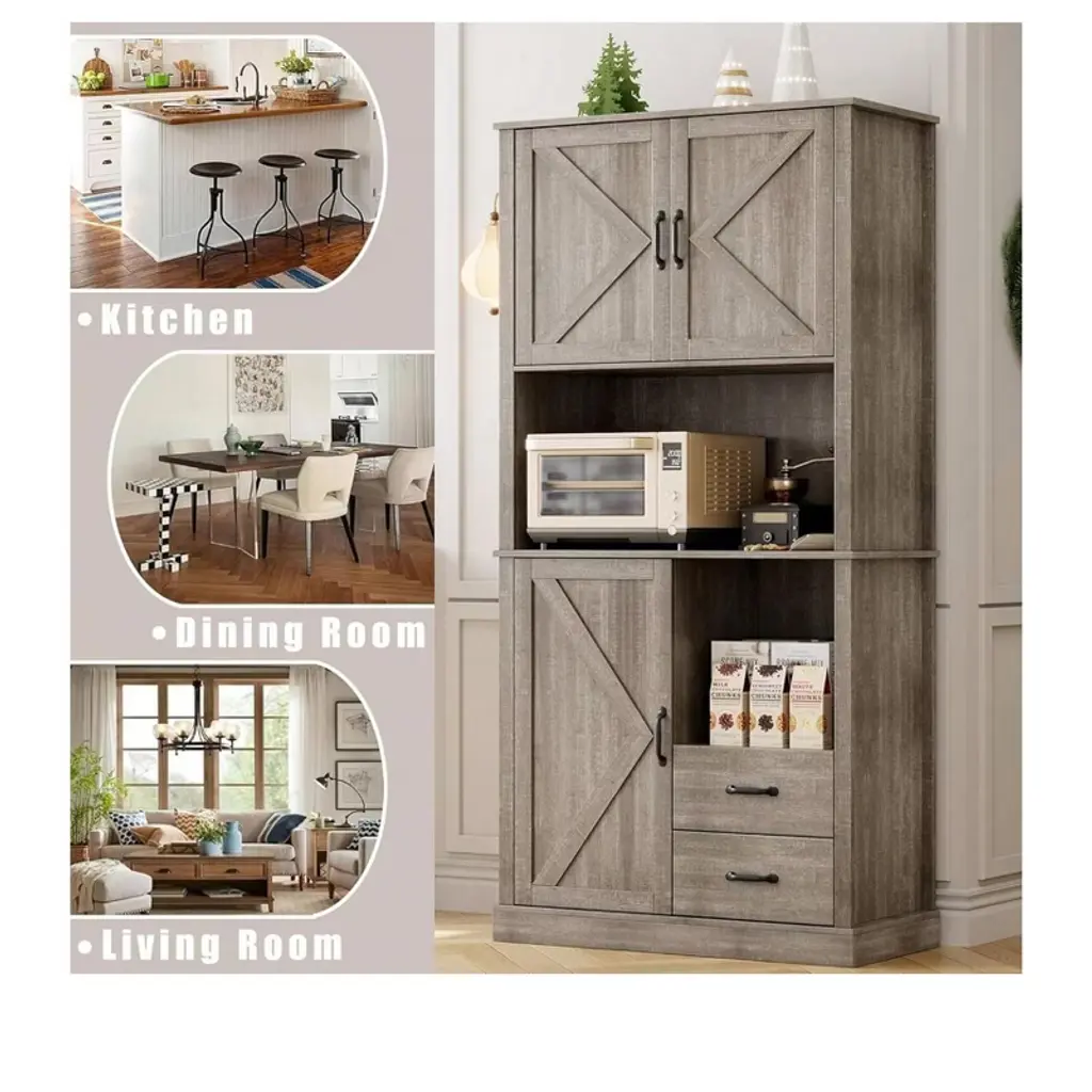 Gray Tall Pantry Cabinet With 2 Drawers, Open Shelves & Microwave Shelf For Kitchen, Dining Room, Living Room