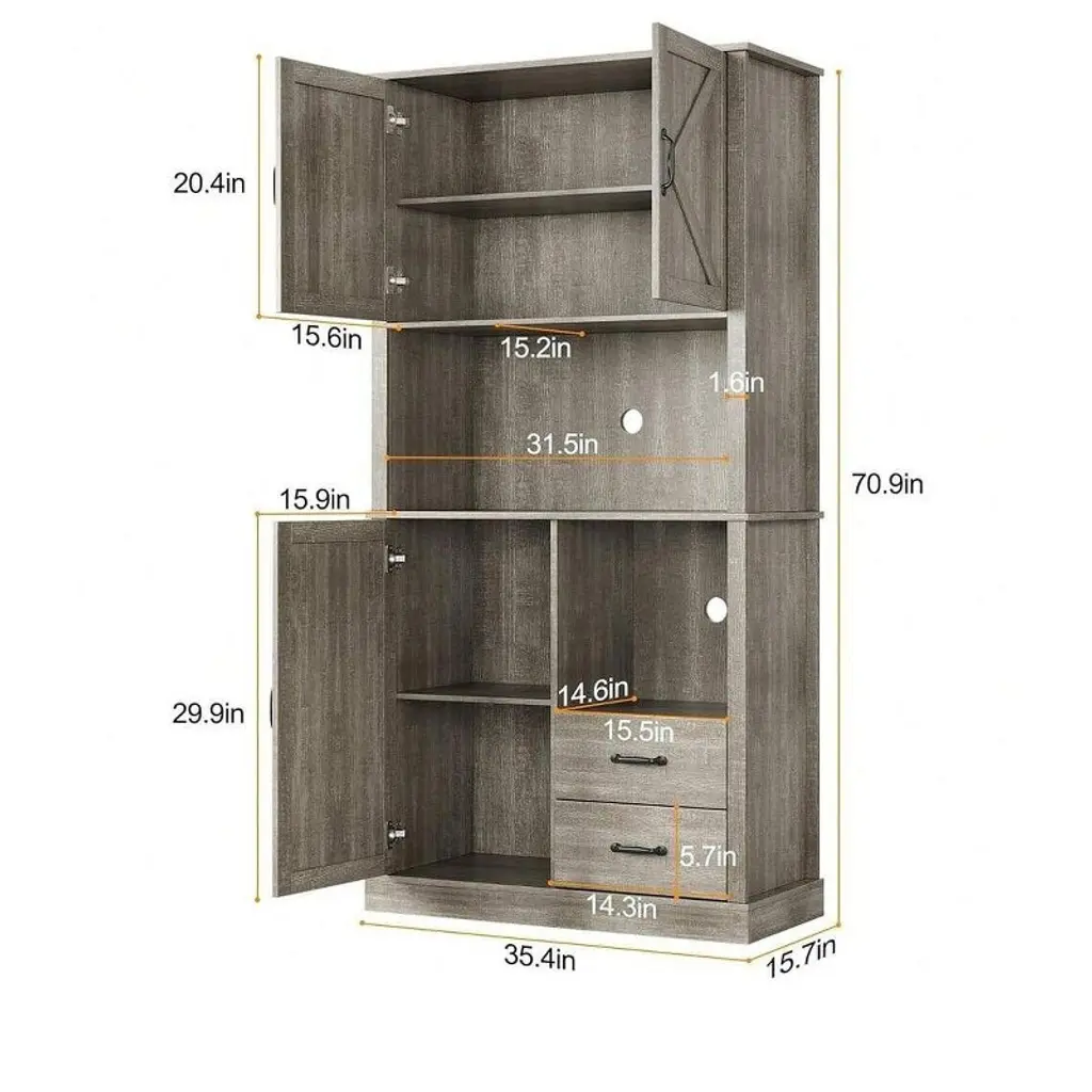 Large Capacity & Flexible Storage This 71" kitchen pantry cabinet features 2 drawers, 3 door cabinets, and open microwave shelves, ideal for storing dishes, cookware, and supplies. Designed to meet your individual storage needs.
