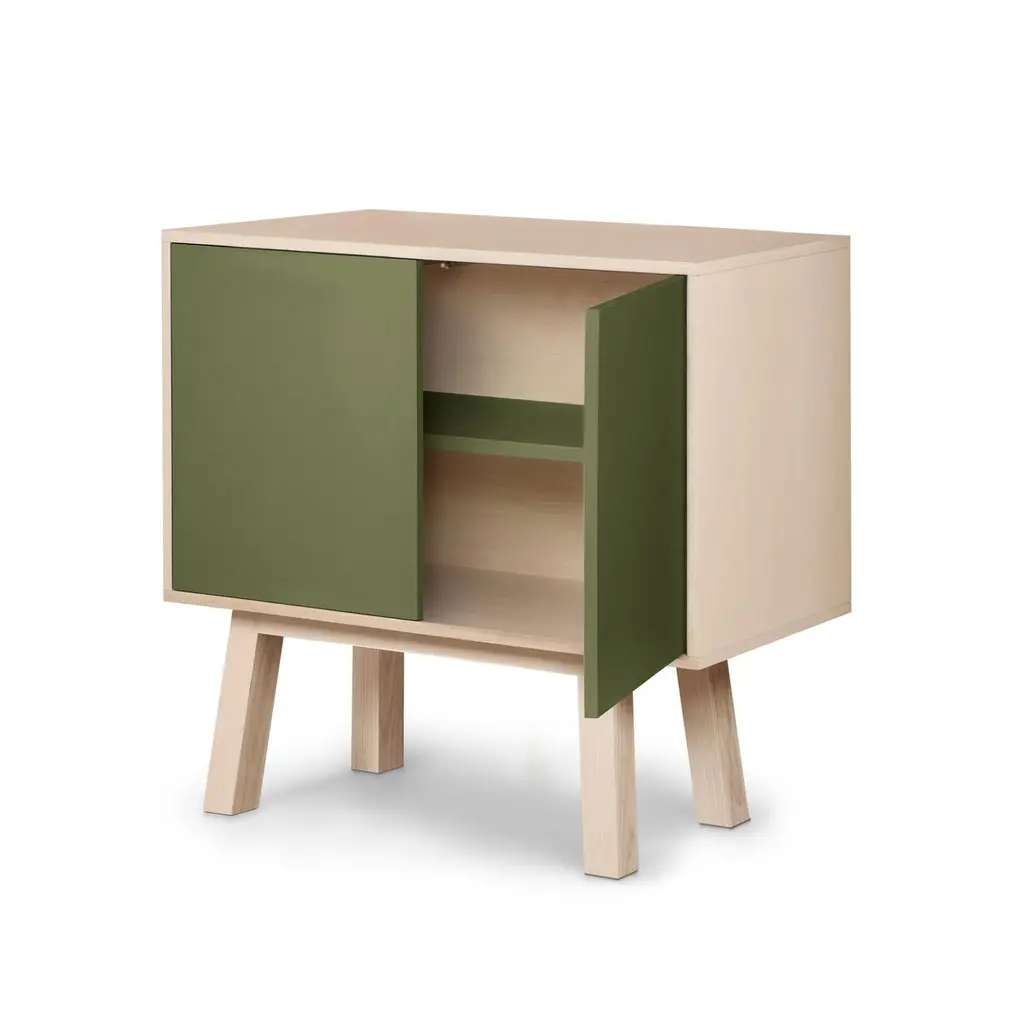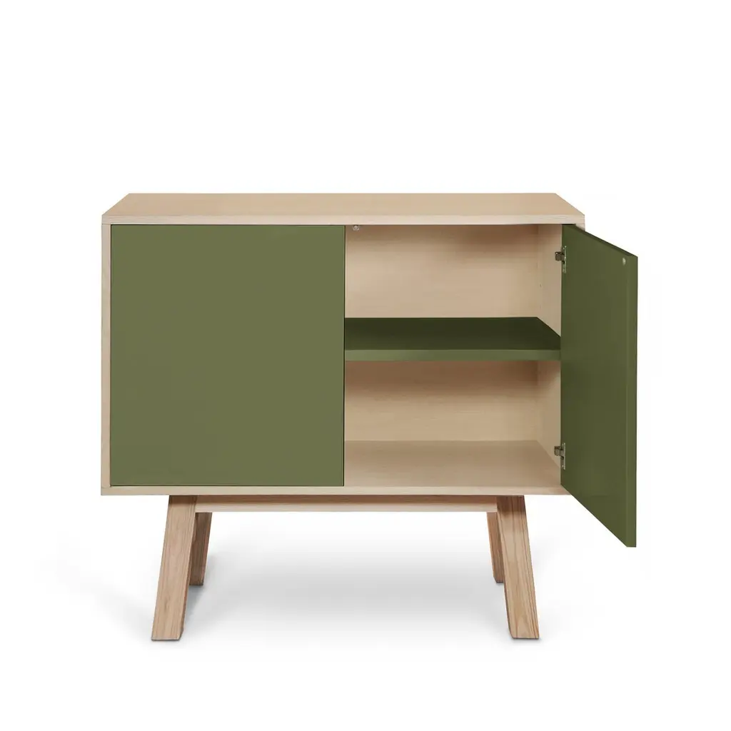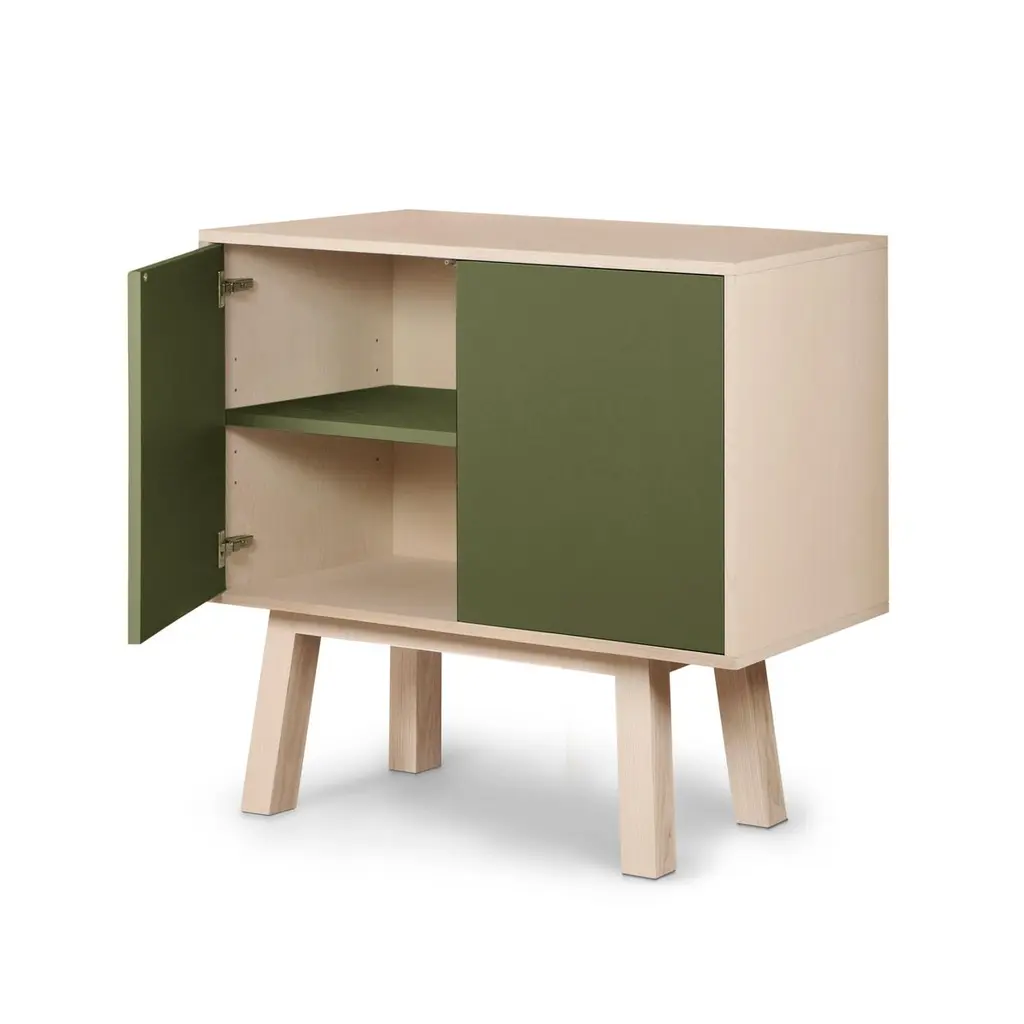 This 2-door cabinet is designed by Eric Gizard, Paris and 100% handcrafted in France.It is made of French solid ash wood, veneer adh and lacquered doors in MDF panels. The 2 doors open with a "push-to-release" pressure. A shelf in solid ash wood is placed behind the 2 doors and adjustable on (supplied) cleats.The shelf colour is identical to the doors' colour.The wood comes from sustainably managed French forests. ÉGÉE collectionThis sideboard is part of the ÉGÉE collection designed by Eric Gizard in Paris. Eric combines the sleek and refined codes of Scandinavian design with natural materials and muted and "trendy" colorful lacquers.MON PETIT MEUBLE FRANCAISprovides you exclusively with 100% Made in France furniture pieces. The manufacture and finishes are of very high-end quality, carried out in French craft workshops, in the west countryside of France: Loire and Bretagne.