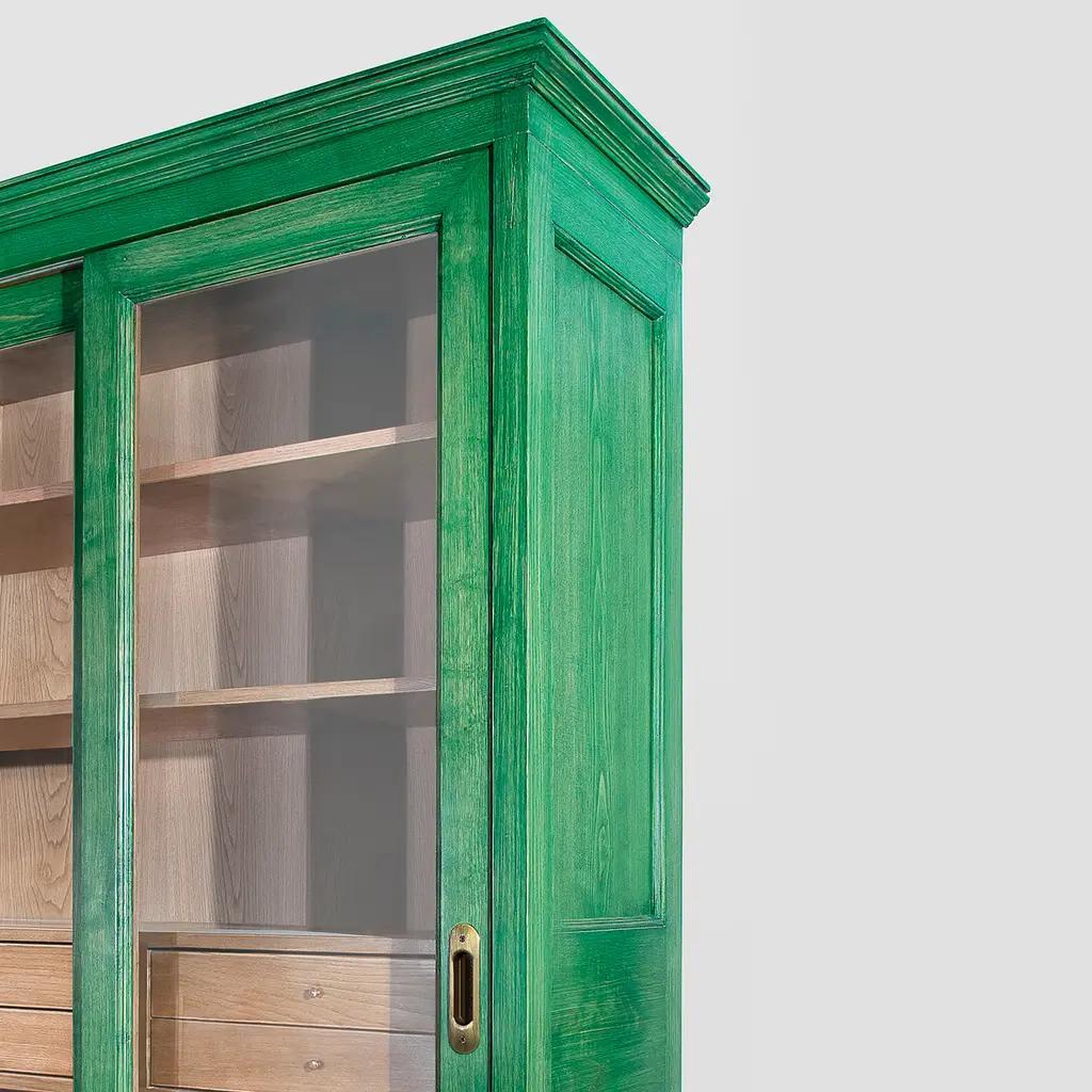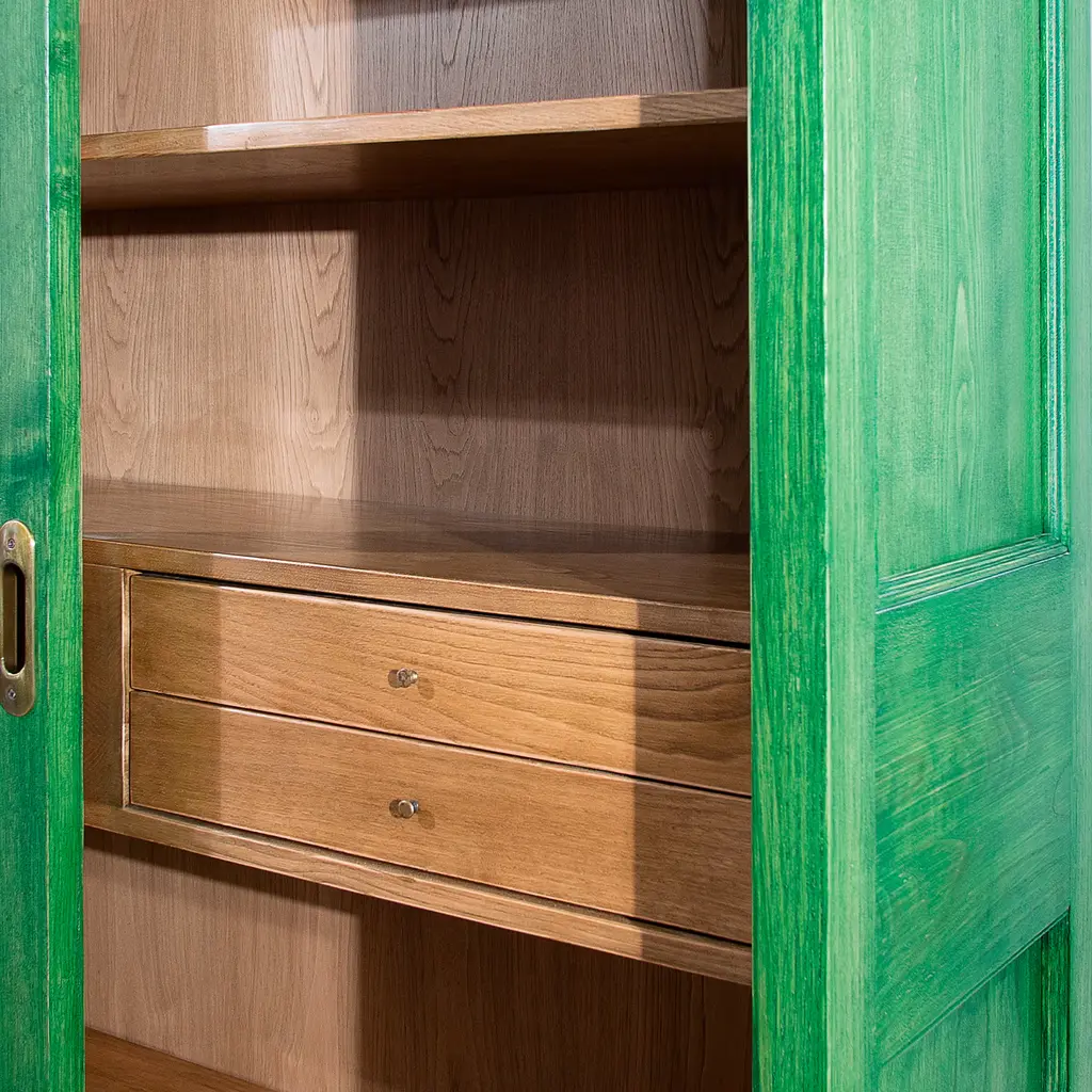 A showcase of traditional craftsmanship, this rustic-inspired cabinet in solid chestnut is perfect for storing tableware sets and even books, peaking through the glass panels incorporated in the front sliding doors. The inner storage space is divided into several shelves and four drawers with dovetail joints. Assembly is made easy thanks to the instruction manual included with purchase. Finished with water-based lacquer and beeswax, it is customizable upon request to the Concierge.
