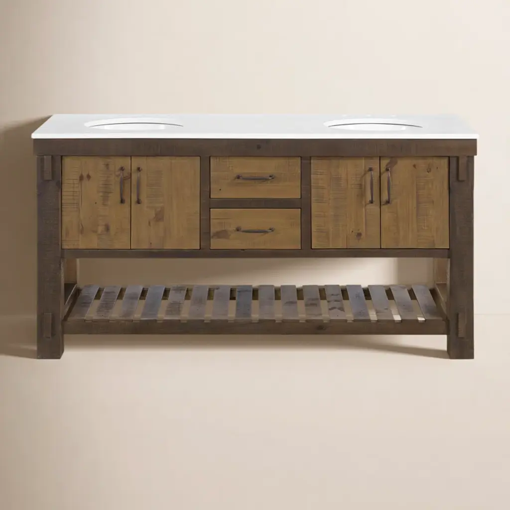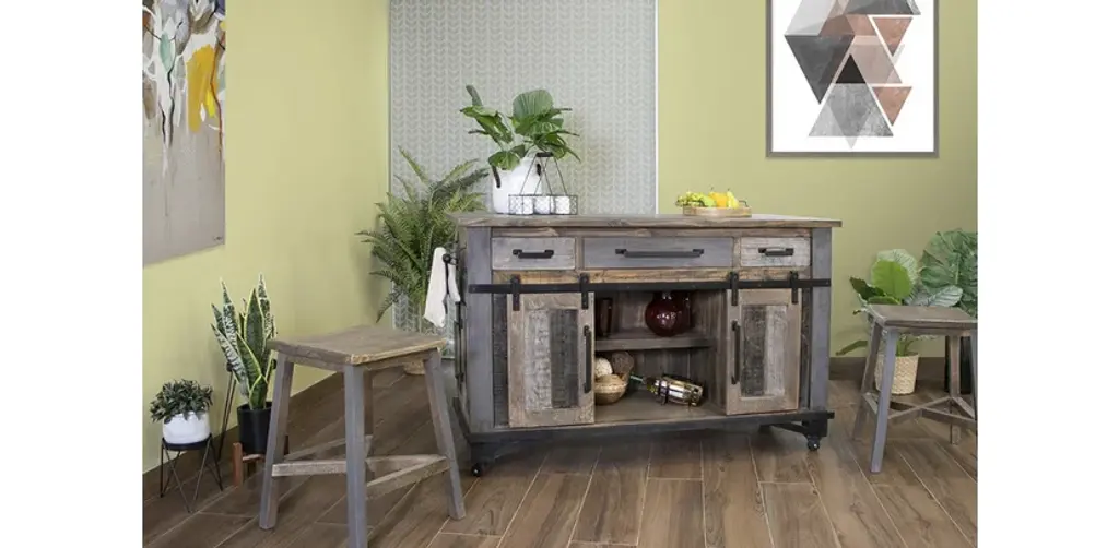 Greenview Loft Collection: Solid wood furniture with rustic and refined industrial details and finishes. Loft features a touch more modern and industrial flair than the original. Maximize your kitchen storage and counter spaceSolid pine wood with hand painted gray and brown color scheme that gives it the reclaimed wood look. Finished with a lacquer coating.Extended table top gives option for comfortable bar stool seating on one sideMortise and Tenon joinerySliding Doors on cabinet sideStorage space on the sidesOption1: Kitchen IslandOption2: Kitchen Island and two matching bar stoolsDimensions:Kitchen IslandOverall: 60Wx30Dx36.5HCounter Overhang: 8"Center drawer: 22.75Wx13.75Dx4.25HSide drawer: 11.25Wx13.75Dx4.25HBehind sliding doors:Above shelf: 23.5Wx11.25Dx10.5HBelow shelf: 23.5x18.5Dx9.25HBehind side cabinet doors:Above shelf: 17.75Wx12Dx9HBelow shelf: 17.75Wx15Dx9.25HFrom floor to under table top (w/o wheels on): 34.75"HTable top is 1" thickBar stool: 18Wx18Dx23.75H