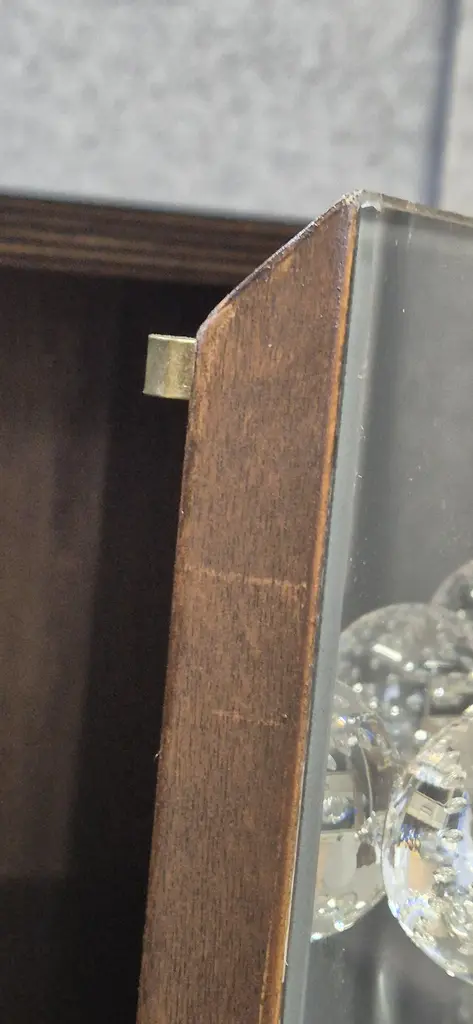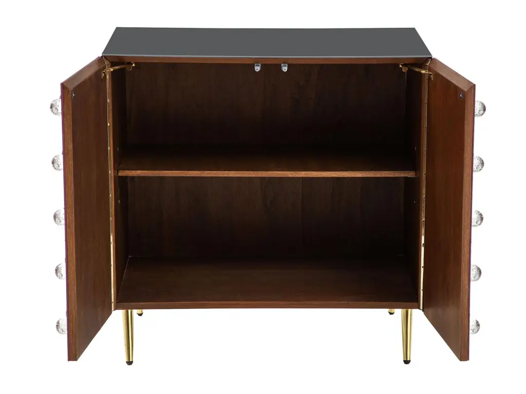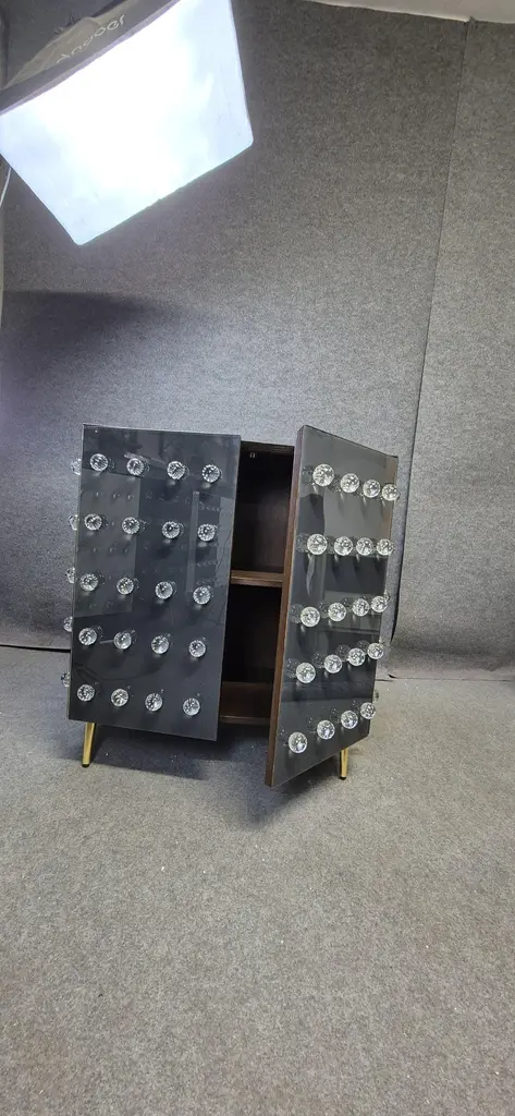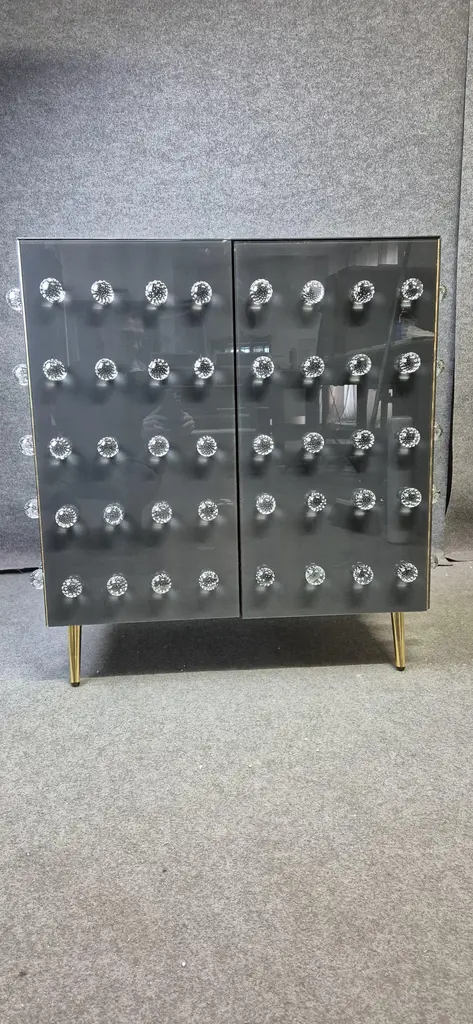 This refined 2 door modern gray glass cabinet showcases the best of Italian craftsmanship. With 90 spherical pieces of handcrafted Murano glass jewelry, this cabinet is an extraordinary fusion of art and function. The solid birch frame ensures durability, while brass accents add a touch of elegance.Gray (anthracite) stained glass and beveled edges create a mesmerizing play of light. Powder coated for durability, this piece of furniture represents the pinnacle of modern Italian design. Originally introduced at the Salone del Mobile in Milan, it is now available for discerning collectors. With a production time of 5-6 weeks, this piece offers exclusivity and sophistication to those who appreciate fine Italian furniture.