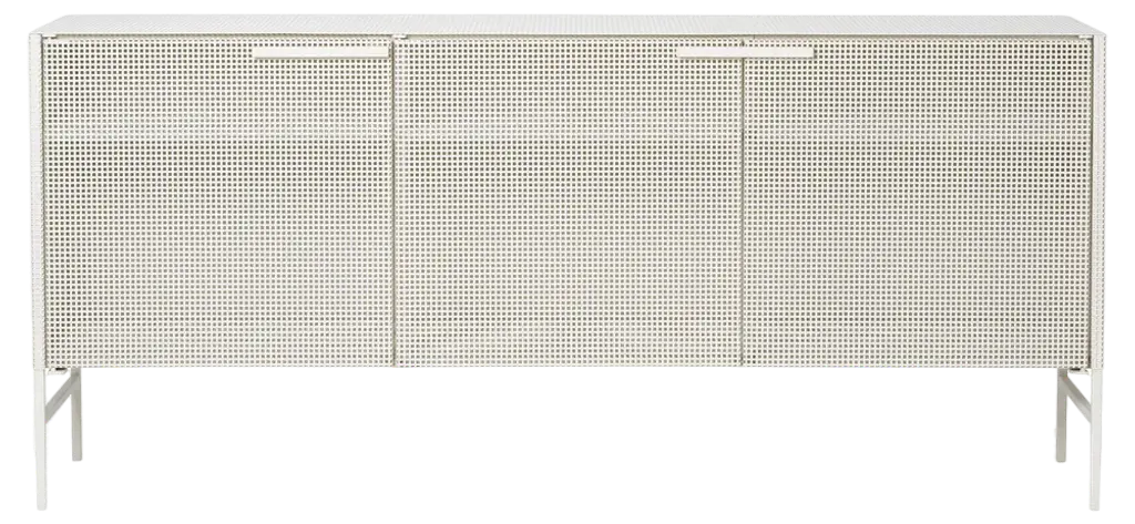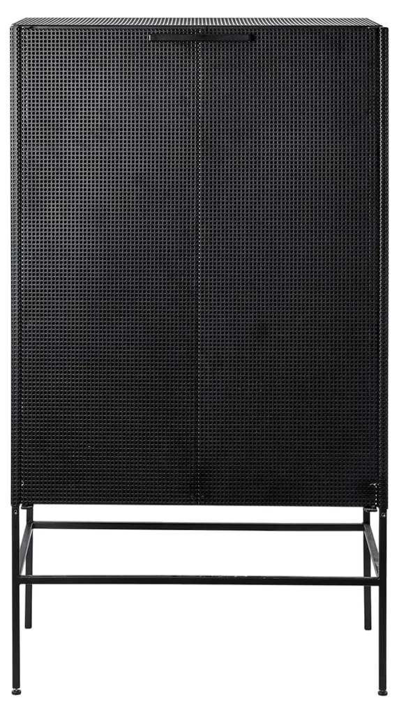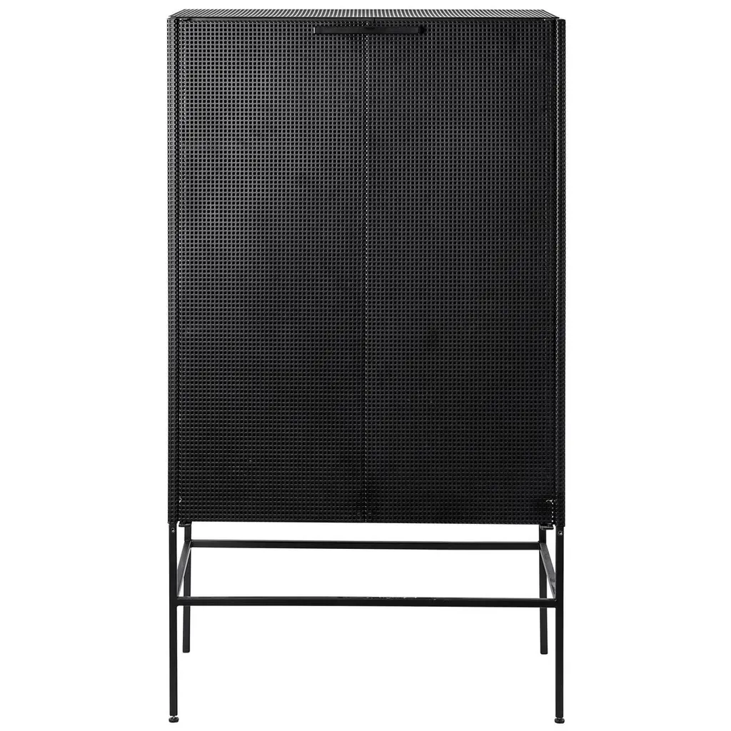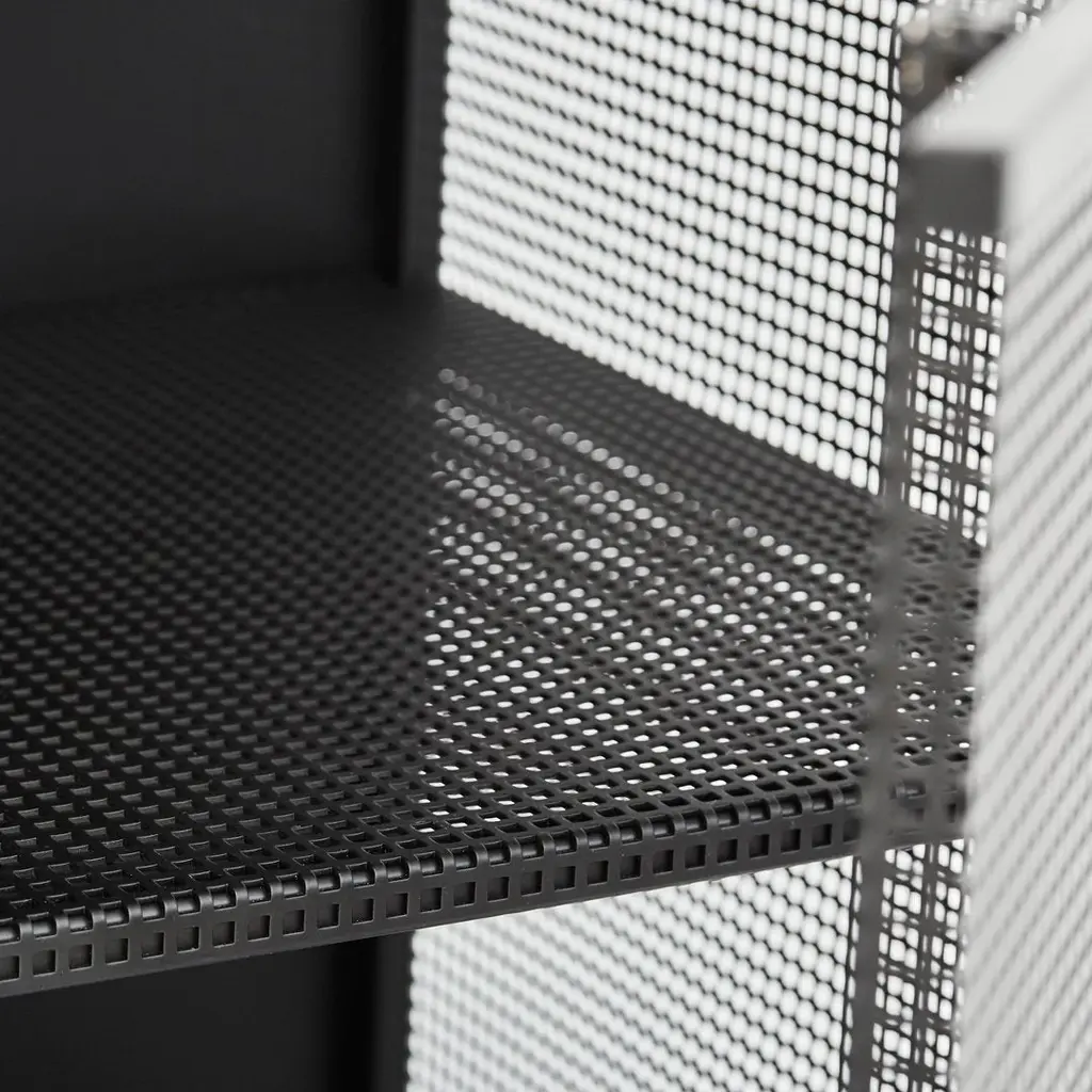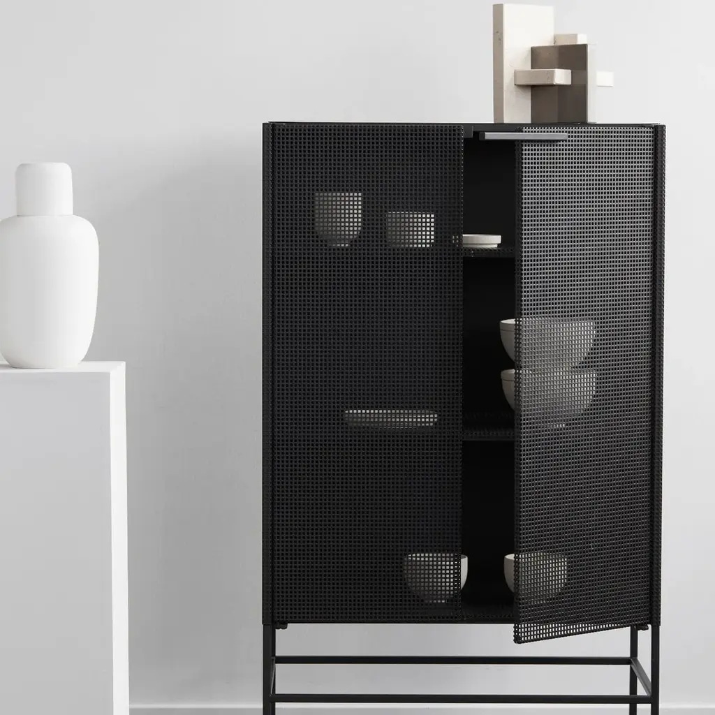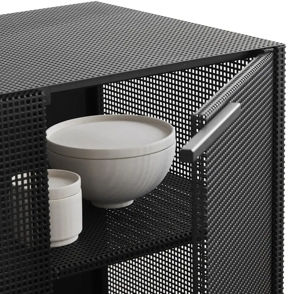 The Grid Cabinet is made of perforated steel. An elegant cabinet with a semi-transparent design.