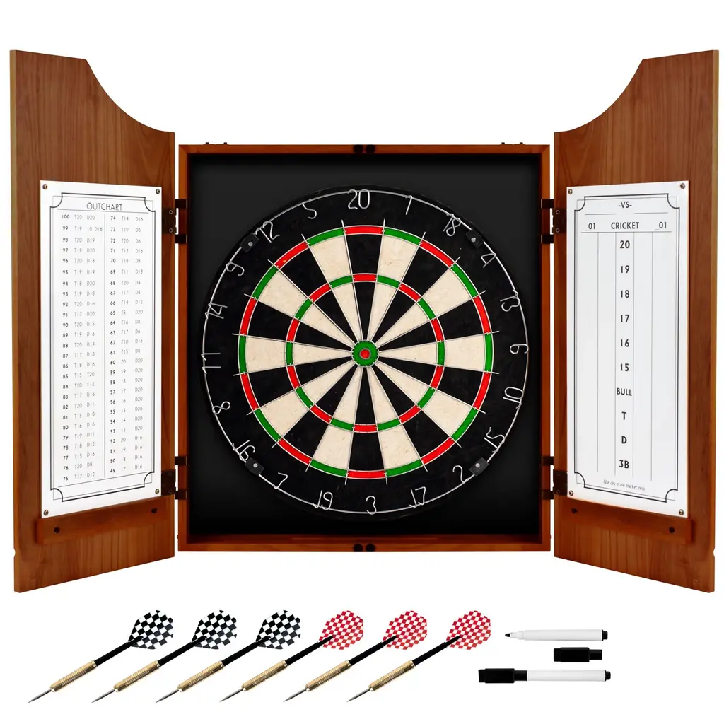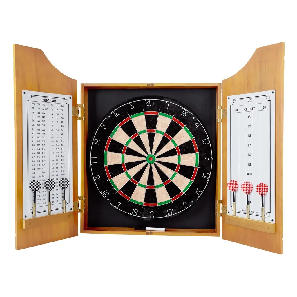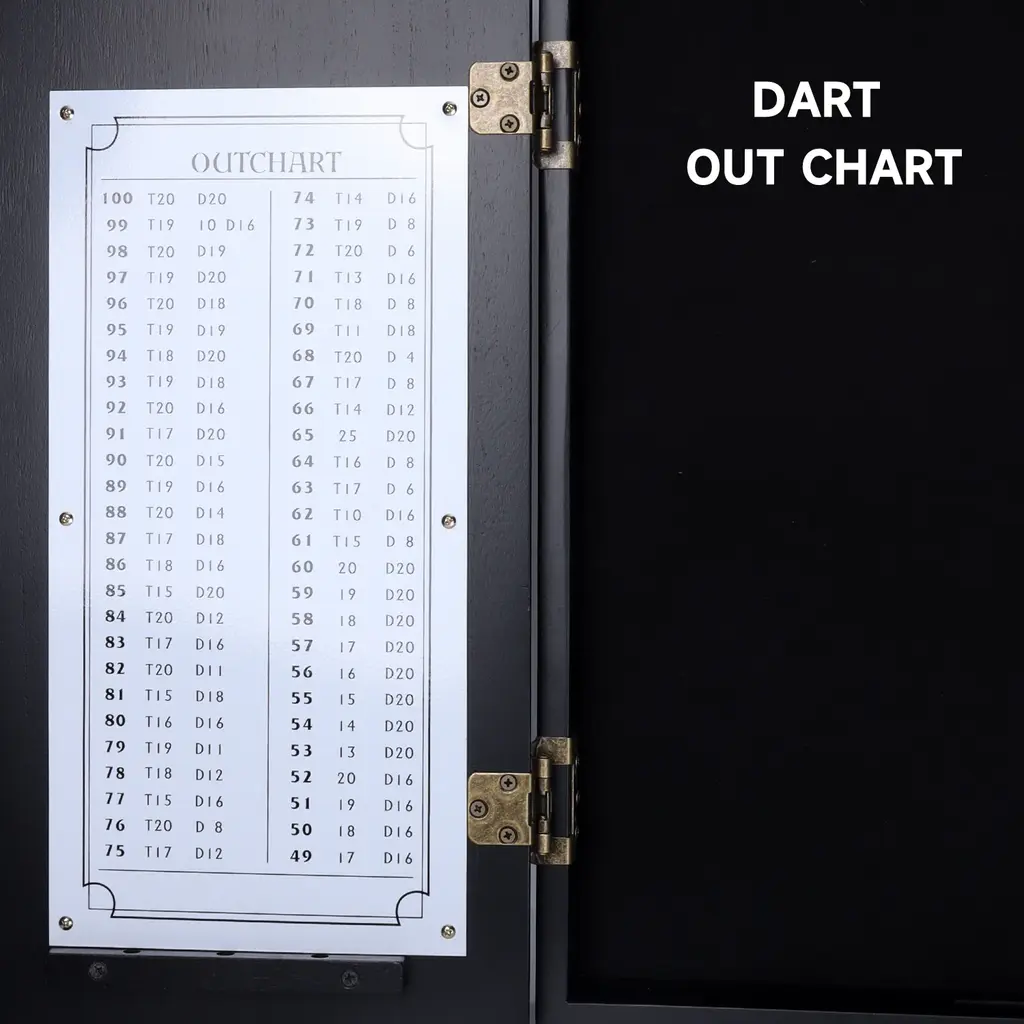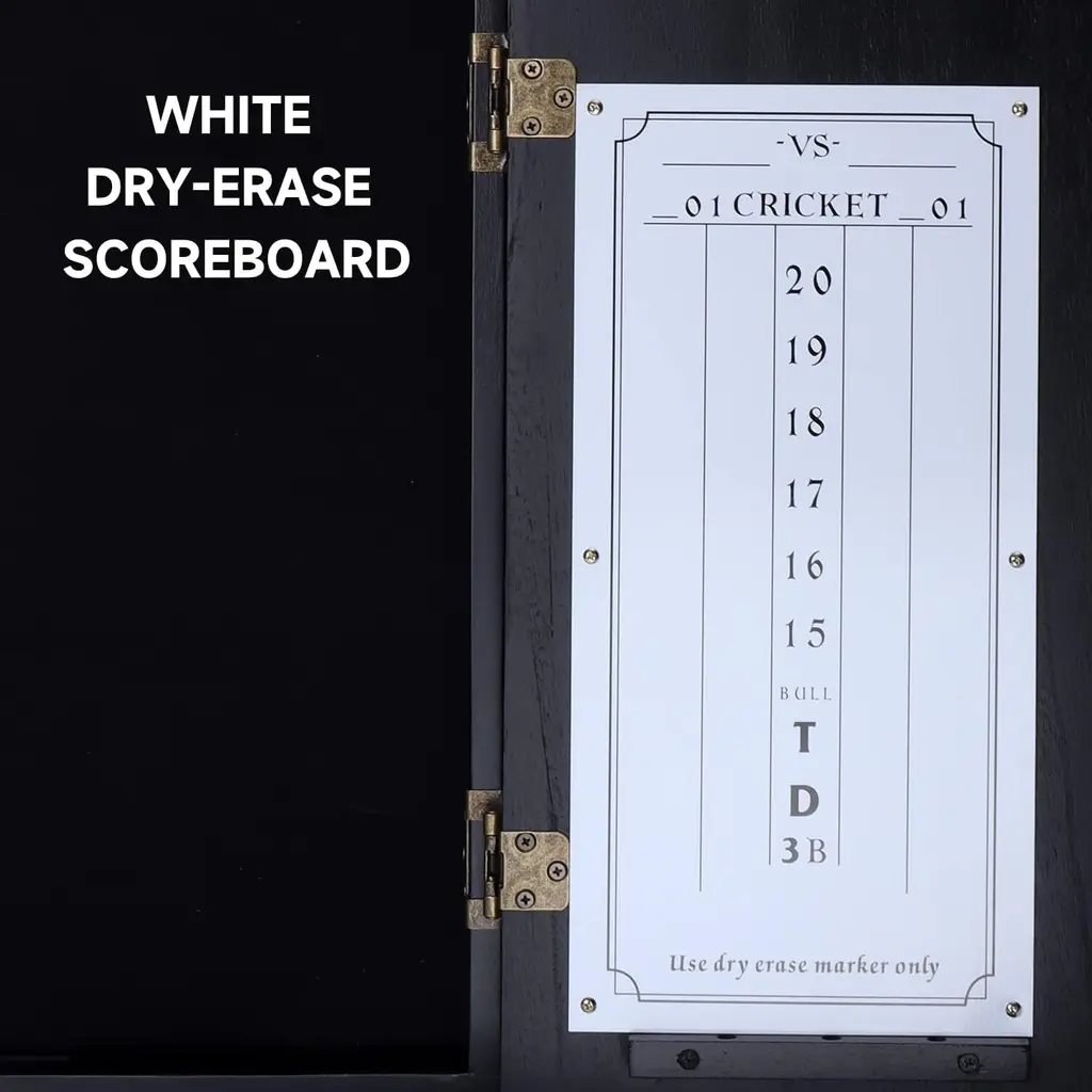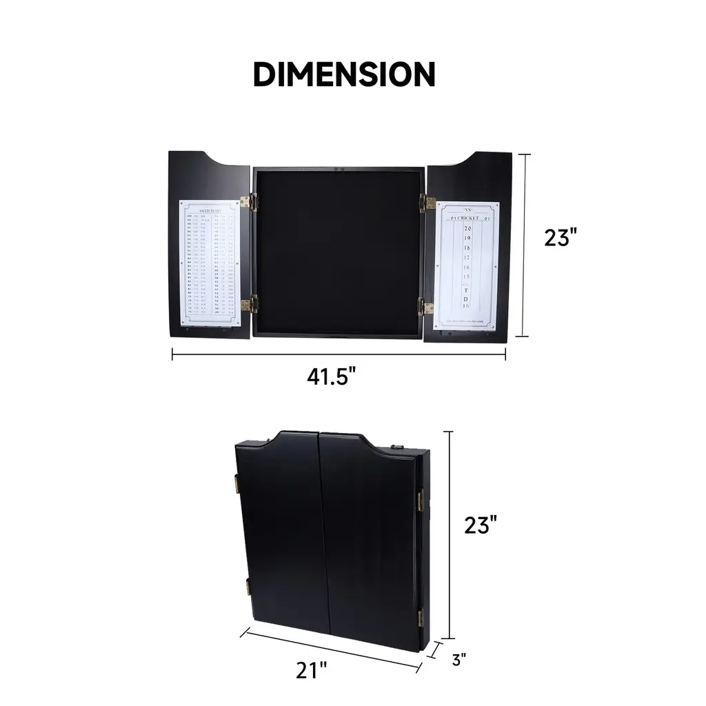 The GSE deluxe solid wood dartboard cabinet is made of New Zealand pine with a furniture-grade paint finish and has quality bronze self-closing hinges with bronze screws, with a white dry-erase scoreboard and a dart out chart for easily writing and erasing, measuring 41.5" L x 23" W x 3.5" D when opened, measuring 23" L x 21" W x 3.5"D when closed. The dart cabinet can be hung on any wall, protecting the wall from darts and hiding darts when not in use. It is great for game rooms, man caves, bars, etc.**The order comes with the dartboard cabinet ONLY, no dartboard, darts**