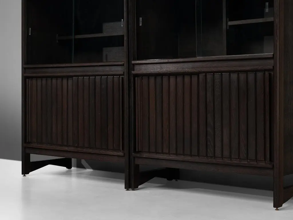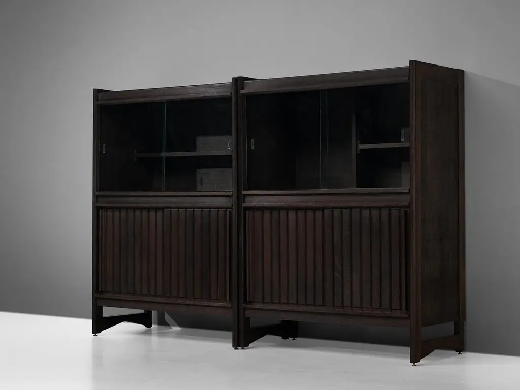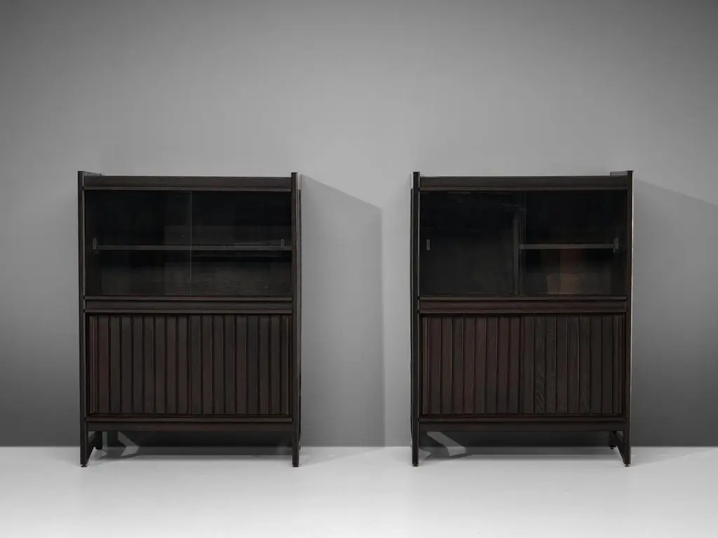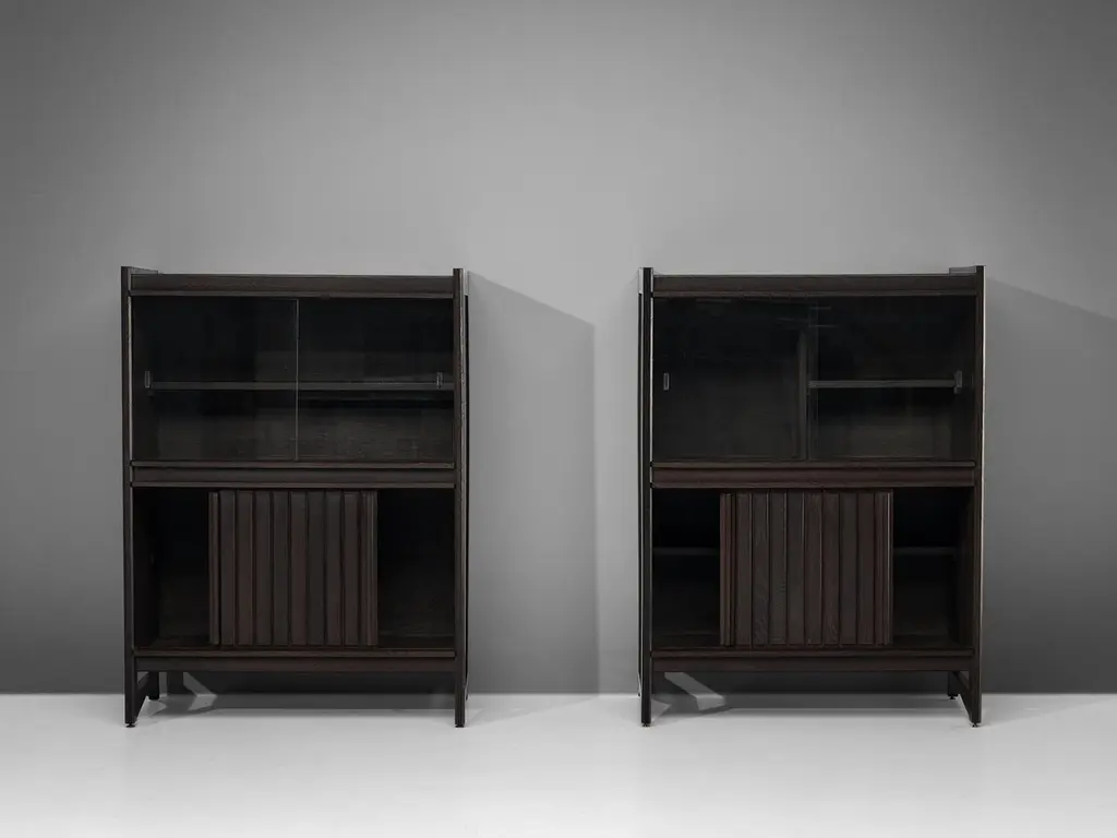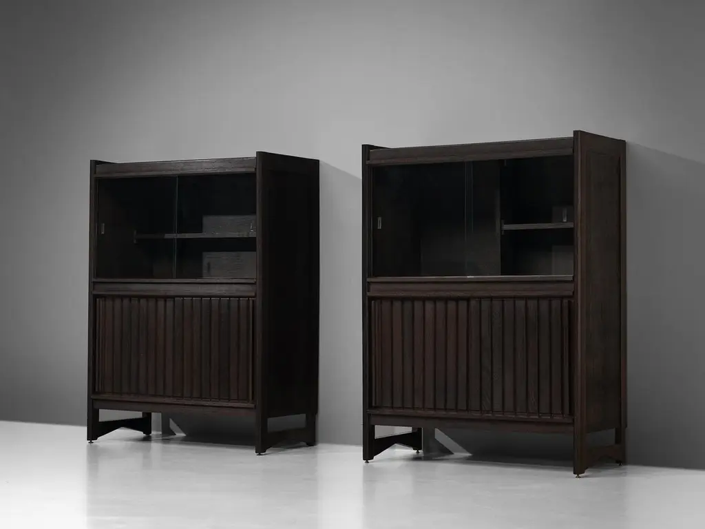 Guillerme & Chambron for Votre Maison, cupboards, stained oak, glass, France, 1960sThis sculptural cabinet is made by the designer duo Guillerme & Chambron. The piece is executed in solid, stained oak and features sculptural lines and edges. The piece holds different sections. The upper part has two glass doors, which can perfectly function to display decorative items. The lower part holds door that are perfect for extra storage space. The doors of the lower part are finished with geometric inlayed wood. This cabinet rests on four sturdy legs. Highly versatile high board with plenty of storage space.The French designer duo Jacques Chambron (1914-2001) and Robert Guillerme (1913-1990) started their production postwar. Robert Guillerme studied design and architecture at the École Boule and graduated first in his class in 1934. Meanwhile, Jacques Chambron graduated from the School of Applied Arts in Reims. During the Second World War, the two met in a stalag, a Prussian prisoner camp, while being imprisoned by the Germans in East Prussia and started a great friendship based on their intense and deep passion for interior design. In 1948, Chambron resigned from his job as a painter and decorator on the Rue Nollet in Paris to move to Lille, in the North of France and join Guillerme. A year later, the two met cabinetmaker Émile Dariosecq, who was the owner of a workshop close by. It was during this meeting, that they decided to create their own company. They named it “Votre Maison”, meaning “Your Home”, which became the soul of the company. With this, they wanted to create pieces that focused on functionality combined with a beautiful design useful for daily life, by which they created a worldwide reputation. Most of the furniture designed by this duo shows a strong character and has a great expressive woodwork. The three of them divided their work equally. Overall, Guillerme worked as a designer, Chambron as a commercial, and Dariosecq’s workshop manufactured the pieces. Throughout their career, ‘Votre Maison’ produced over two thousand models, leaving a lasting mark in the world of design.Please note that this item is in good, used condition. The lacquer on the cabinets shows signs of wear and use. Renewing of the lacquer can be done in our in-house atelier. For further details, we encourage you to reach out to our team of design specialists.The listed price is per item.