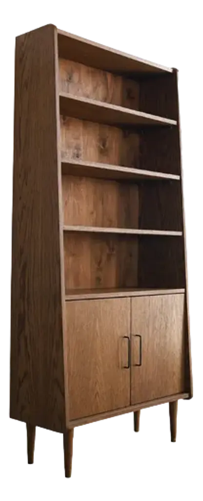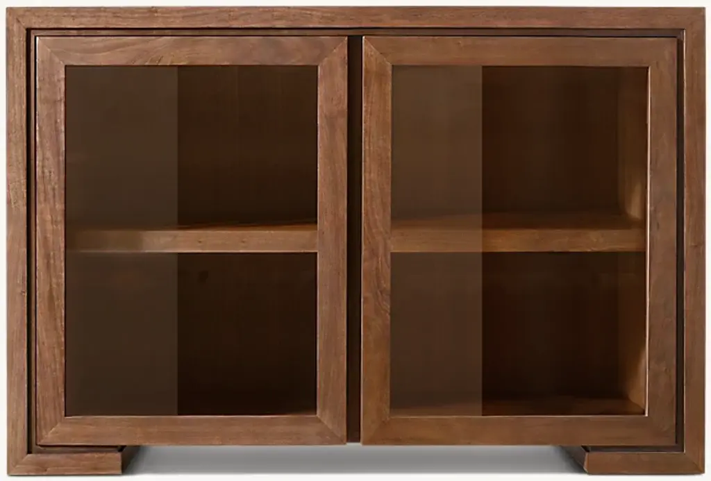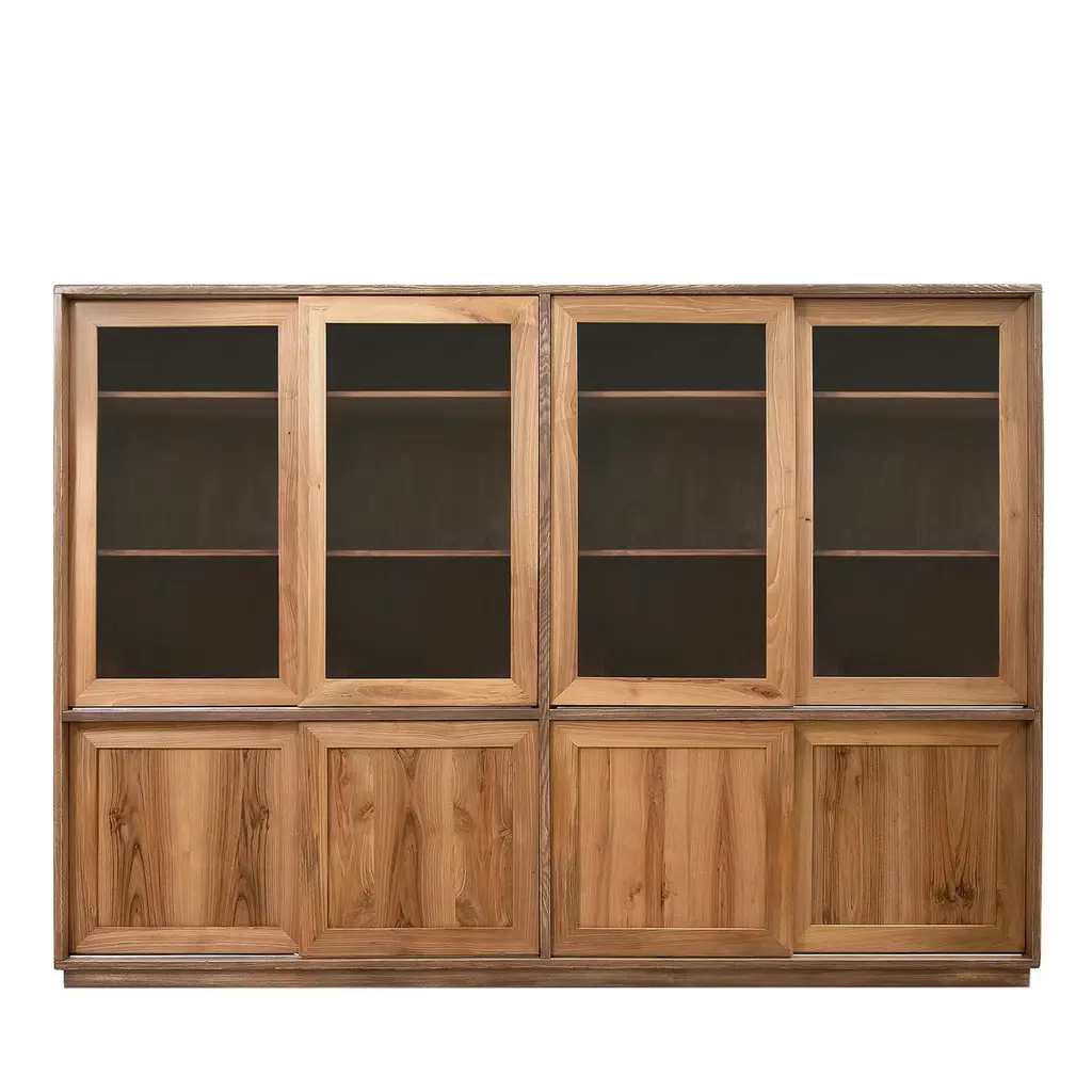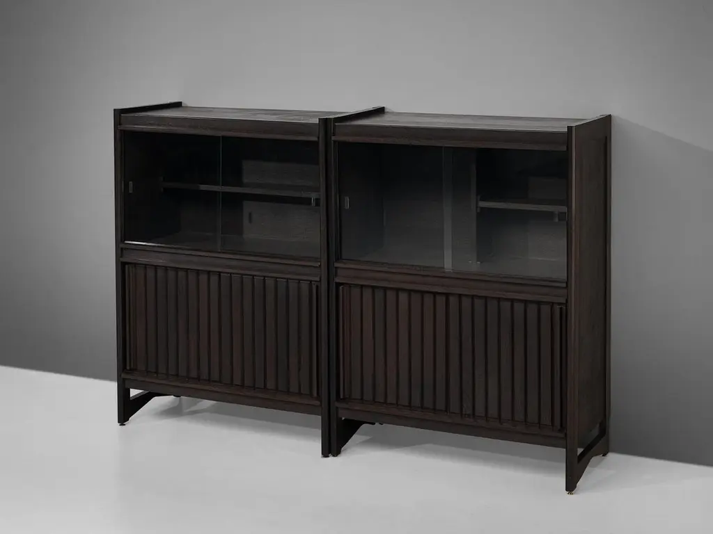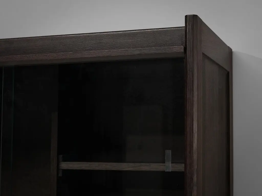 Guillerme & Chambron for Votre Maison, cupboards, stained oak, glass, France, 1960sThis sculptural cabinet is made by the designer duo Guillerme & Chambron. The piece is executed in solid, stained oak and features sculptural lines and edges. The piece holds different sections. The upper part has two glass doors, which can perfectly function to display decorative items. The lower part holds door that are perfect for extra storage space. The doors of the lower part are finished with geometric inlayed wood. This cabinet rests on four sturdy legs. Highly versatile high board with plenty of storage space.The French designer duo Jacques Chambron (1914-2001) and Robert Guillerme (1913-1990) started their production postwar. Robert Guillerme studied design and architecture at the École Boule and graduated first in his class in 1934. Meanwhile, Jacques Chambron graduated from the School of Applied Arts in Reims. During the Second World War, the two met in a stalag, a Prussian prisoner camp, while being imprisoned by the Germans in East Prussia and started a great friendship based on their intense and deep passion for interior design. In 1948, Chambron resigned from his job as a painter and decorator on the Rue Nollet in Paris to move to Lille, in the North of France and join Guillerme. A year later, the two met cabinetmaker Émile Dariosecq, who was the owner of a workshop close by. It was during this meeting, that they decided to create their own company. They named it “Votre Maison”, meaning “Your Home”, which became the soul of the company. With this, they wanted to create pieces that focused on functionality combined with a beautiful design useful for daily life, by which they created a worldwide reputation. Most of the furniture designed by this duo shows a strong character and has a great expressive woodwork. The three of them divided their work equally. Overall, Guillerme worked as a designer, Chambron as a commercial, and Dariosecq’s workshop manufactured the pieces. Throughout their career, ‘Votre Maison’ produced over two thousand models, leaving a lasting mark in the world of design.Please note that this item is in good, used condition. The lacquer on the cabinets shows signs of wear and use. Renewing of the lacquer can be done in our in-house atelier. For further details, we encourage you to reach out to our team of design specialists.The listed price is per item.