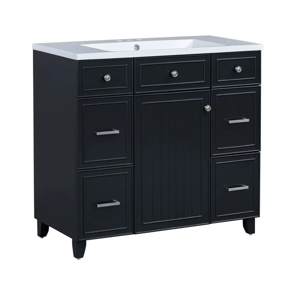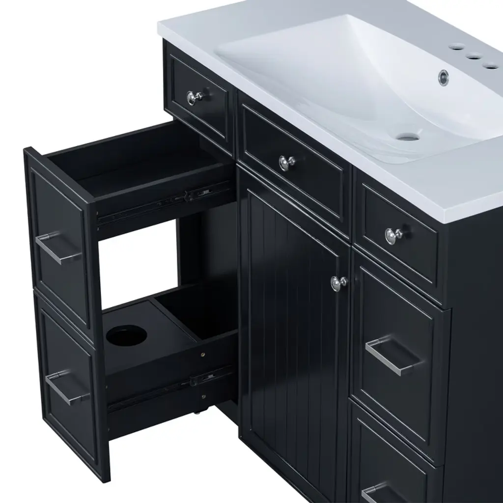 Upgrade your bathroom with the Gulches 36" Bathroom Vanity Cabinet in sleek black. Crafted from a solid wood frame and high-quality MDF, this cabinet offers exceptional stability and durability. Enjoy versatile storage with a connected drawer for hair tools and a separate drawer for towels, plus a spacious middle cabinet for cleaning supplies. The elegant design, featuring silver handles, adds a touch of sophistication to your space, while soft-close doors ensure quiet operation.