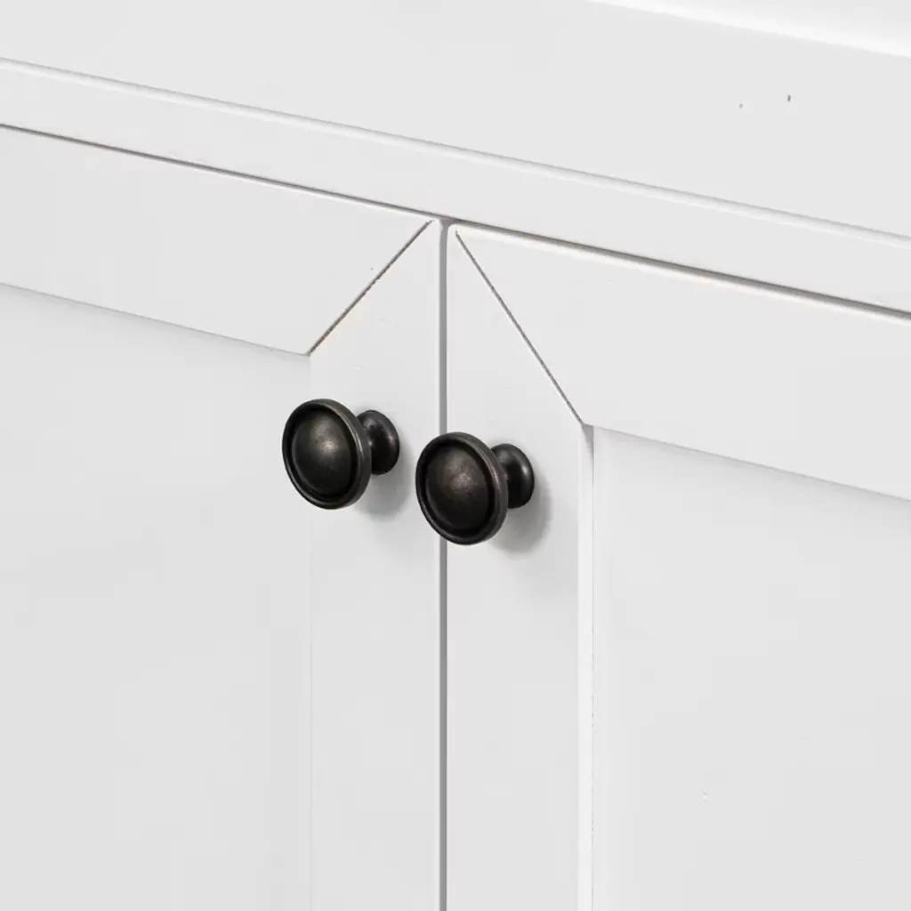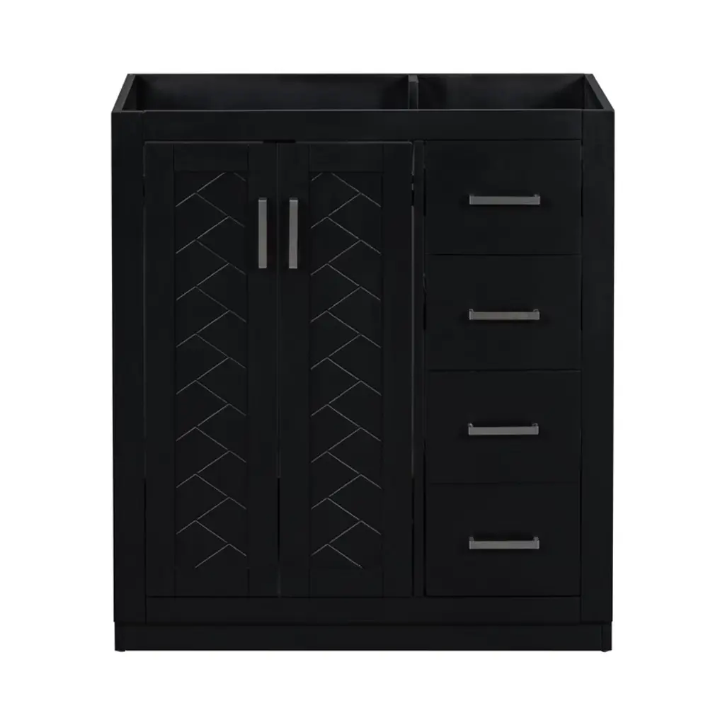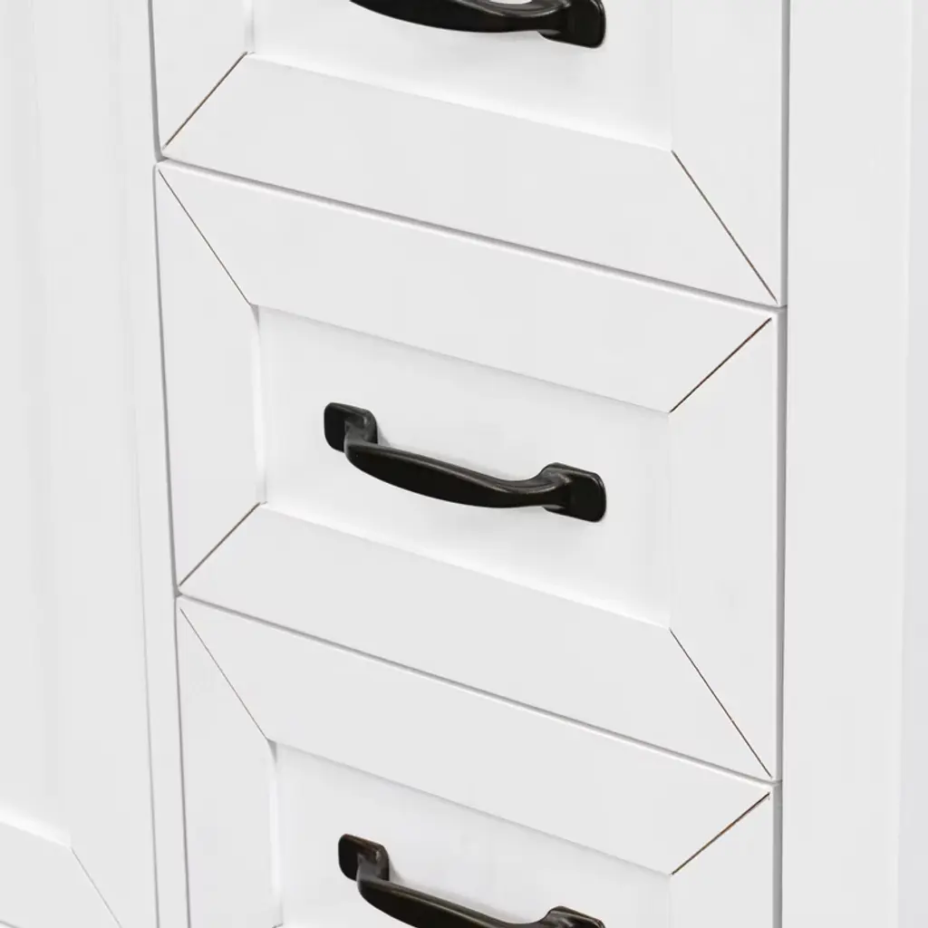 Elevate your bathroom with the Gulches 36" Bathroom Vanity Cabinet Base, designed to complement any decor style. This freestanding white cabinet features elegant black handles and a unique groove design that enhances its aesthetic appeal. Crafted from solid rubber wood and MDF, it offers exceptional durability and stability. With ample storage, including a cabinet with two doors and three drawers, you can keep your bathroom essentials organized and dust-free. The eco-friendly finish ensures easy cleaning and long-lasting beauty.