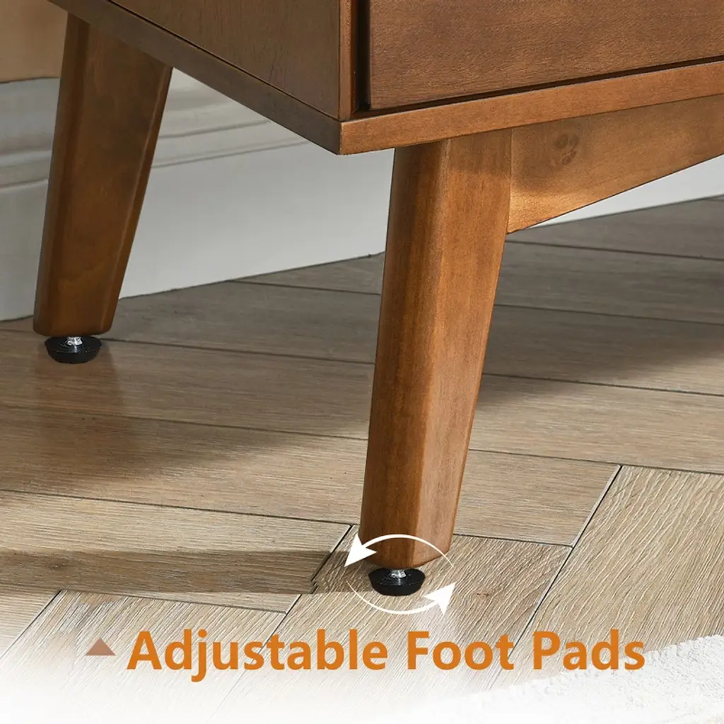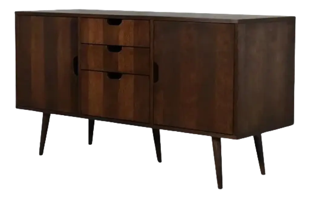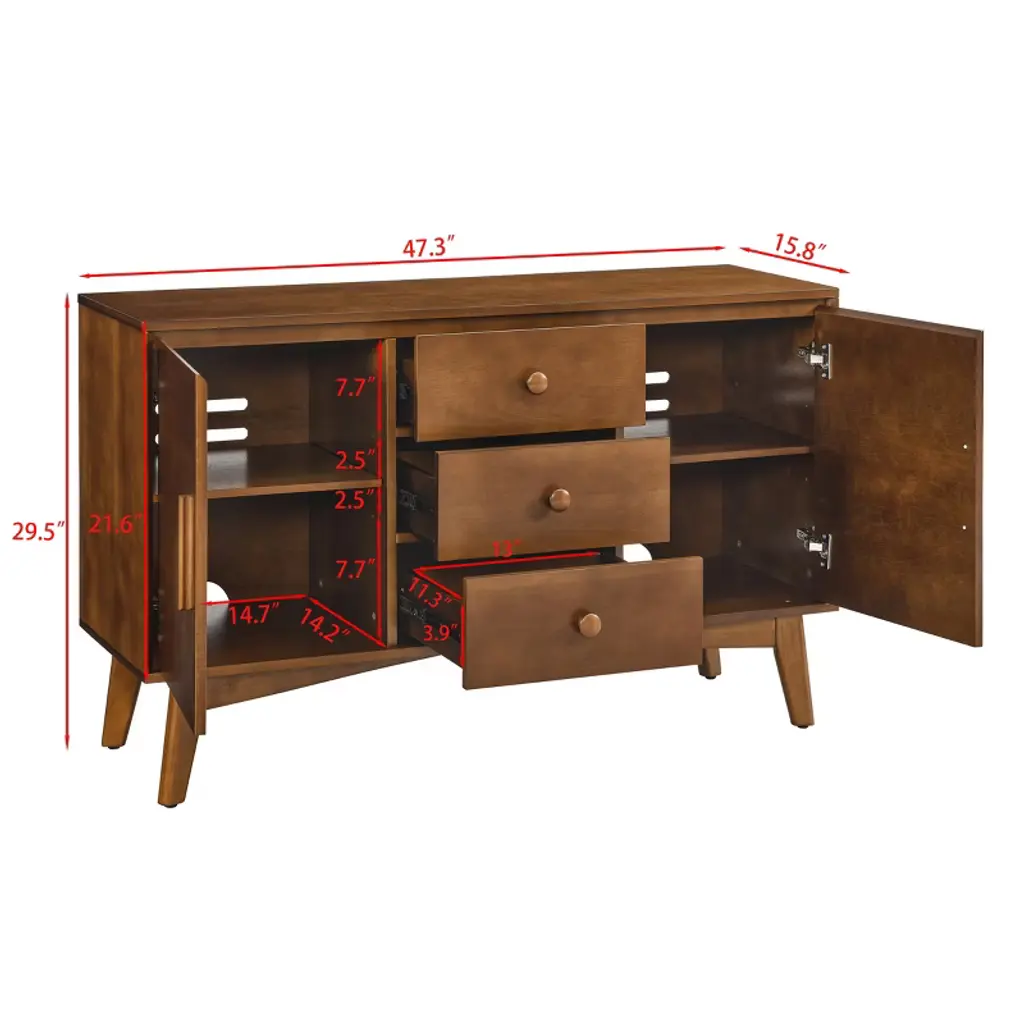 The Gulches Mid Century Modern Sideboard Buffet Cabinet offers exceptional storage capacity and timeless design for your home This walnut finished cabinet combines vintage charm with contemporary functionality featuring two spacious cabinet doors and three convenient drawers that provide versatile organization options for various household items The rich wood grain finish and mid century modern aesthetics make this piece suitable for multiple interior styles from rustic farmhouse to contemporary decor ensuring it enhances any room in your home Measuring 47 inches in width 30 inches in height and 16 inches in depth this substantial console table provides ample storage space while maintaining an elegant profile that fits perfectly in living rooms dining areas or kitchens Constructed with durability as a priority the cabinet features a sturdy P2 grade MDF body with a thick solid wood frame base and solid wood feet that significantly increase its weight capacity and overall stability The lead free eco friendly paint finish ensures safety and environmental responsibility while providing resistance to daily wear and tear The cabinets versatile design allows it to store everything from fine china and kitchenware to books decorative items and storage baskets keeping your essentials organized and easily accessible The large rounded edges and meticulous craftsmanship create a sense of elegance and serenity transforming any bland corner into a stylish focal point Assembly is straightforward with all necessary hardware tools and clear instructions included typically requiring just 15 to 30 minutes to complete Maintenance is equally simple requiring only occasional wiping with a soft lint free cloth and water to maintain its beautiful appearance This Gulches sideboard serves as both a functional storage solution and an attractive accent piece perfect for use as a buffet server in the dining room a media console in the living room or additional storage in the kitchen