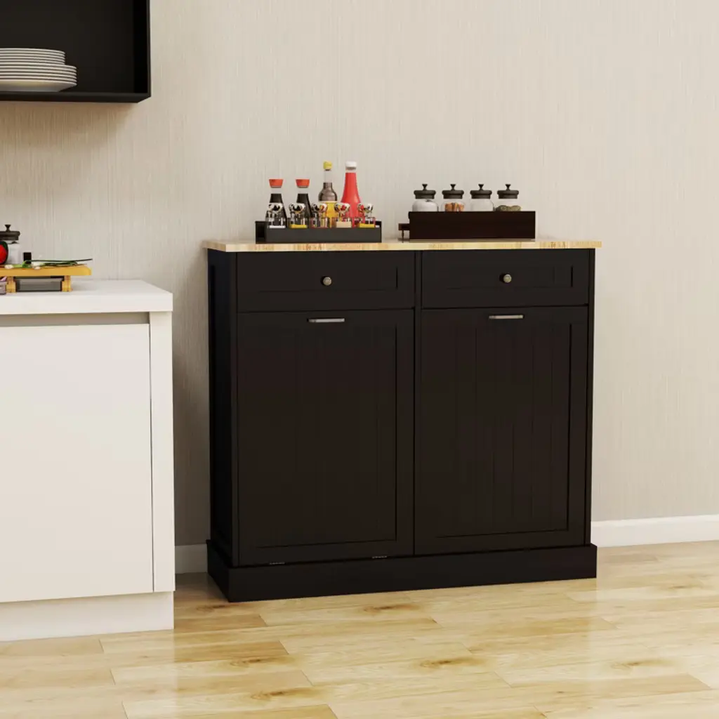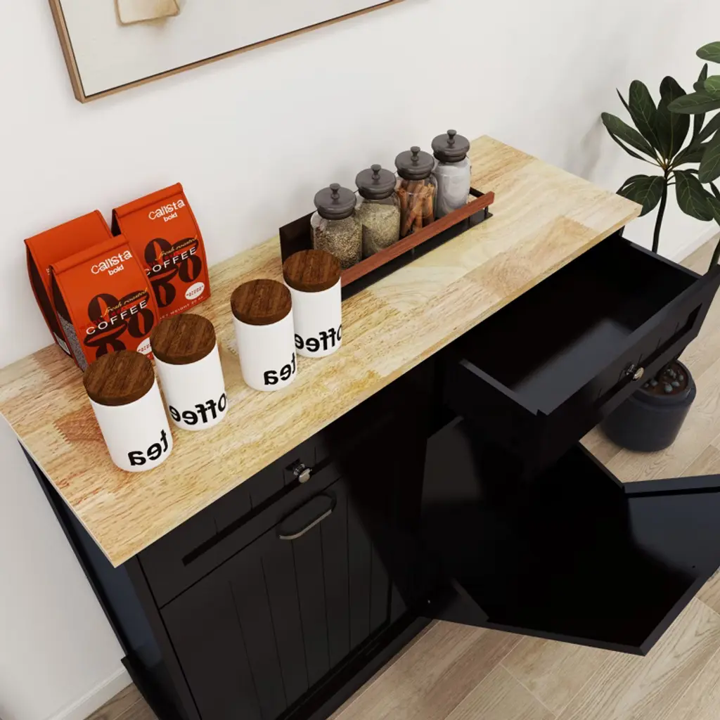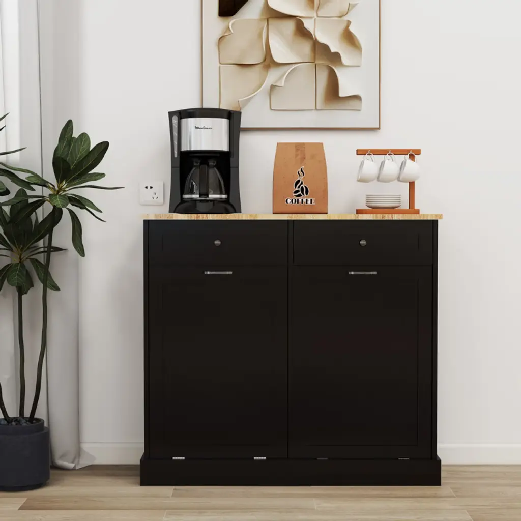 The Gulches Single Drawer Tilt Out Trash Cabinet provides an elegant waste management solution that combines functionality with sleek modern design This white cabinet crafted from durable E1 grade MDF features a versatile style suitable for various home decors while effectively concealing household waste Measuring 20 inches in height 36 inches in width and 14 inches in depth this compact unit accommodates standard 10 gallon trash cans while maximizing space efficiency in kitchens laundry rooms or utility areas The cabinet features a smooth operating drawer ideal for storing kitchen supplies pet food or cleaning materials alongside a discreet tilt out compartment that completely hides trash and recycling bins from view The UV painted finish undergoes three meticulous coating processes creating a flawless surface that resists moisture and maintains its pristine appearance over time unlike traditional wood that may warp The tabletop provides a stable surface capable of supporting up to 70 pounds perfect for coffee makers photo frames small plants or other decorative items while keeping your essentials organized This innovative design not only conceals unattractive trash cans but also prevents pets from knocking them over contains odors effectively and maintains a clean floor environment The cabinet can function as a standalone unit or integrate seamlessly with existing kitchen islands extending your workspace and providing additional functionality where needed The environmentally conscious UV painting process minimizes carbon emissions making this an eco friendly choice for modern households Assembly requires approximately 80 minutes with all necessary hardware screws and detailed instructions included in the package Components are pre drilled and pre cut for straightforward installation though using an electric drill is recommended for easier assembly while carefully following positioning guidelines to avoid surface damage
