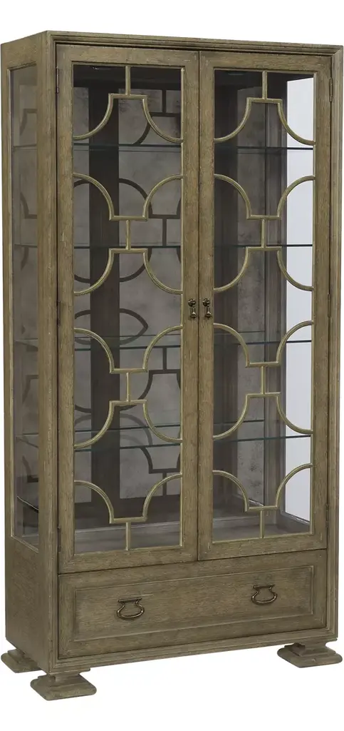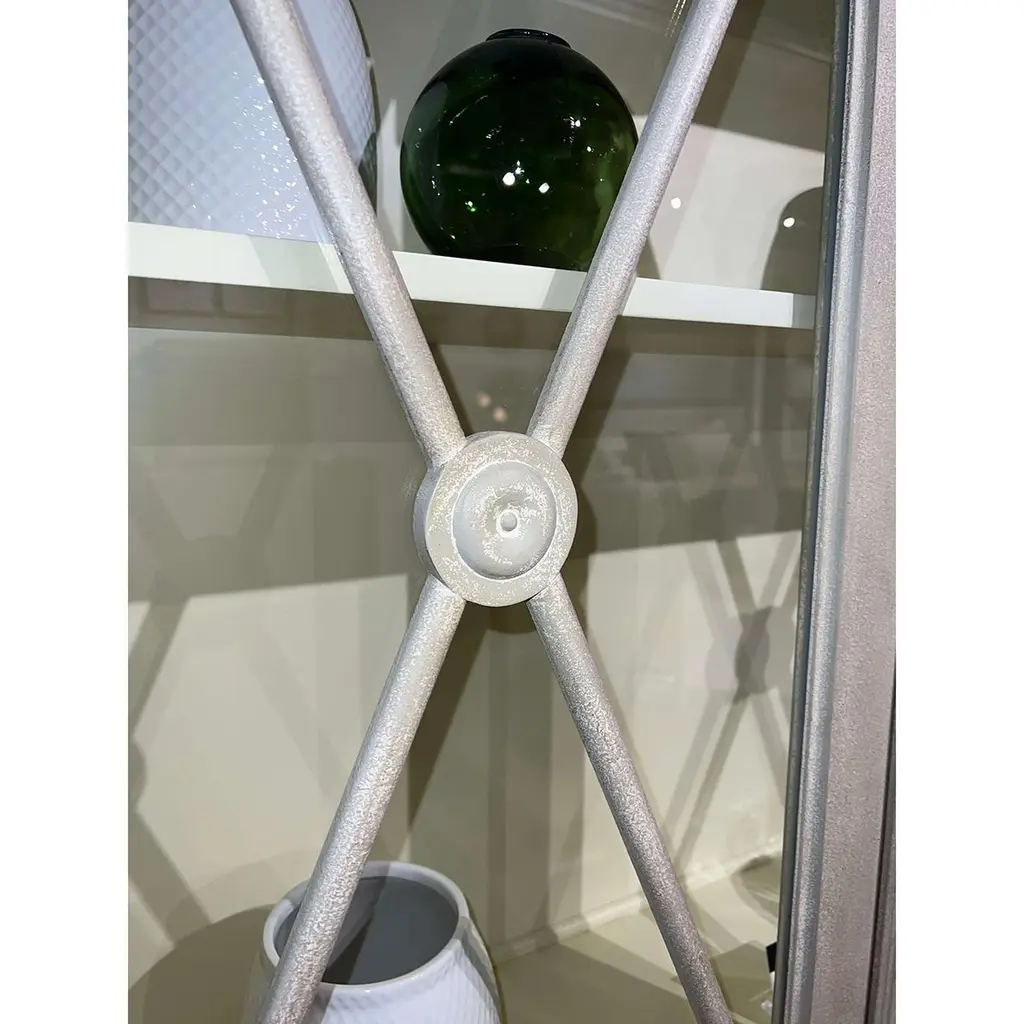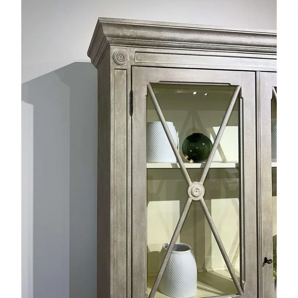 Its hand-painted antique grey distressed finish lends an air of antiquity. Designed to showcase your most treasured collections, this bookcase features four adjustable shelves and a fixed middle shelf, offering ample space for curated displays. Whether placed in a grand dining room, an elegant library, or a distinguished living space, this cabinet seamlessly enhances its surroundings with understated luxury.Dimensions: 52" W x 14" D x 85" H
