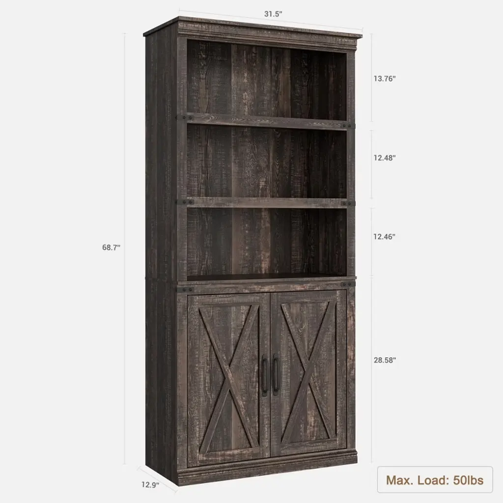 Gustowave 5 Tier Book Shelf, Farmhouse Book Case With Cabinet, 68.7" Tall Book Shelf With Storage Doors, Wooden 5 Shelf Book Case,dark Oak