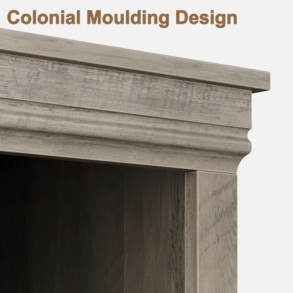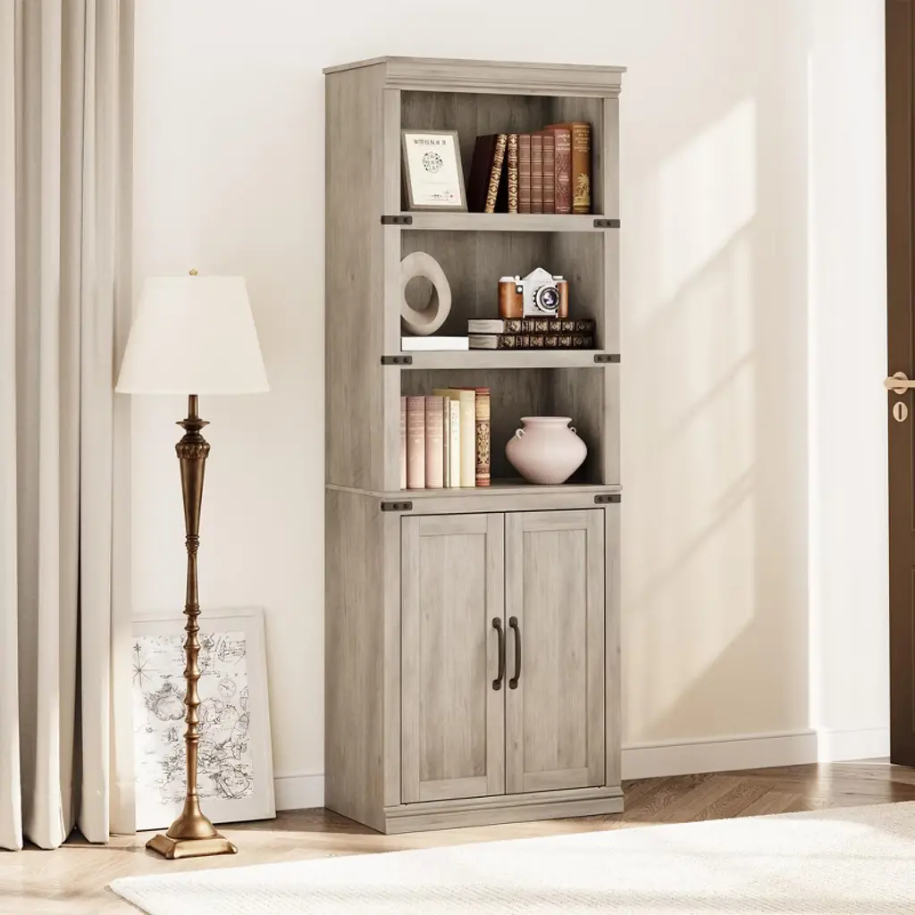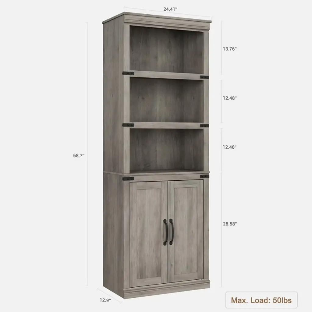 Gustowave 5 Tier Book Shelf, Farmhouse Book Case With Cabinet, 68.7" Tall Book Shelf With Storage Doors, Wooden 5 Shelf Book Case,grey