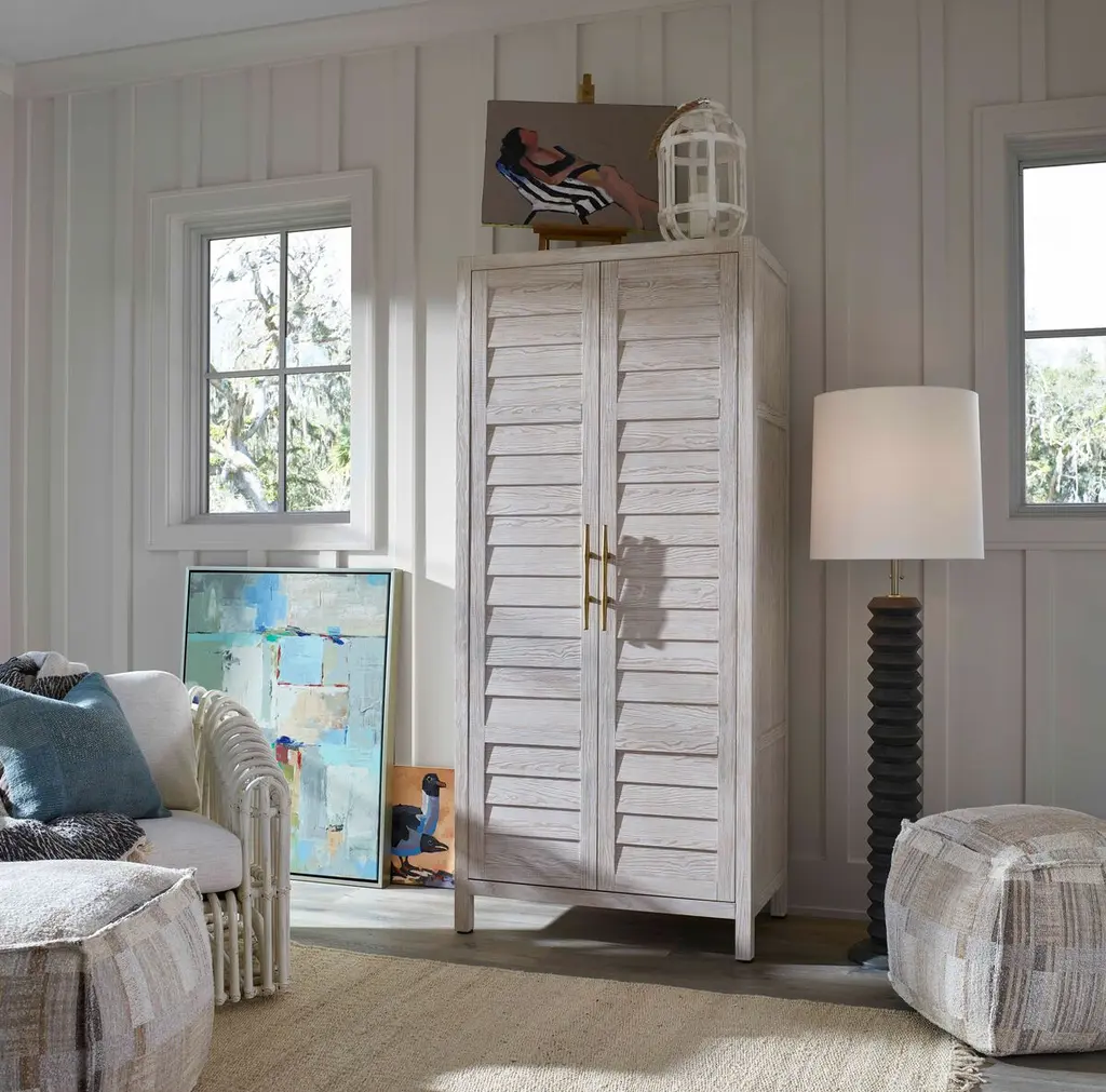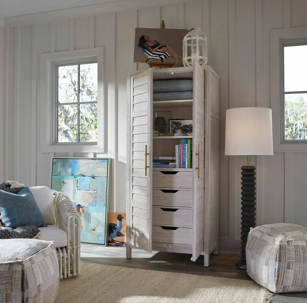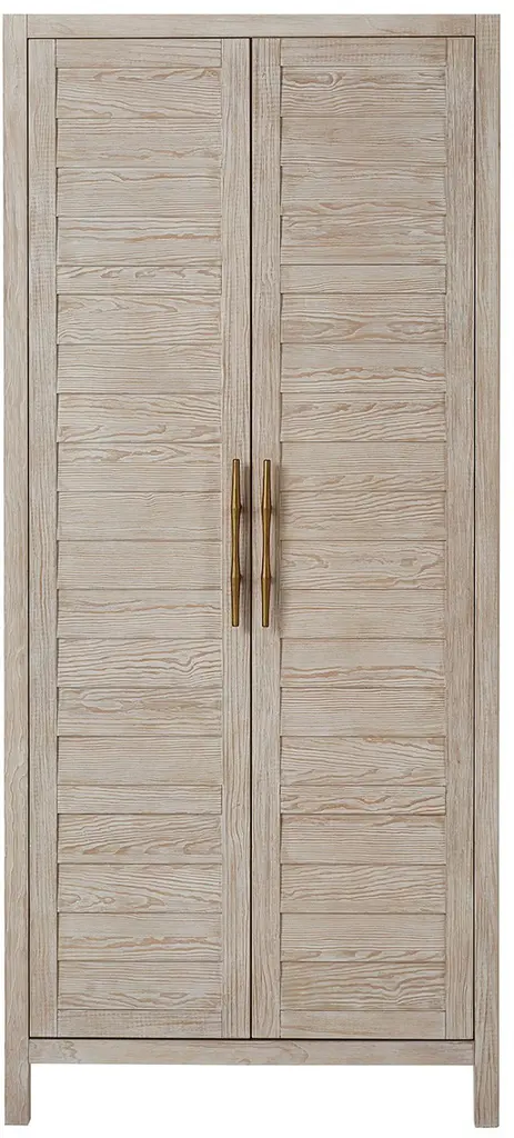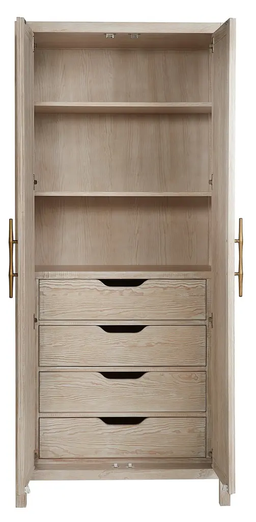 This versatile cabinet is crafted of durable, scratch-resistant oak; the whitewash finish accentuates the wood's distinctive grain beautifully, while the golden door pulls add timeless elegance. Behind the two doors are four drawers, two adjustable shelves, and a fixed shelf.