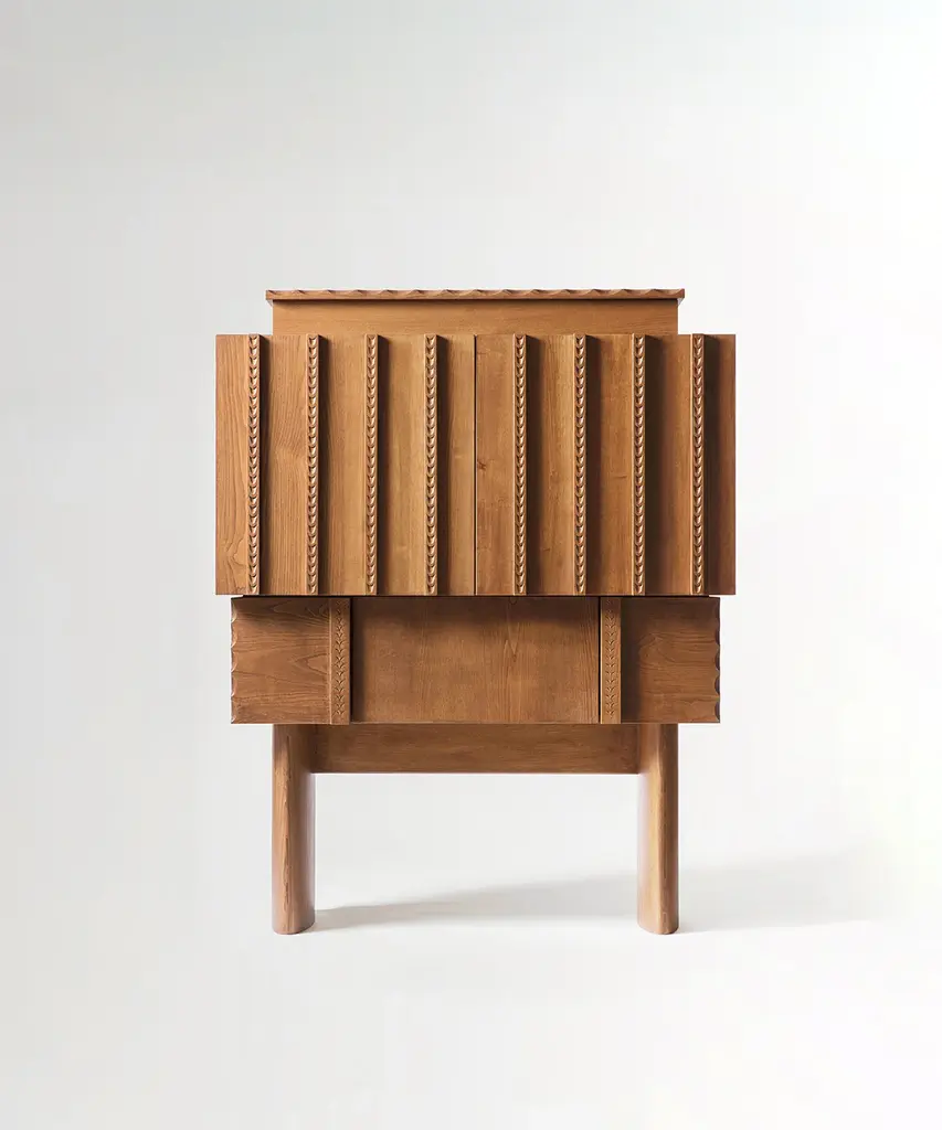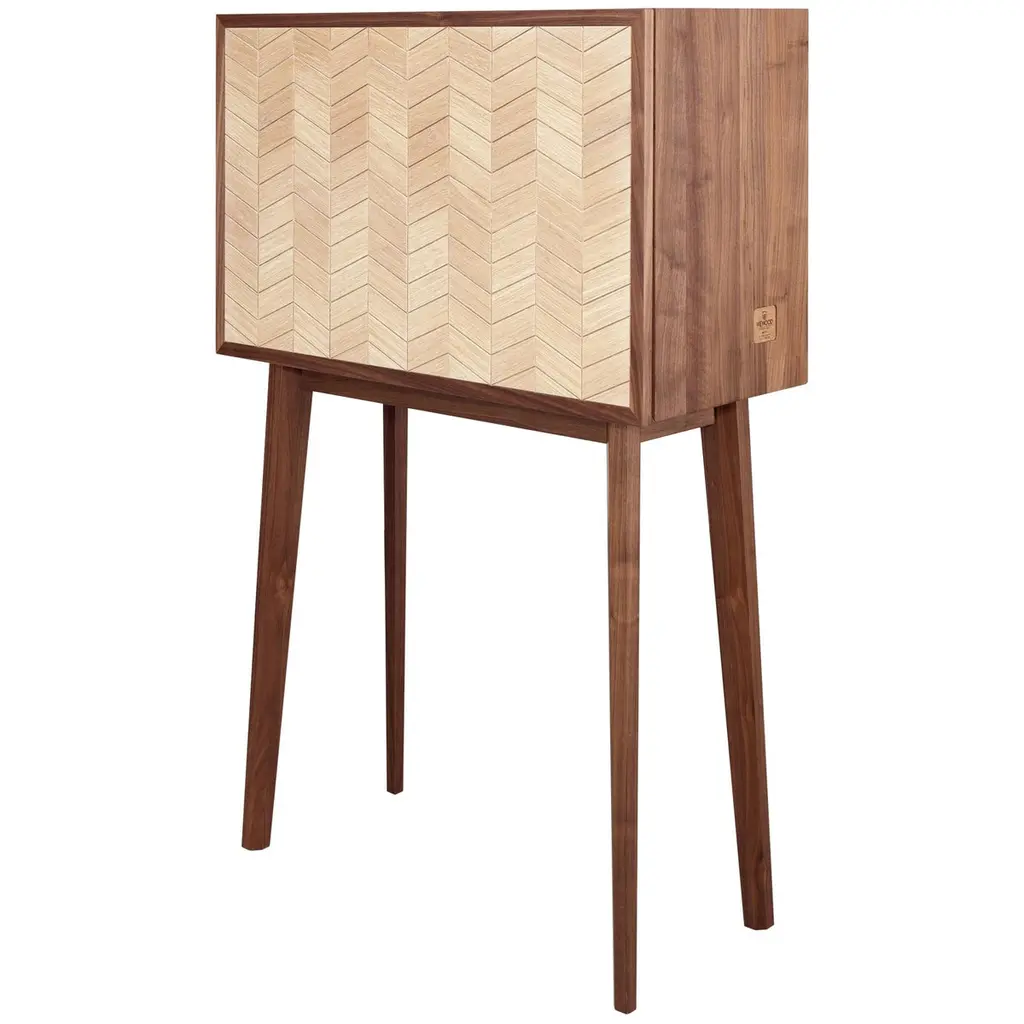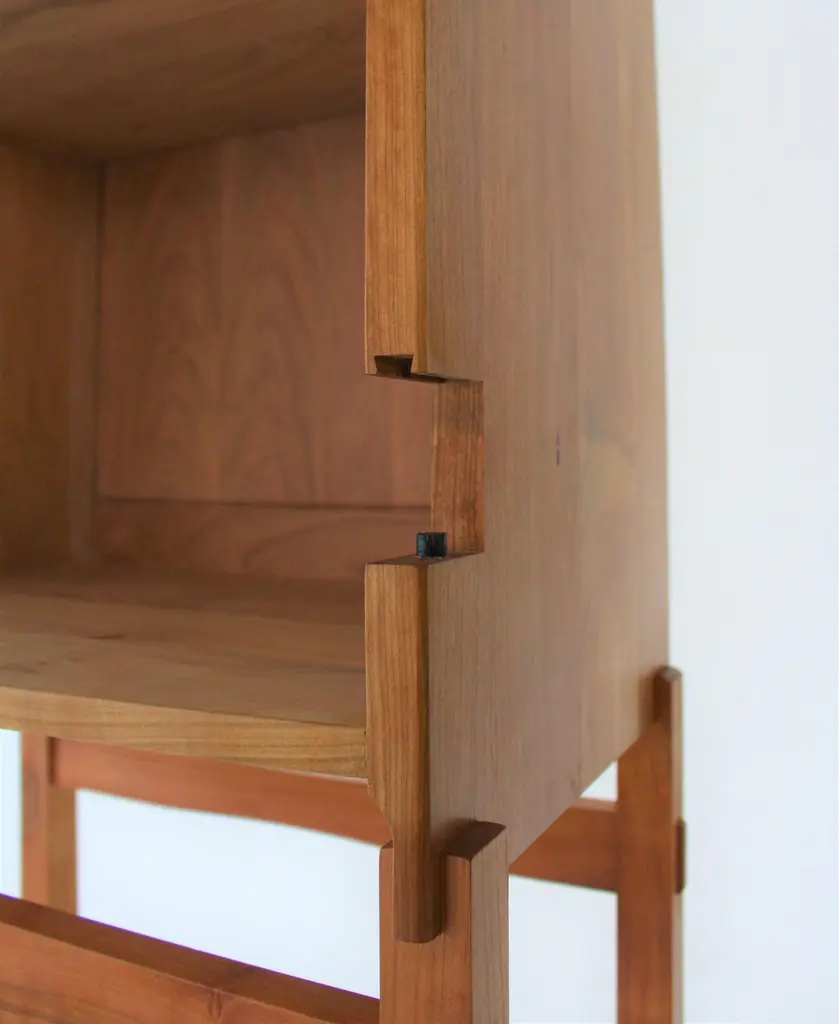 This present but very quiet-looking cabinet Cabinet is a celebration of simplicity. Through subtle lines and minimal design language, the wood and the connections are given the space to tell their story. Due to the subtle curves in the design language, this cabinet looks friendly and inviting, The light base lifts the hull and the doors to human height. That makes this piece of furniture ideal for storing or exhibiting beautiful items. The doors are made of two mirrored parts, split from the same piece of wood for a symmetrical grain drawing, and reinforced with cling crafted with traditional hand-shaved sliding swallowtails. The clamps flow into the hinged part that rests in the hull on a hardwood pin and rotates, purely on friction and gravity. By means of the locks with sliding swallowtails, these are removable. The hull is also gravity in the chassis and completely removable. As a whole, this cabinet is both a practical and aesthetic enrichment for its environment. Born love, fascination and cherishing the old craft.