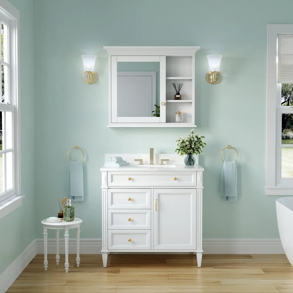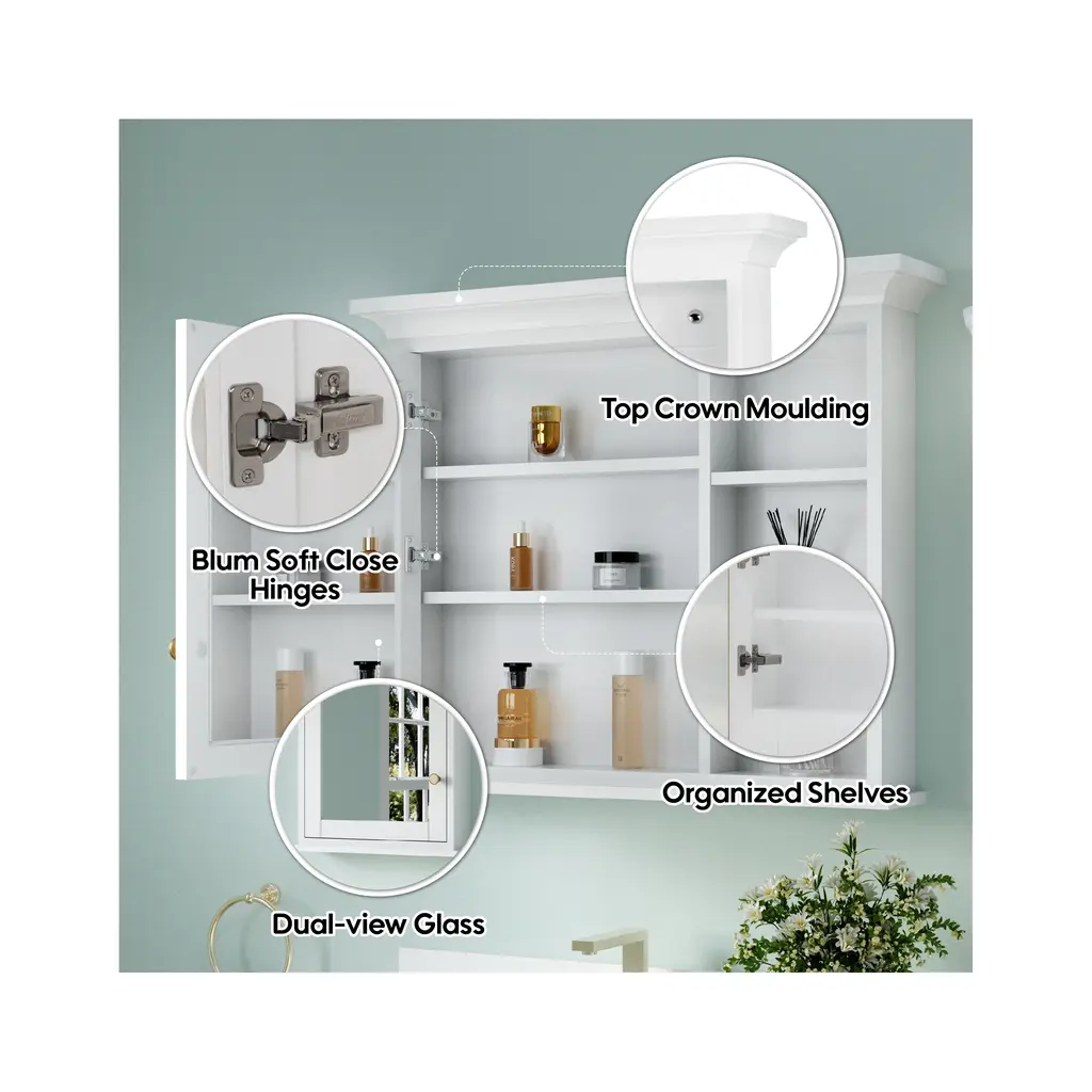 Durable Solid Wood Frame: Constructed from high-quality, solid rubber wood, this mirror cabinet boasts exceptional durability and a timeless, classic look.Soft-Close Door: The soft-close door opens and closes smoothly and quietly, preventing slamming and extending the life of your cabinet.Multiple Shelves: With 2 interior shelves and 2 exterior shelves, perfect for organizing and storing your toiletries, cosmetics, and other bathroom necessities.Metal Alloy Hardware with Decorative Porcelain: The cabinet features metal alloy hardware adorned with decorative porcelain accents, adding a touch of vintage charm to its modern functionality.Austria BLUM Soft-Close Hinges System: Equipped with premium Austria BLUM soft-close hinges, ensuring smooth and silent door operation.