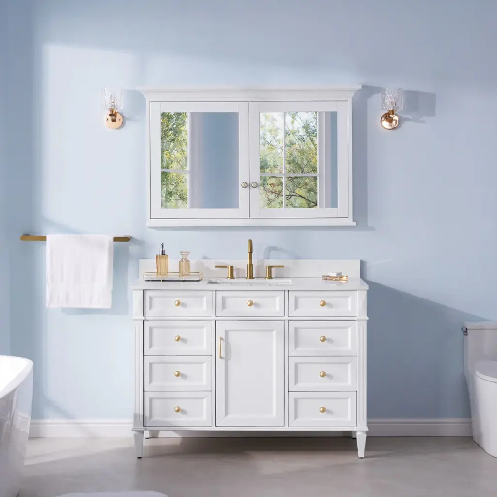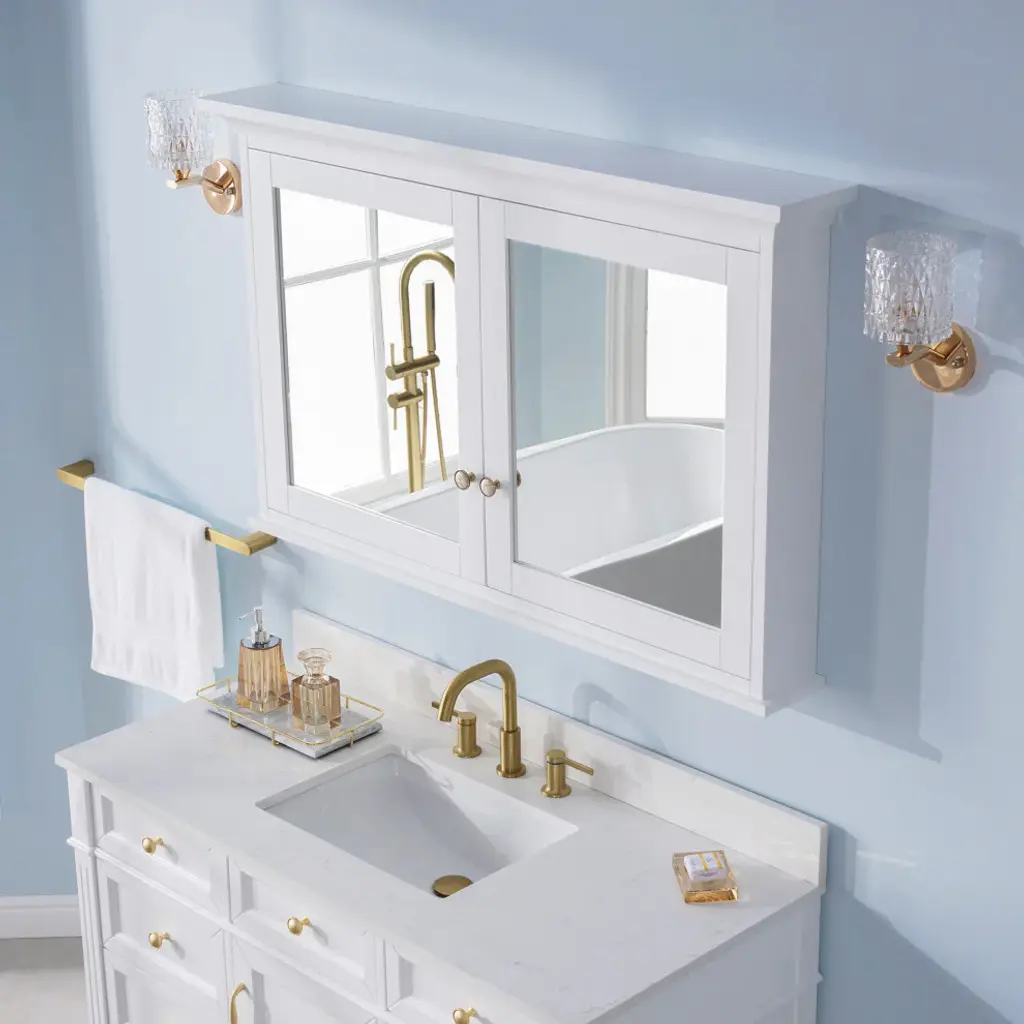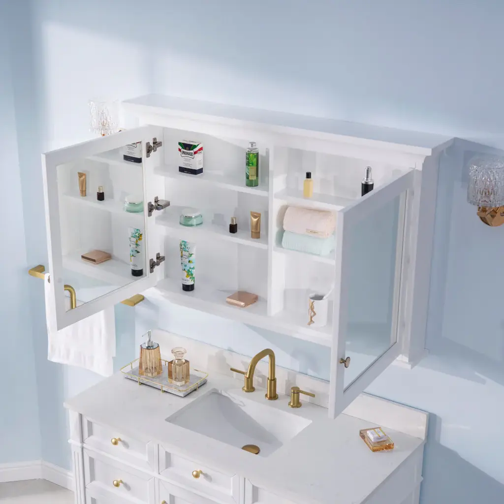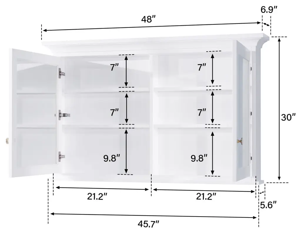 1. Durable Solid Wood Frame: Constructed from high-quality, solid rubber wood, this mirror cabinet boasts exceptional durability and a timeless, classic look.2. Soft-Close Door: The soft-close door opens and closes smoothly and quietly, preventing slamming and extending the life of your cabinet.4. Multiple Shelves: With 4 interior shelves, perfect for organizing and storing your toiletries, cosmetics, and other bathroom necessities.5. Metal Alloy Hardware with Decorative Porcelain: The cabinet features metal alloy hardware adorned with decorative porcelain accents, adding a touch of vintage charm to its modern functionality.6. Austria BLUM Soft-Close Hinges System: Equipped with premium Austria BLUM soft-close hinges, ensuring smooth and silent door operation.