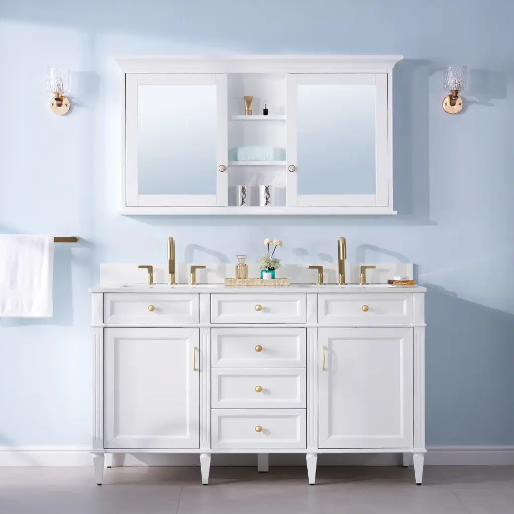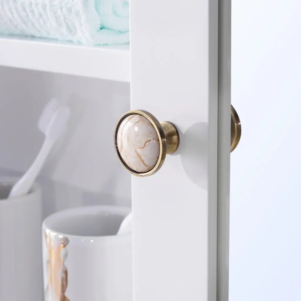 1. Durable Solid Wood Frame: Constructed from high-quality, solid rubber wood, this mirror cabinet boasts exceptional durability and a timeless, classic look.2. Soft-Close Door: The soft-close door opens and closes smoothly and quietly, preventing slamming and extending the life of your cabinet.4. Multiple Shelves: With 4 interior shelves and 2 exterior shelves, perfect for organizing and storing your toiletries, cosmetics, and other bathroom necessities.5. Metal Alloy Hardware with Decorative Porcelain: The cabinet features metal alloy hardware adorned with decorative porcelain accents, adding a touch of vintage charm to its modern functionality.6. Austria BLUM Soft-Close Hinges System: Equipped with premium Austria BLUM soft-close hinges, ensuring smooth and silent door operation.