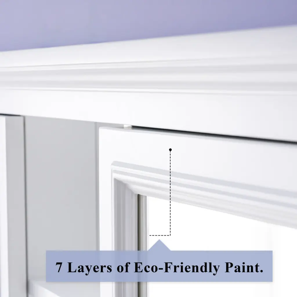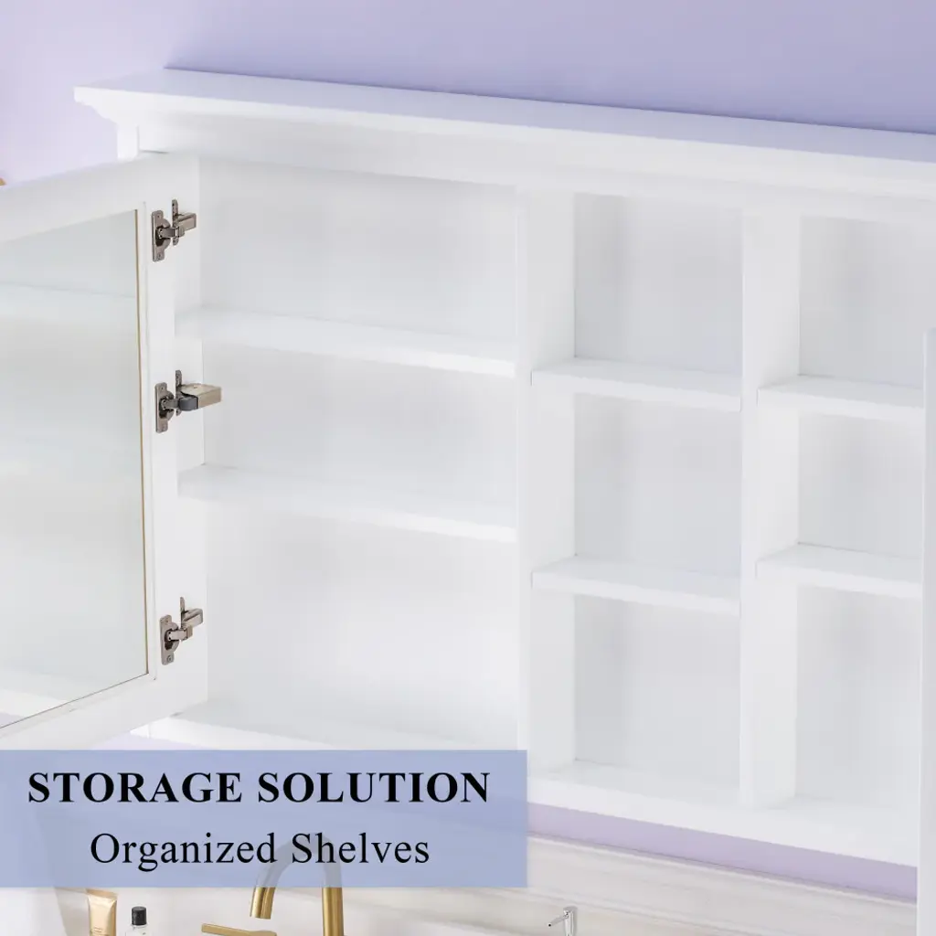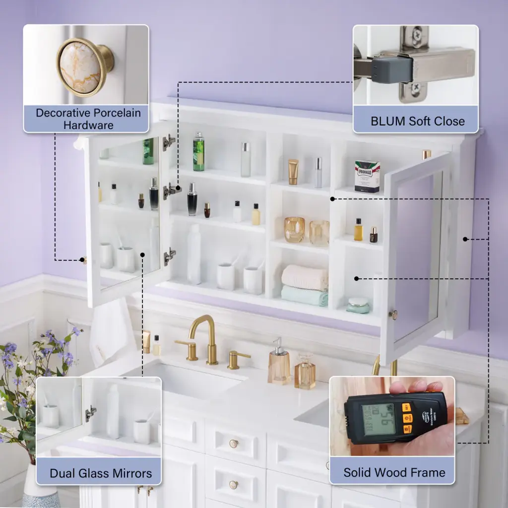 Durable Solid Wood Frame: Constructed from high-quality solid wood, ensuring longevity and a sturdy build.Soft-Close Door: Features 2 soft-close doors to prevent slamming and reduce wear.Elegant Storage Solution: Equipped with 4 interior solid wood shelves and 2 exterior solid wood shelves, providing ample space for toiletries and essentials.Metal Alloy Hardware with Porcelain Accents: Decorative metal alloy hardware paired with porcelain accents for a refined look.Premium Hinge System: Germany Hettich soft-close hinges offer smooth and quiet door operation.Z-Bar Hangs Vertically: The mirror cabinet features a Z-bar for secure and easy vertical wall mounting, saving space while adding both function and style to your bathroom.
