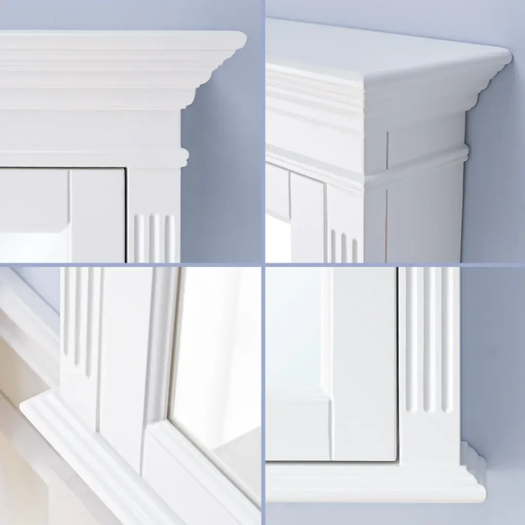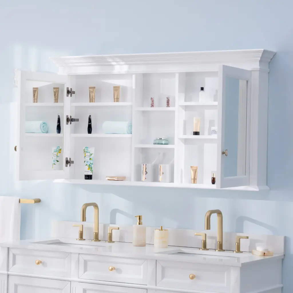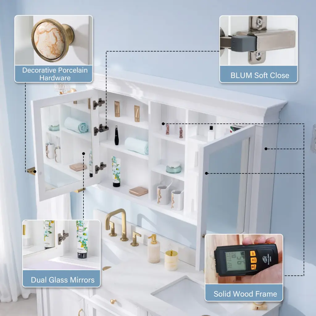 Durable Solid Wood Frame: Constructed from high-quality solid wood, ensuring longevity and a sturdy build.Soft-Close Door: Features 2 soft-close doors to prevent slamming and reduce wear.Elegant Storage Solution: Equipped with 2 exterior solid wood shelves and 4 interior solid wood shelves, providing ample space for toiletries and essentials.Metal Alloy Hardware with Porcelain Accents: Decorative metal alloy hardware paired with porcelain accents for a refined look.Premium Hinge System: Germany Hettich soft-close hinges offer smooth and quiet door operation.Z-Bar Hangs Vertically: The mirror cabinet features a Z-bar for secure and easy vertical wall mounting, saving space while adding both function and style to your bathroom.
