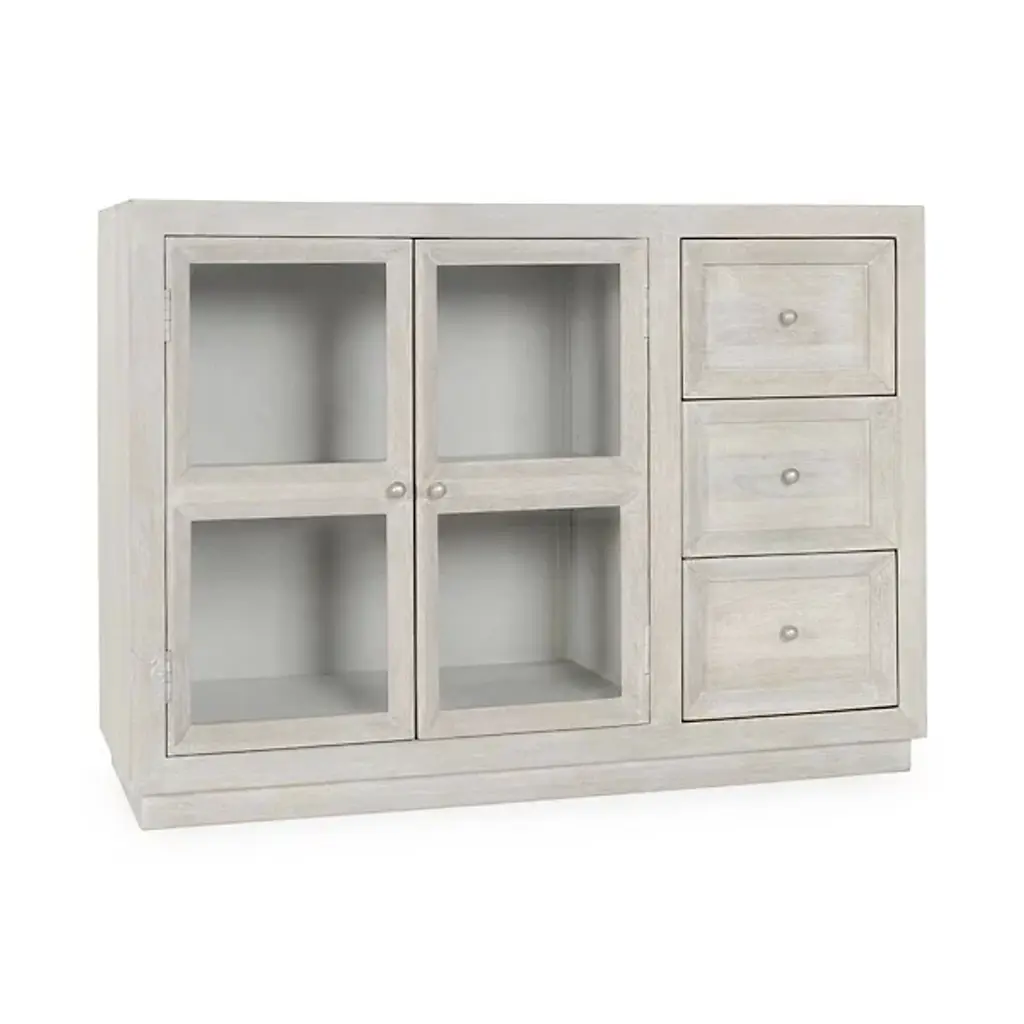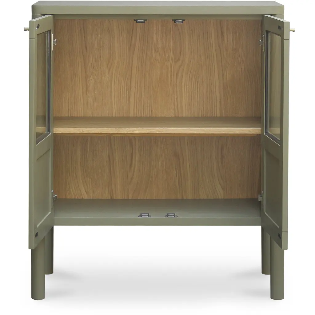 Thoughtfully designed, the Hannah cabinet balances transparency and concealment with tempered glass inserts. Crafted from solid pine, dowel legs and understated bronze hardware add a subtle softness, while the versatile finish complements diverse interior styles.