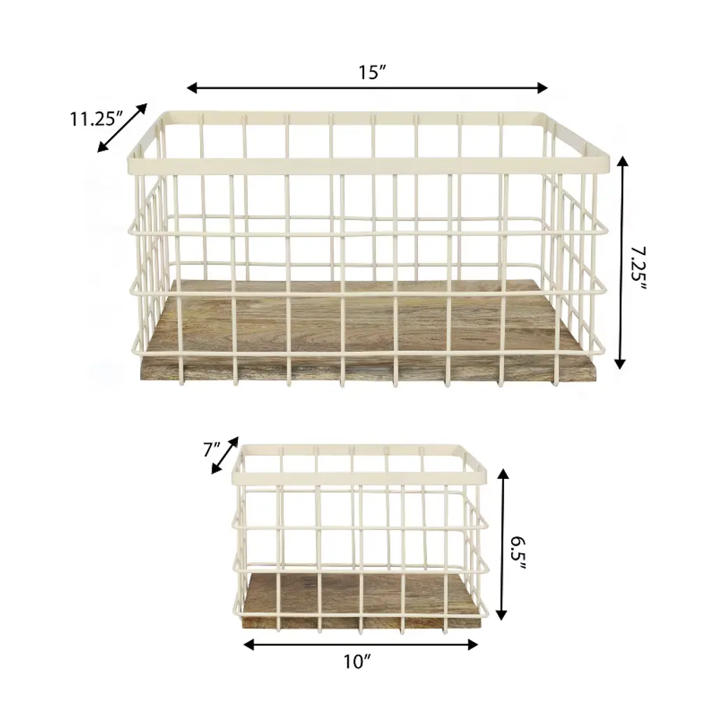 Vintage style metal baskets are an ideal storage solution for home office, bathroom or kitchen shelves. Set includes three baskets designed to fit perfectly in a cabinet or on open shelving. Durable design features metal wires with wooden bottoms for a farmhouse look