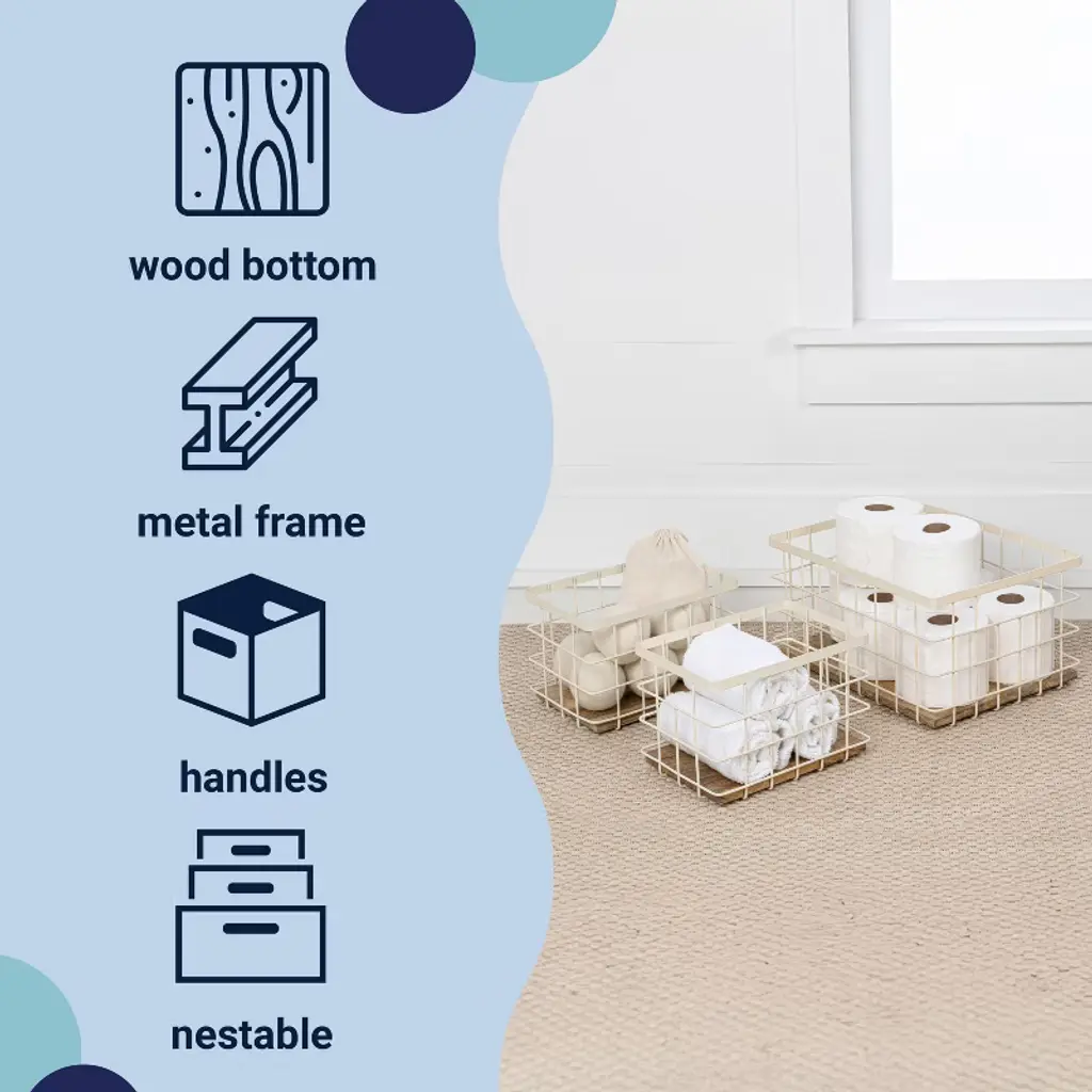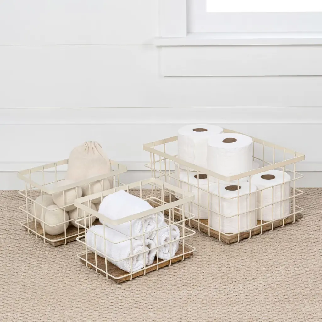 Happimess Evvie Vintage Farmhouse Handmade Wire Metal Nesting Storage Baskets With Wood Base, Almond/natural (Set Of 3)
