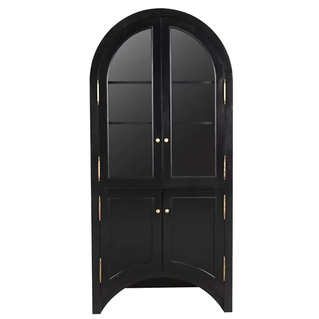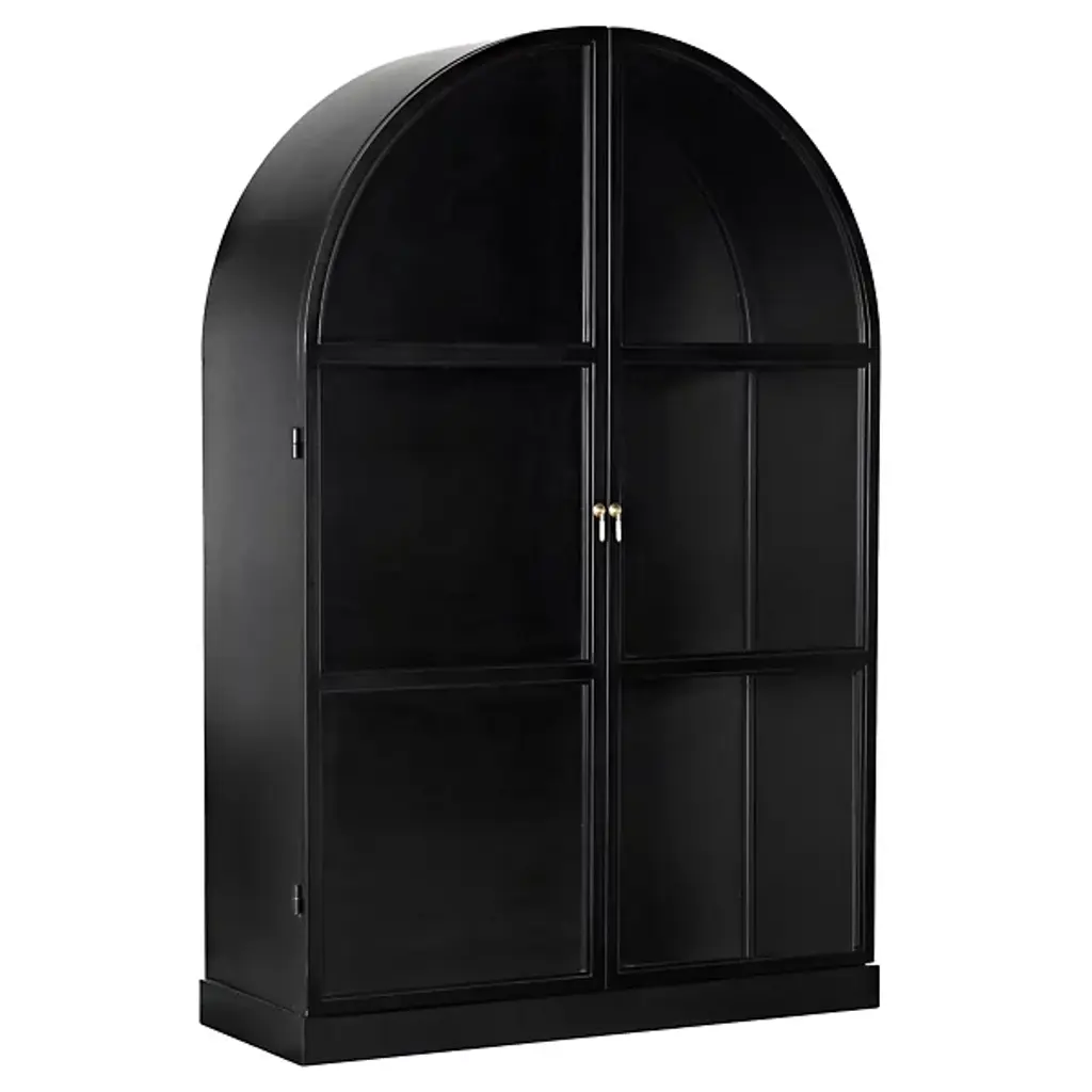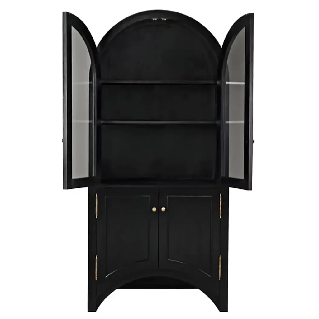 The Haring Hutch from Noir presents a dramatic arched silhouette that commands attention through its cathedral-inspired form. The hand-rubbed black finish creates depth across the mahogany construction, while brass pulls provide warm metallic accents against the dark surface. Glass-front upper doors reveal interior shelving, balanced by solid lower cabinet doors that maintain the piece's architectural presence. The arched crown and substantial base give this storage piece a monumental quality that updates functional furniture into a design statement.