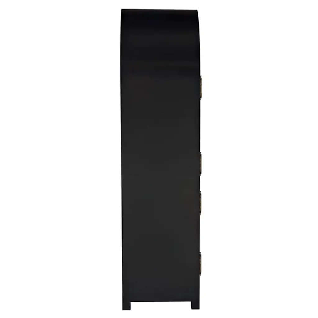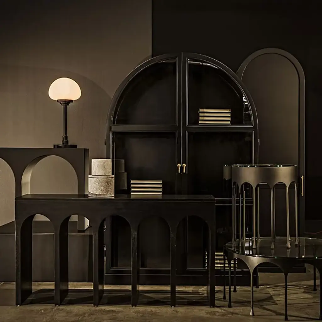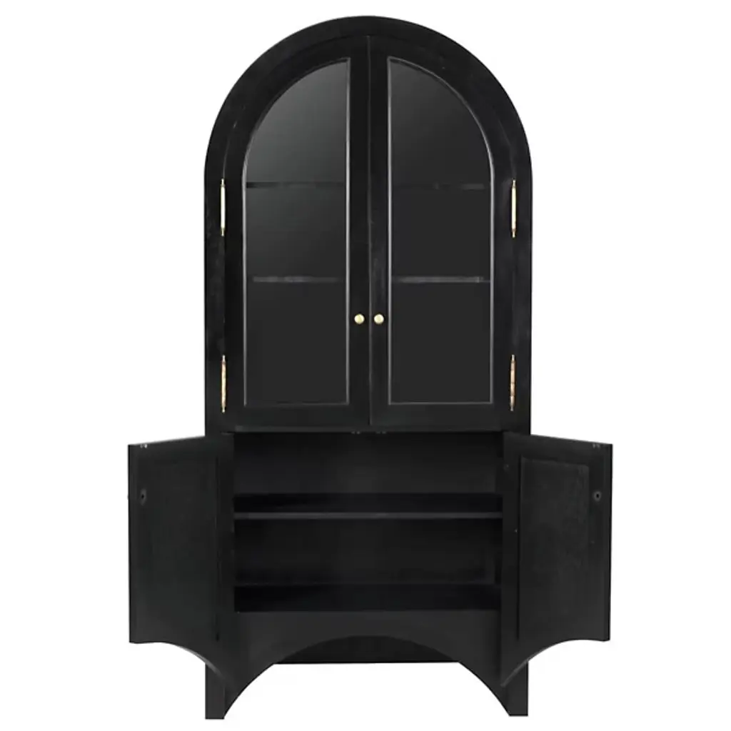 The Haring Hutch from Noir presents a dramatic arched silhouette that commands attention through its cathedral-inspired form. The hand-rubbed black finish creates depth across the mahogany construction, while brass pulls provide warm metallic accents against the dark surface. Glass-front upper doors reveal interior shelving, balanced by solid lower cabinet doors that maintain the piece's architectural presence. The arched crown and substantial base give this storage piece a monumental quality that updates functional furniture into a design statement.