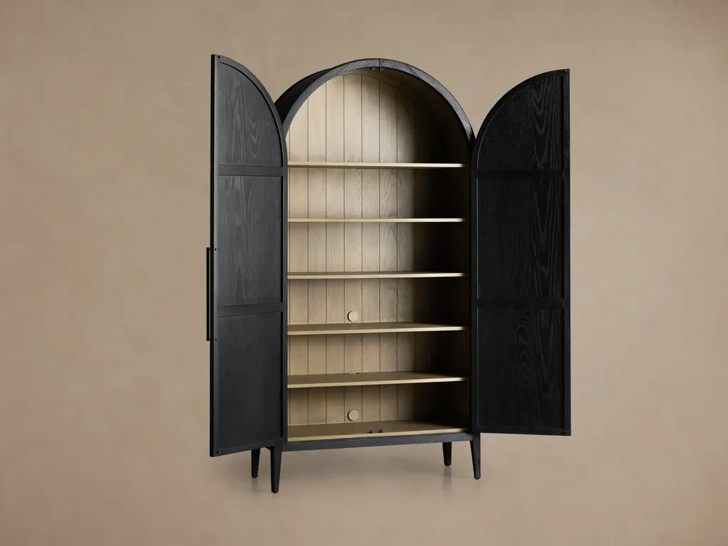 Where gentle curves meet the natural graining of oak, our artisan-crafted Hattie Collection awaits. Hattie’s generous shelves mean there’s always room to display favorite curiosities and everyday essentials.