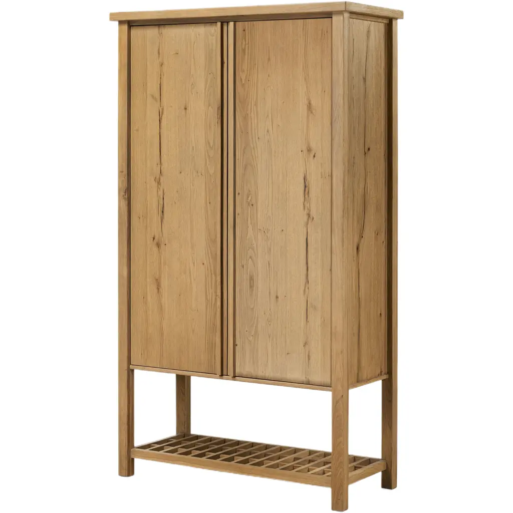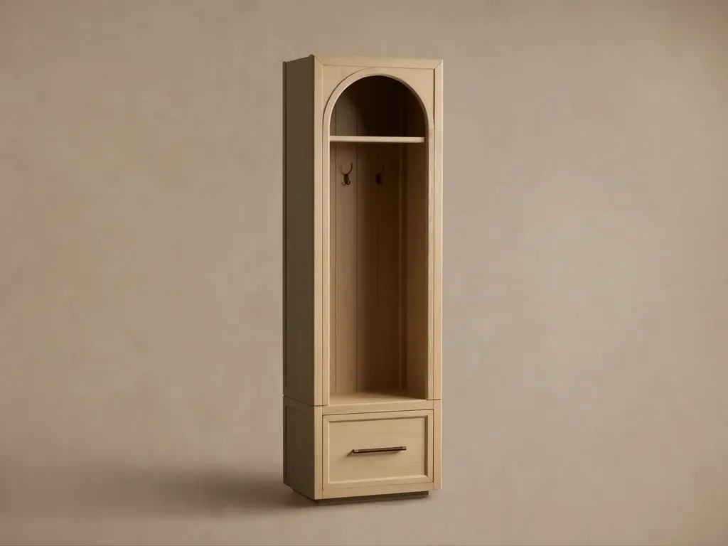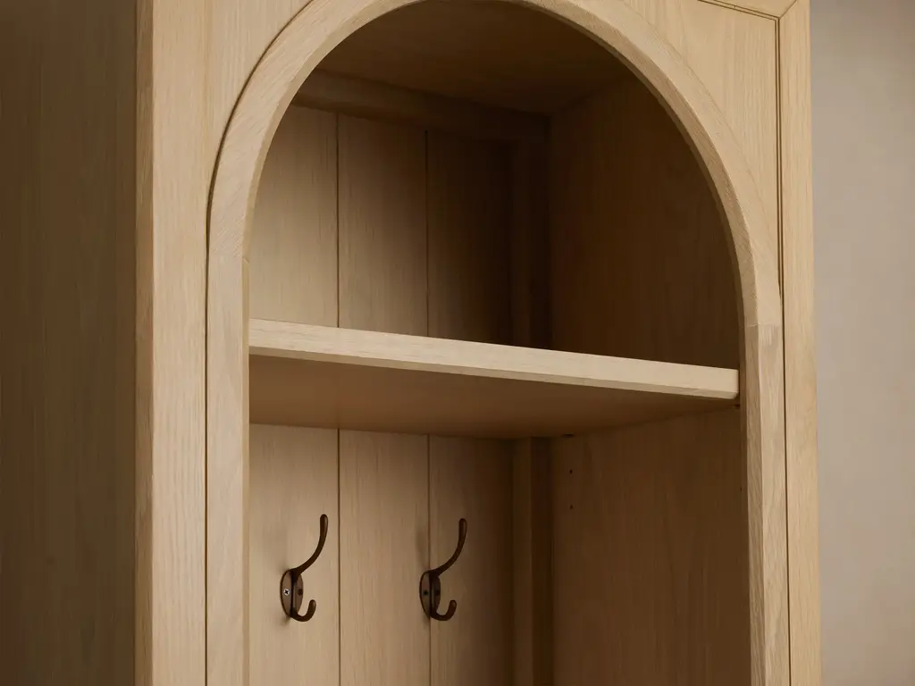 With open arches carved from oak wood, our Hattie Entryway Cabinet brings architectural beauty and a sense of calm to the rhythm of daily life. Hooks, shelves, and drawers offer intuitive storage for coats, bags, and essentials, thoughtfully designed in sizes suited to both compact and expansive entryways.