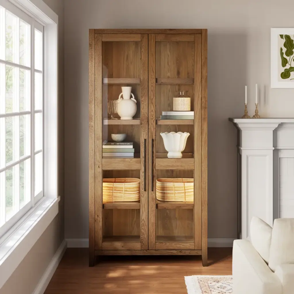 The Sienna Display Cabinet is a sophisticated and functional storage solution. Its adjustable glass shelves and sleek metal pulls create a modern aesthetic. The light wood finish with dark graining adds a touch of natural elegance, making it a captivating addition to any living room or dining room.